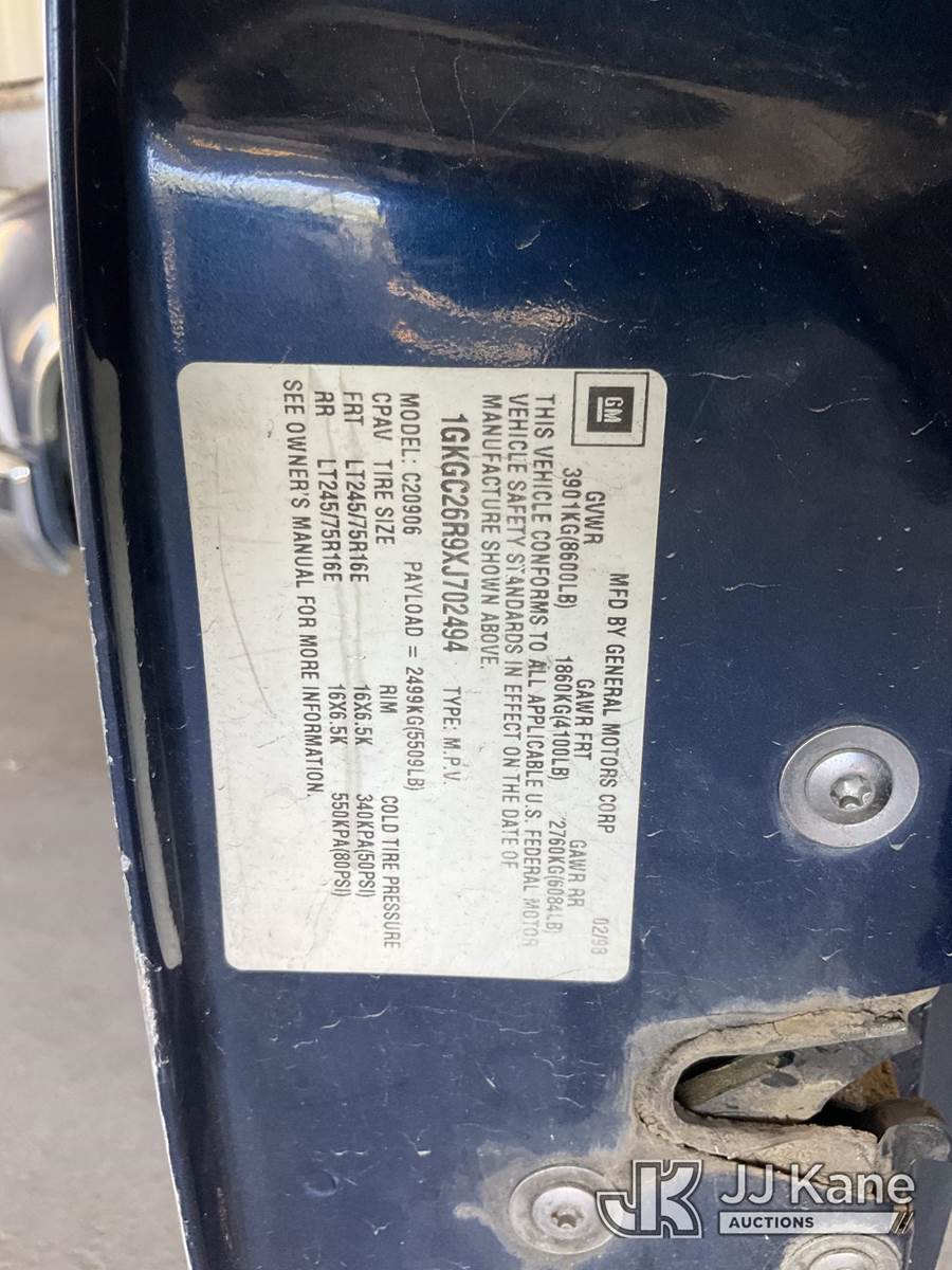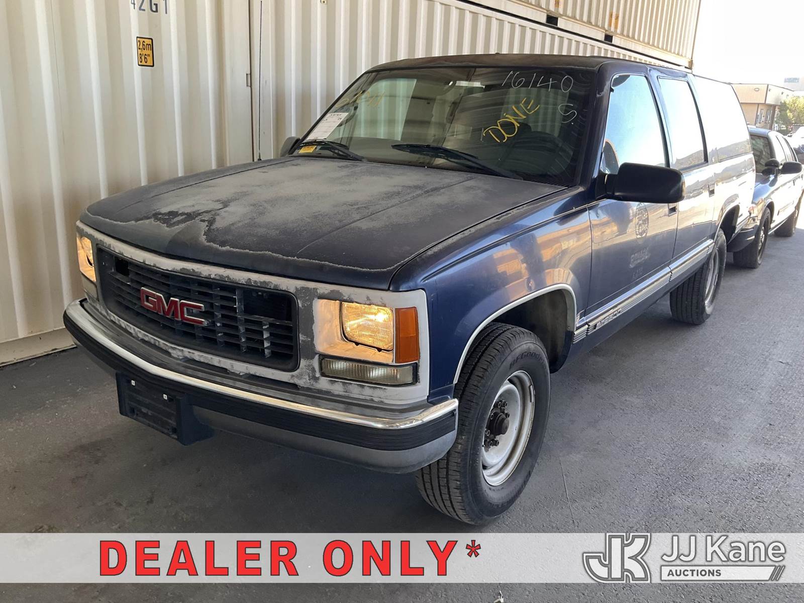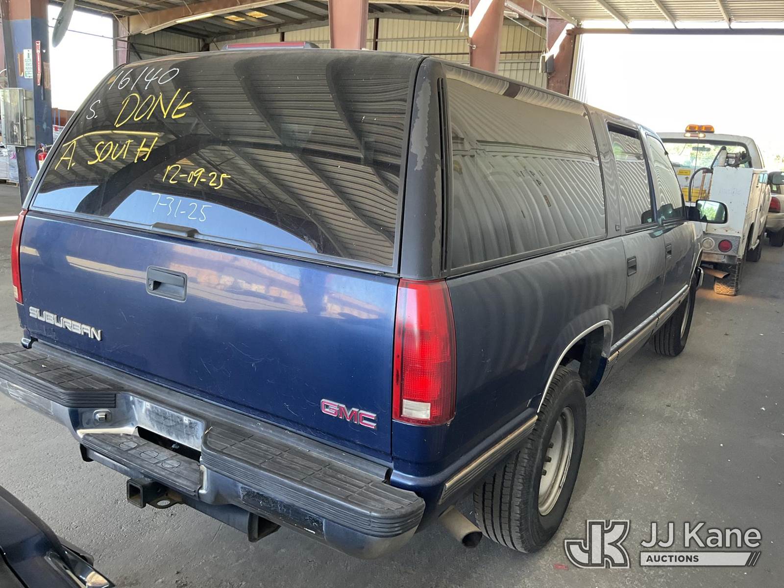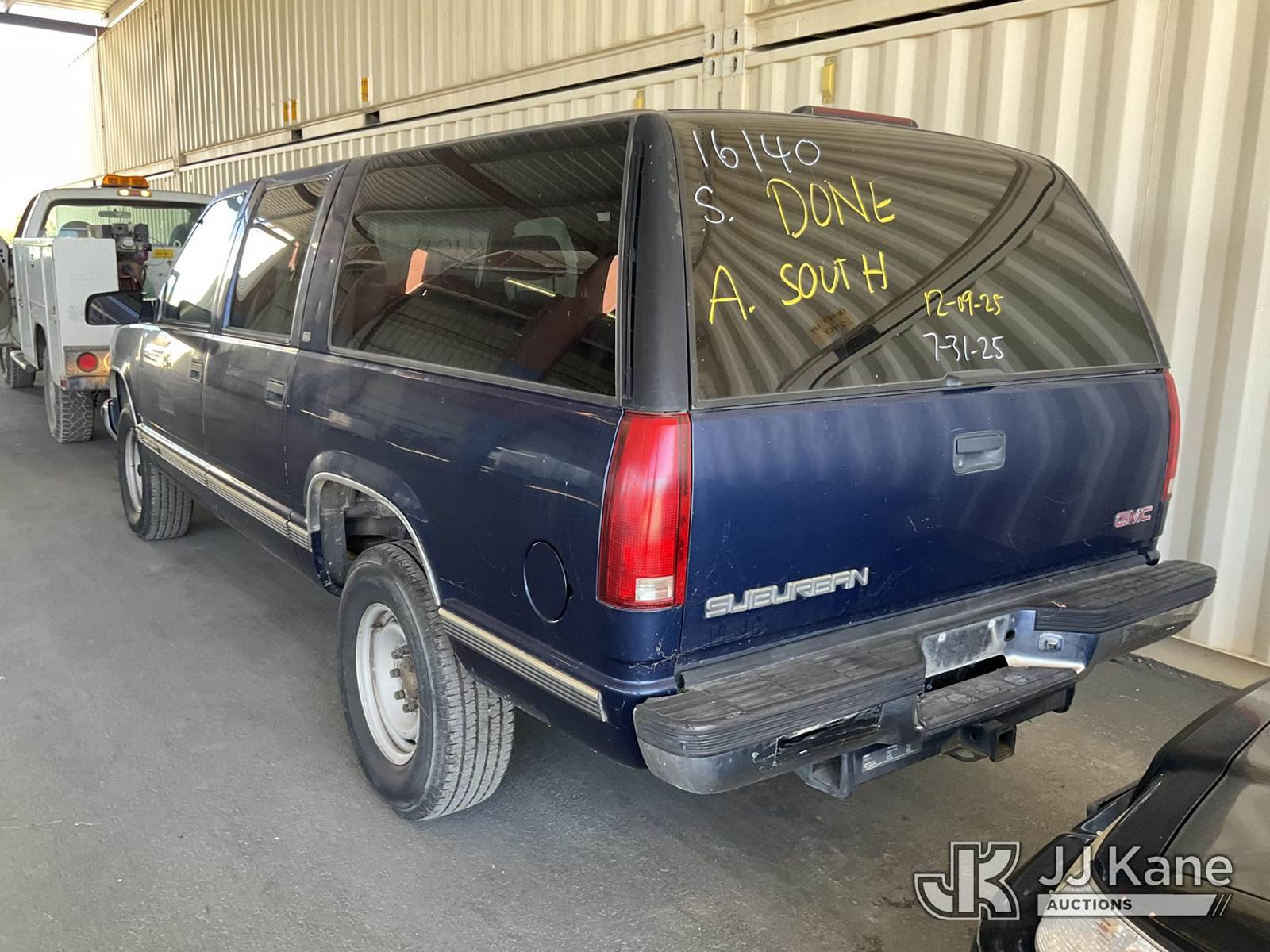 1999 GMC Suburban 2500 4-Door Sport Utility Vehicle, s/n 1GKGC26R9XJ702494, 8-cyl gas, 4-Speed Automatic, A/C, with Tow package, (Exempt from Odometer Disclosure - Reads 116,928 miles) (Runs & Moves) (Missing Seatbelt Buckle, Broken/Missing Side Mirrors) (Bidding Restricted to Licensed Vehicle Dealers Only), This is a Titled Item NOTE: This unit is being sold AS IS/WHERE IS via Timed Auction and is located in Jurupa Valley, CA. Inspection & preview days for this unit are the 2 business days prior to the first day of items closing for this auction, item is located at 4510 Muth Way Jurupa Valley, CA 92509 and hours of operations are 8a-4p. For pre-sale questions, please contact please contact Office Staff @ (310) 353-7140. Dealer License Number 45696. (Buyer is responsible for removal. Assistance by consignor or JJ Kane Auctions is not assured.)