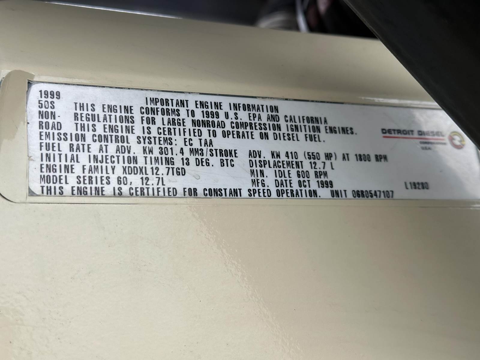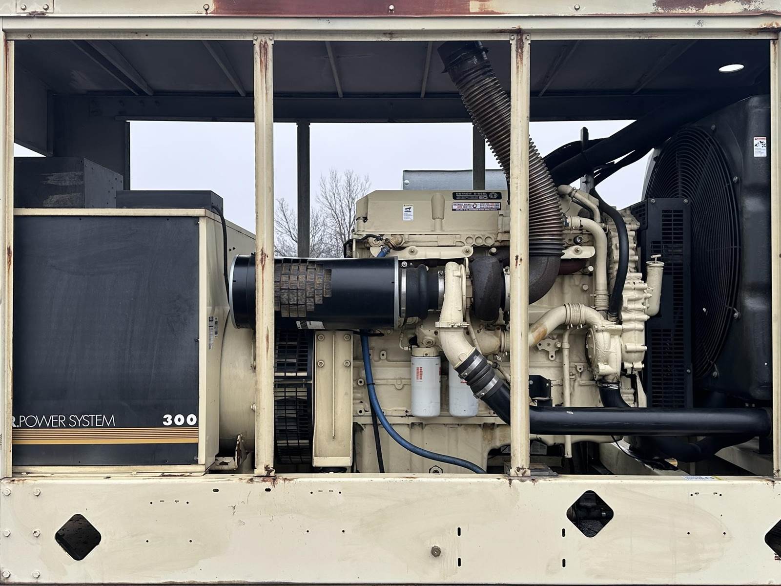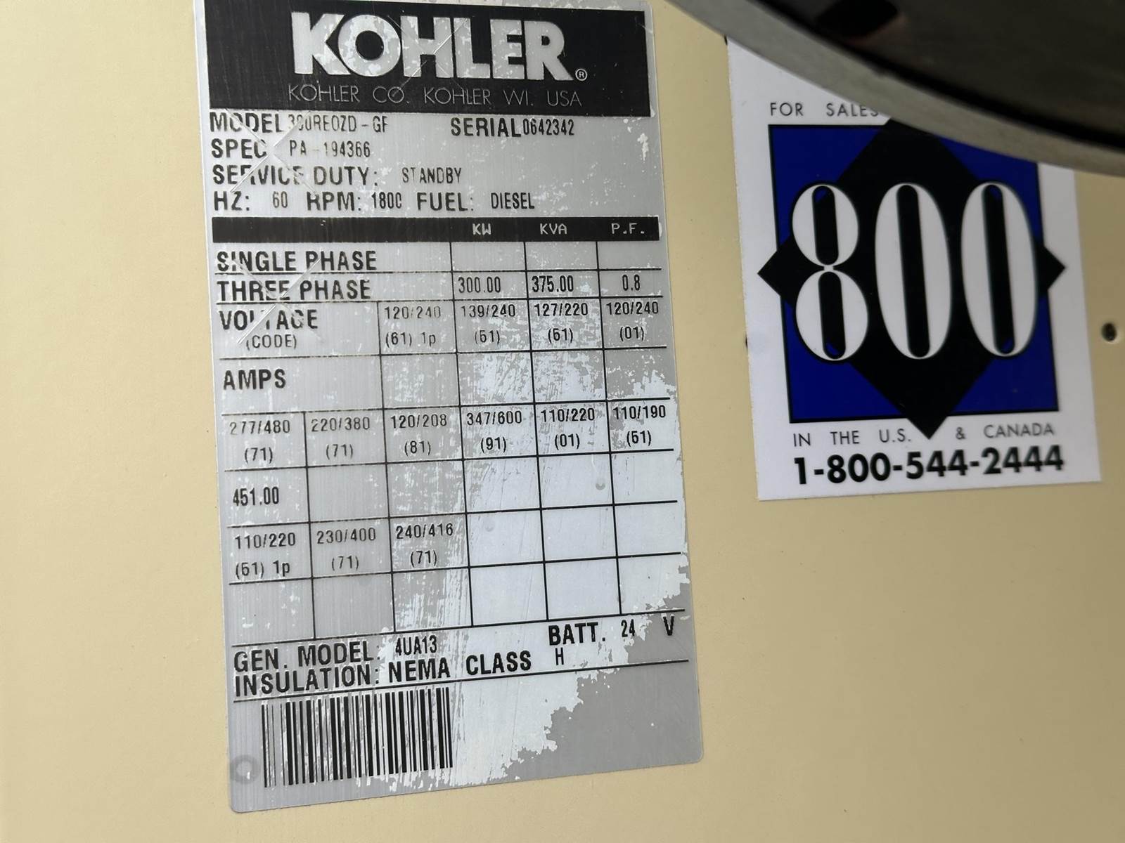Kohler 300 kW standby (270 kW prime) diesel generator set, model 300REOZD, SN-0642342. Detroit Diesel series 60 14L engine rated 490 HP at 1800 RPM, SN-06R0547107. 3/60/277/480V, 12 lead reconnectable to other voltages. 400 Amp main-line circuit breaker. PMG - permanent magnet generator. Decision Maker 3+ 16 light control panel. Coolant heater. Weather enclosure. 525 gallon UL listed sub-base fuel tank with secondary containment. 1094 Hrs. Year 1999. Load test pending. Overall dimensions 52W x 135L x 117H on 6H blocks. 11,000 lbs, muffler ships loose 40W x 48 x 40H, 500 lbs. on pallet. FOB Waukesha, WI