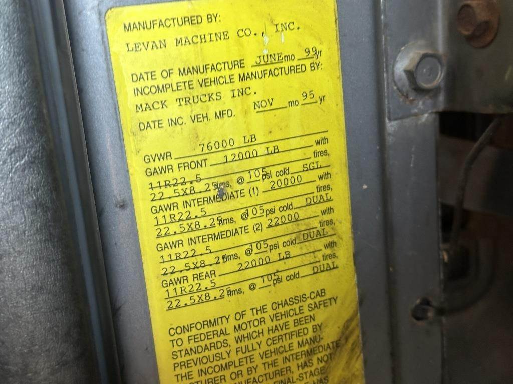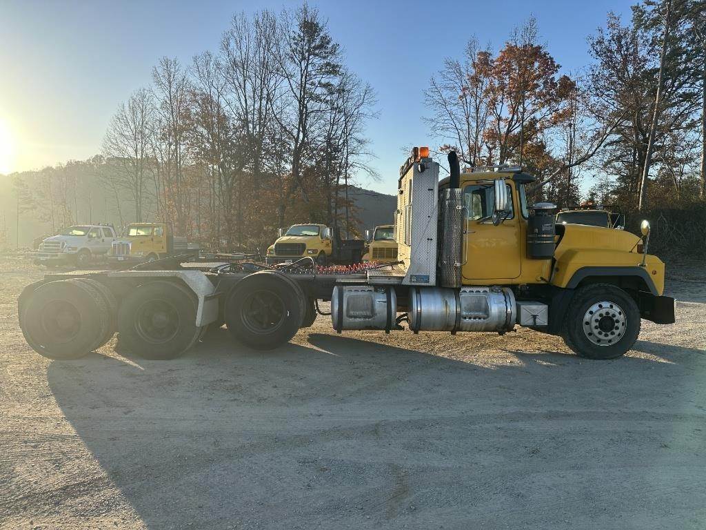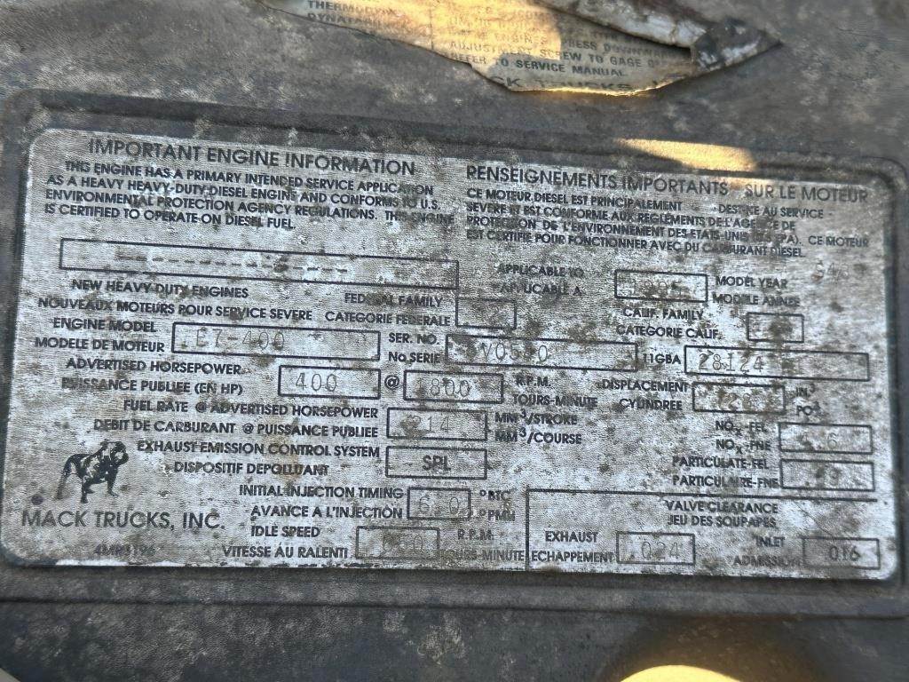 Location: Athens, TN Mack E7 6 Cylinder Turbo Diesel Engine, Eaton Fuller 8LL Manual Transmission, GVWR: 76000LB, 12000LB Front Axle, Camelback Suspension, Air Lift Axle, PTO, Wet Kit, Engine Brake, Air Release Fifth Wheel Slide, Double Frame, Aluminum Headache Rack, Storage Box, Heat, A/C, Radio, Air Ride Seat, Cruise Control, 11R22.5 Tires VIN: 1M2P270Y8TM027883 Miles Shown: 486980