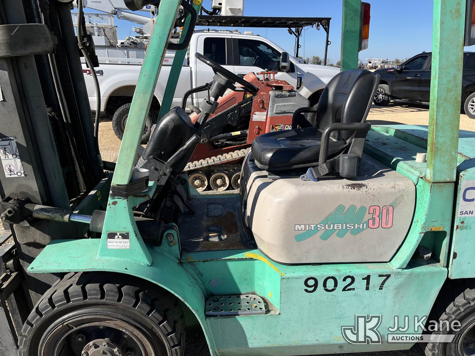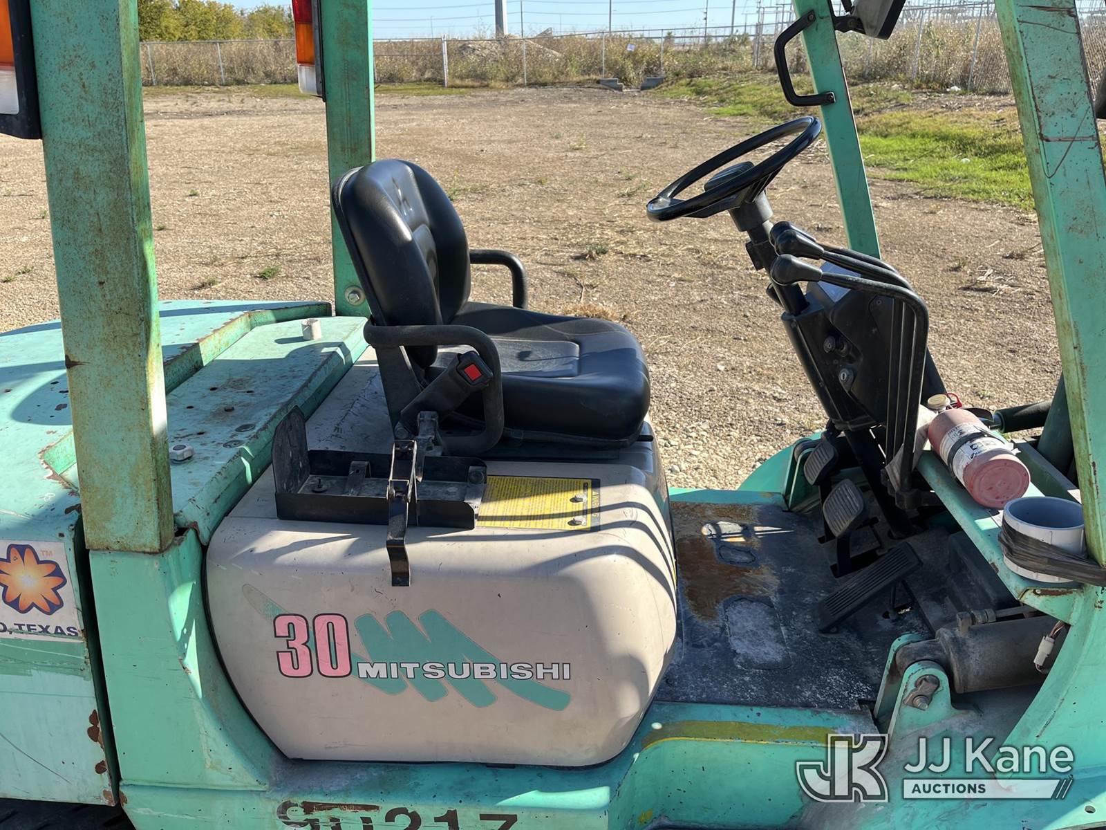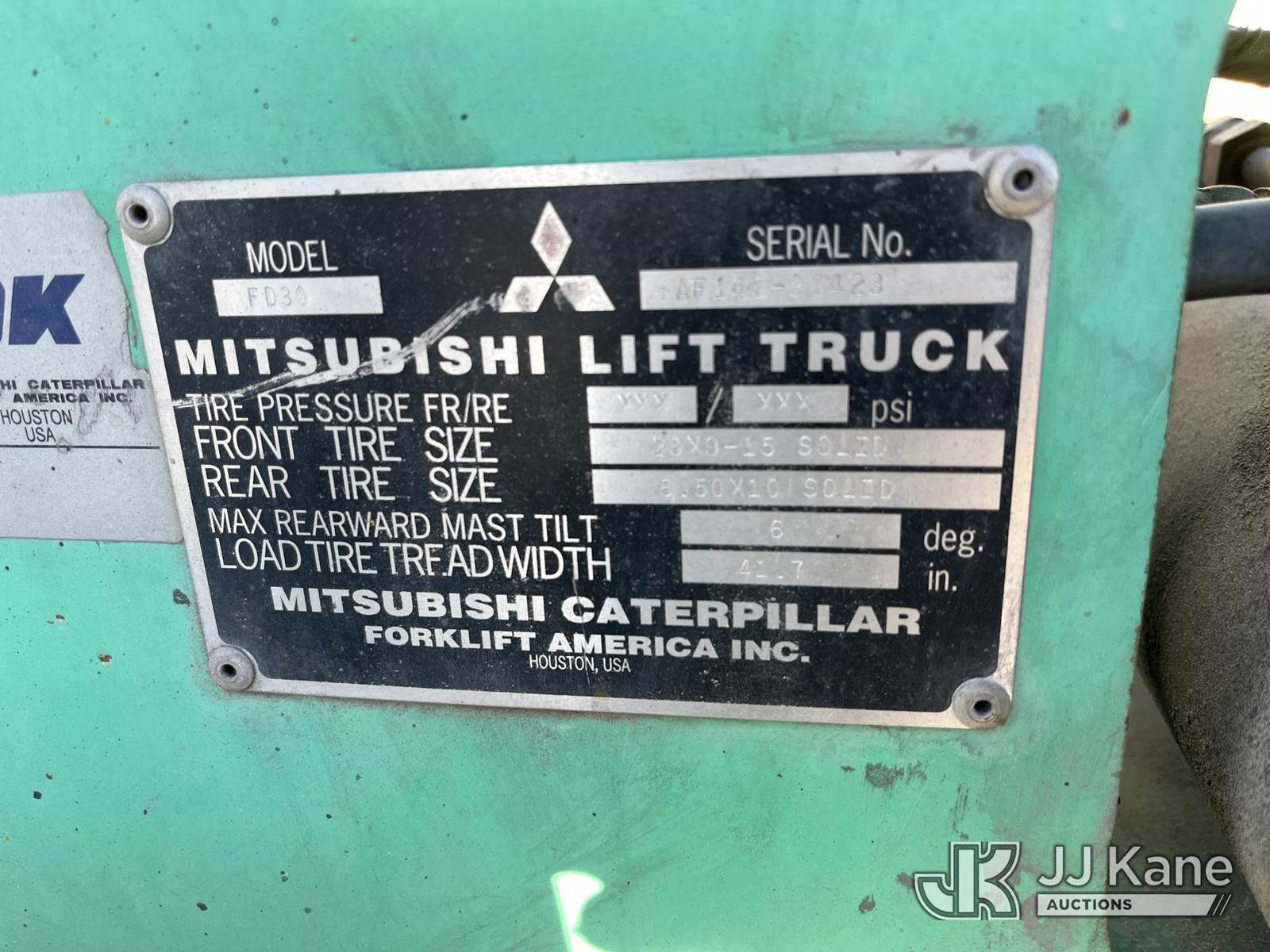 1999 Mitsubishi FD30B-D Pneumatic Tired Forklift, s/n AF14C30423, Shuttle, diesel, with 5,800 lb. lift capacity, 186 in. mast height & ROPS, (Not Running, Condition Unknown) (Reads 4,045 hours) NOTE: This unit is being sold AS IS/WHERE IS via Timed Auction and is located in Marion, TX. Inspection & preview days for this unit are the 2 business days prior to the first day of items closing for this auction, item is located at 3292 S Santa Clara Rd Marion, TX 78124 and hours of operations are 8a-4p. For pre-sale questions, please contact Brian Jarrell @ 210-540-3147. (Buyer is responsible for removal. Assistance by consignor or JJ Kane Auctioneers is not assured.)