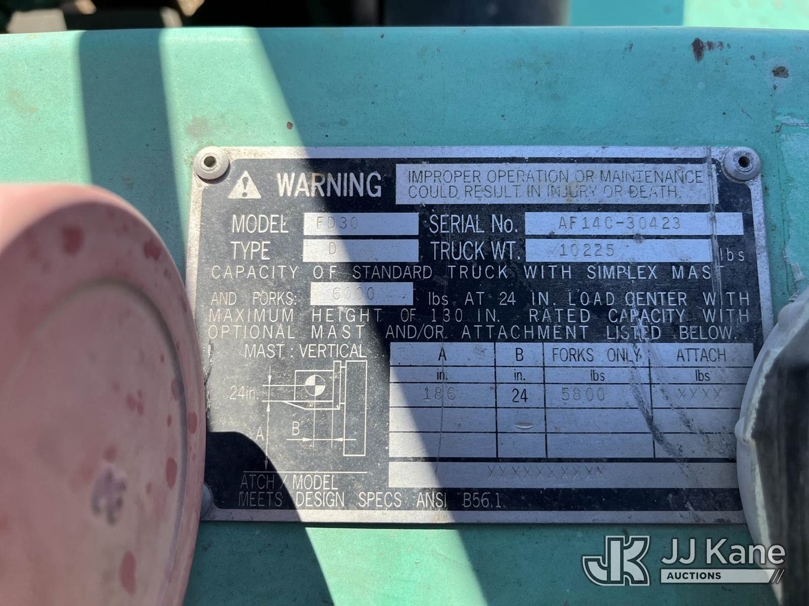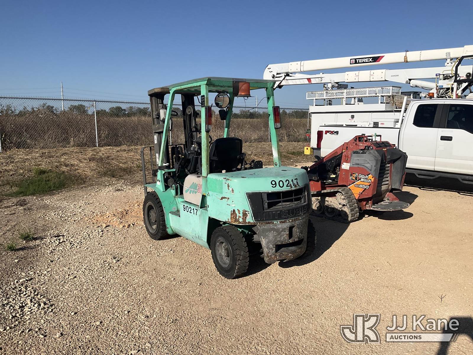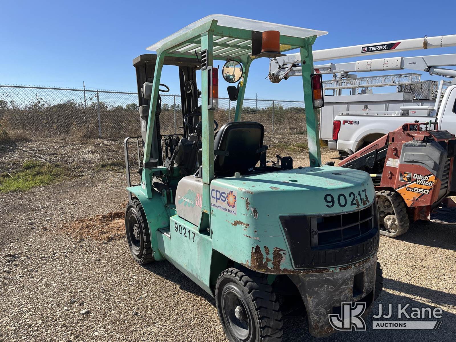 1999 Mitsubishi FD30B-D Pneumatic Tired Forklift, s/n AF14C30423, Shuttle, diesel, with 5,800 lb. lift capacity, 186 in. mast height & ROPS, (Not Running, Condition Unknown) (Reads 4,045 hours) NOTE: This unit is being sold AS IS/WHERE IS via Timed Auction and is located in Marion, TX. Inspection & preview days for this unit are the 2 business days prior to the first day of items closing for this auction, item is located at 3292 S Santa Clara Rd Marion, TX 78124 and hours of operations are 8a-4p. For pre-sale questions, please contact Brian Jarrell @ 210-540-3147. (Buyer is responsible for removal. Assistance by consignor or JJ Kane Auctioneers is not assured.)
