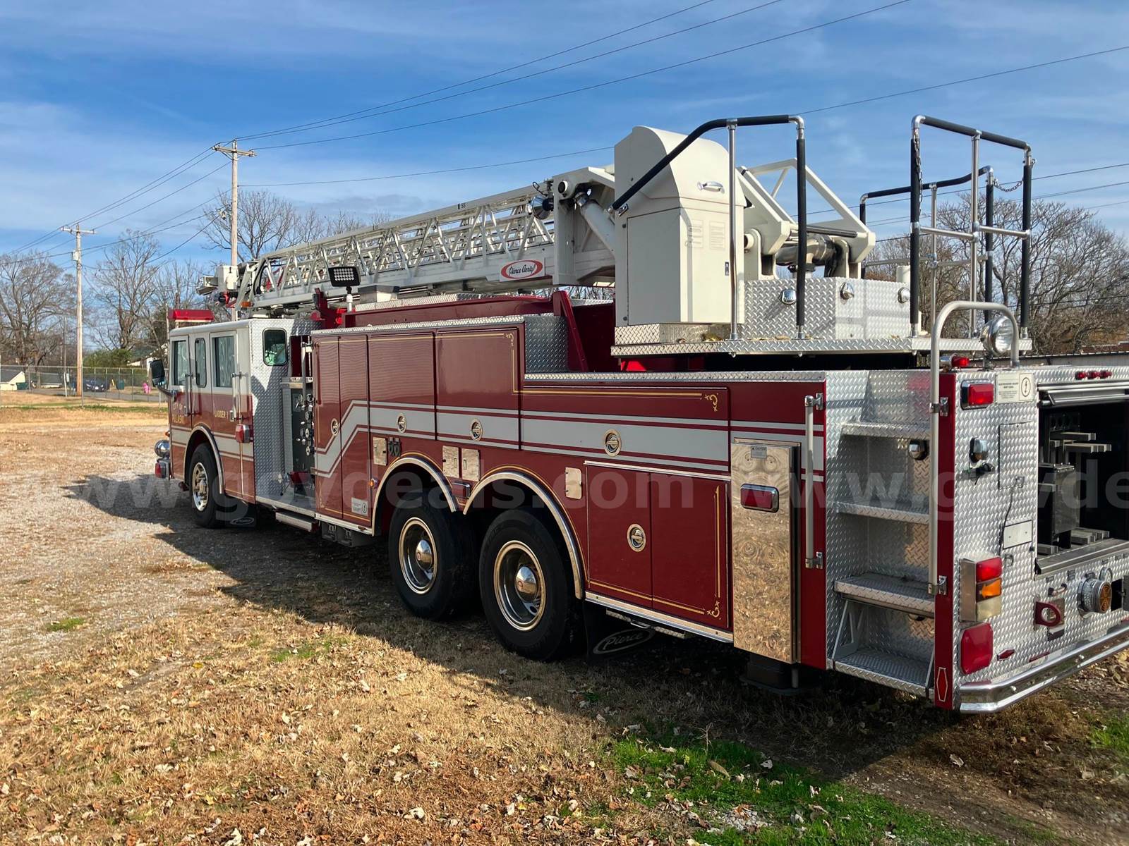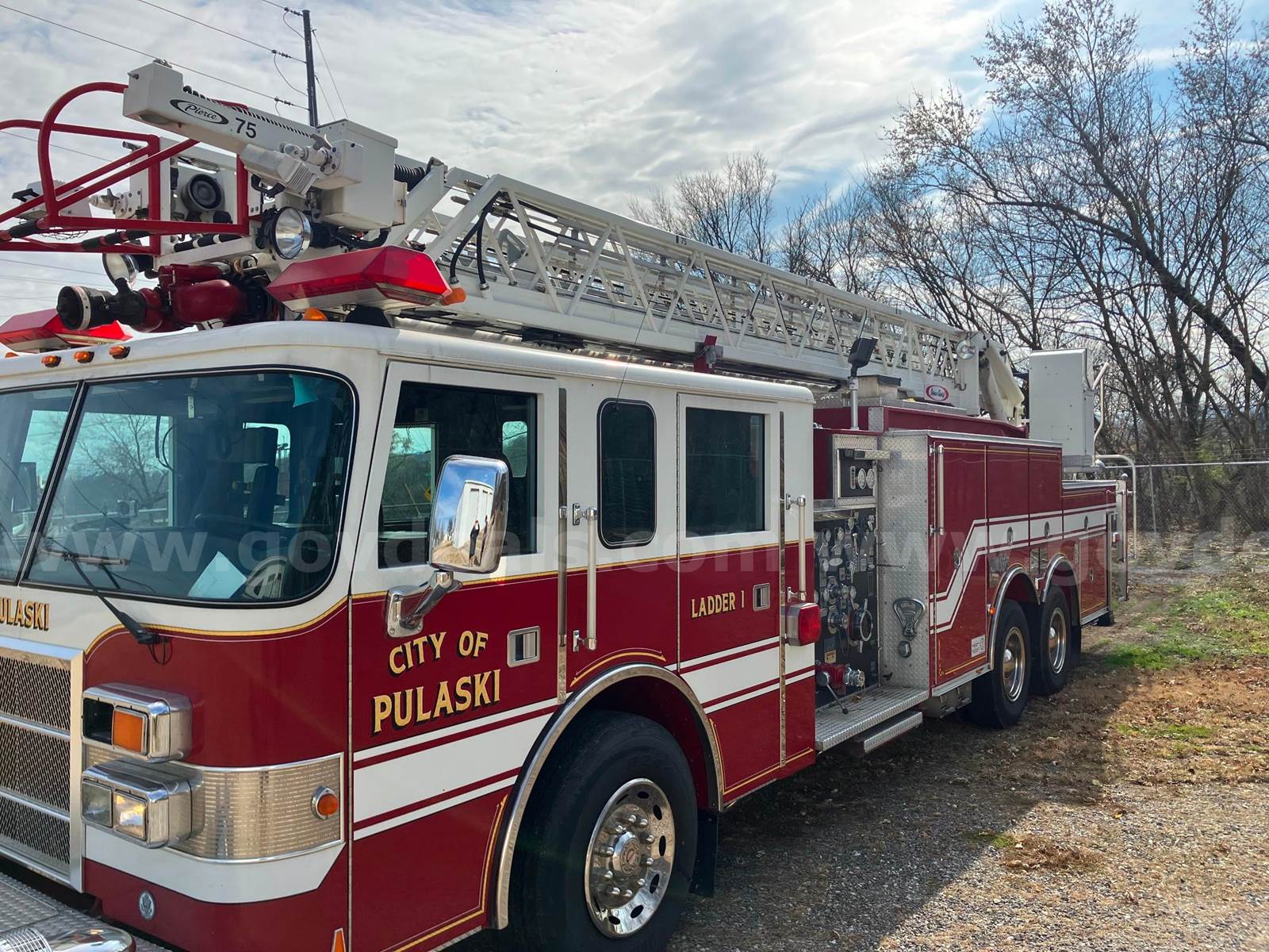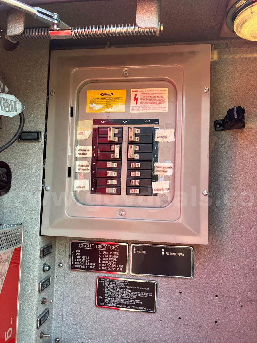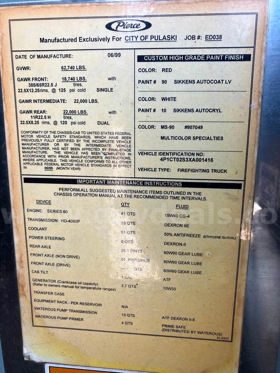 1999 Pierce Model Tilt Cab FIRE TRUCK, 12.7L L6 DIESEL. 75’ Steel Ladder 1500 GPM Hale Pump 500 Gallon Poly tank On-board Generator – will start and run but not produce power Detroit Engine, Allison Transmission Engine has an oil leak and runs but smokes Transmission has a fluid leak Pump does work but will not communicate with transmission, computer system will need to be upgraded to fix Misc lights missing Ground Ladders will be removed before sale All ladder hydraulic cylinders were rebuilt in Spring 2023 Passed Pump and Aerial testing in 2024, not tested in 2025 due to replacement Paint is faded, does have scratches and a few dents Interior is good shape, driver seat is worn, has 5 SCBA seats with brackets Tires in decent shape
