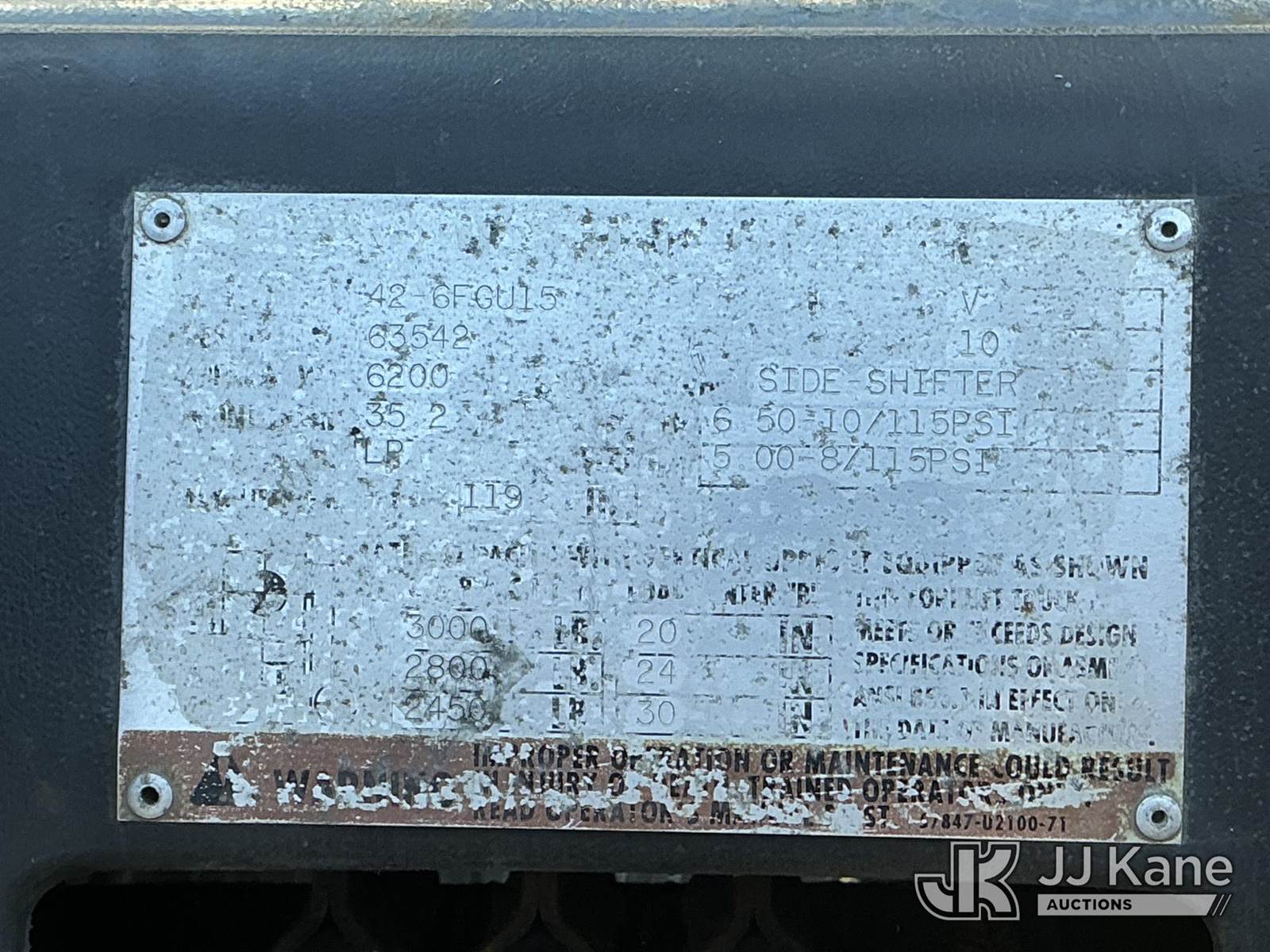 1999 Toyota 6FGU15 Rubber Tired Forklift, s/n 63542, Shuttle, LPG, with ROPS, (Not Running, Condition Unknown) NOTE: This unit is being sold AS IS/WHERE IS via Timed Auction and is located in Dixon, CA. Inspection & preview days for this unit are the 2 business days prior to the first day of items closing for this auction, item is located at 8668 Sparling Ln Dixon, CA 95620 and hours of operations are 8a-4p. For pre-sale questions, please contact JJ Kane Staff at (707) 678-8060 (dixon@jjkane.com). Dealer License Number 45696. (Buyer is responsible for removal. Assistance by consignor or JJ Kane Auctions is not assured.)