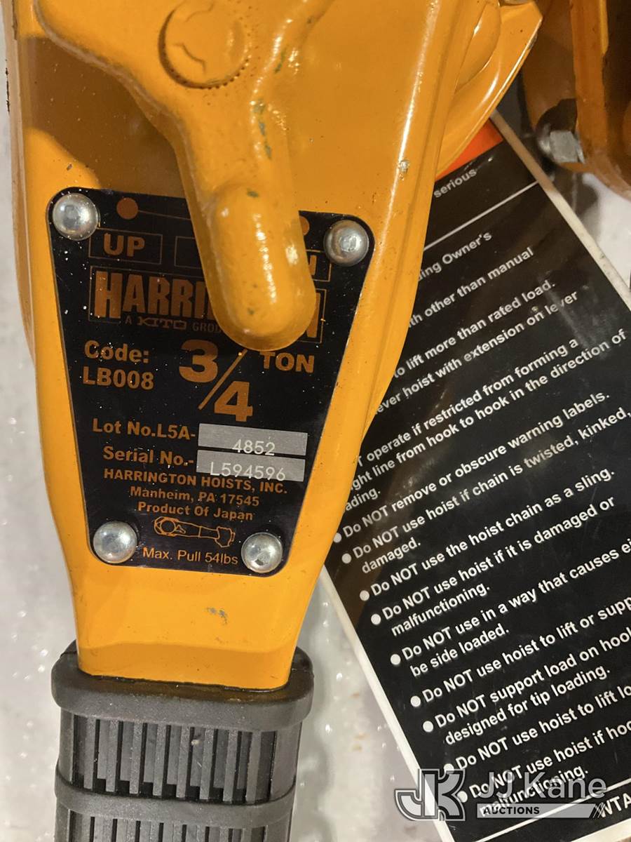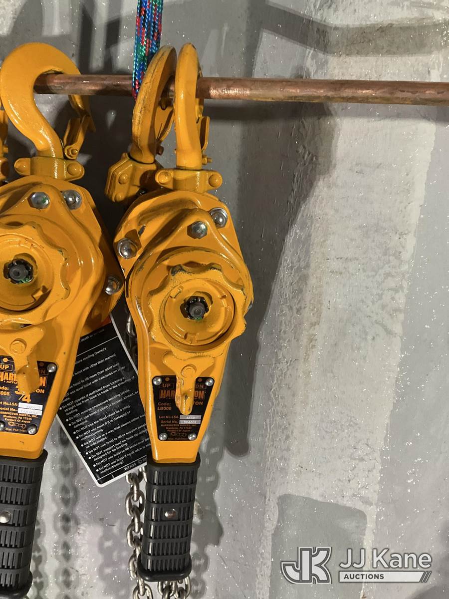 (2) Harrington 3/4 Ton Lever Chain Hoists NOTE: This unit is being sold AS IS/WHERE IS via Timed Auction and is located in Rome, NY. Inspection & preview days for this unit are the 2 business days prior to the first day of items closing for this auction, item is located at 5835 Success Dr Rome, NY 13440 and hours of operations are 8a-4p. For pre-sale questions, please contact Ryan Jackson @ (315) 749-3790 or Ryan.Jackson@jjkane.com. (Buyer is responsible for removal. Assistance by consignor or JJ Kane Auctions is not assured.)