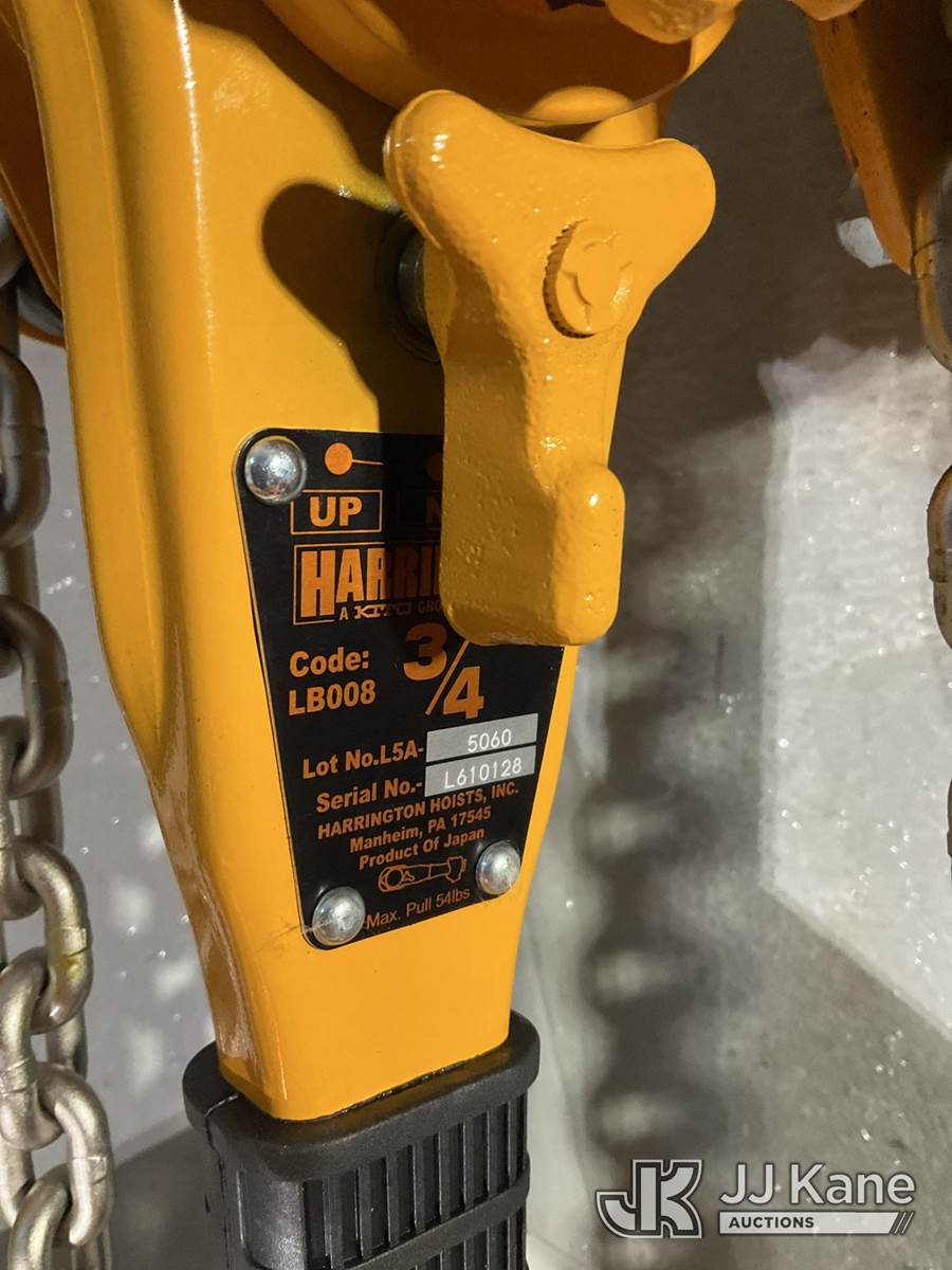 (2) Harrington 3/4 Ton Lever Chain Hoists NOTE: This unit is being sold AS IS/WHERE IS via Timed Auction and is located in Rome, NY. Inspection & preview days for this unit are the 2 business days prior to the first day of items closing for this auction, item is located at 5835 Success Dr Rome, NY 13440 and hours of operations are 8a-4p. For pre-sale questions, please contact Ryan Jackson @ (315) 749-3790 or Ryan.Jackson@jjkane.com. (Buyer is responsible for removal. Assistance by consignor or JJ Kane Auctions is not assured.)