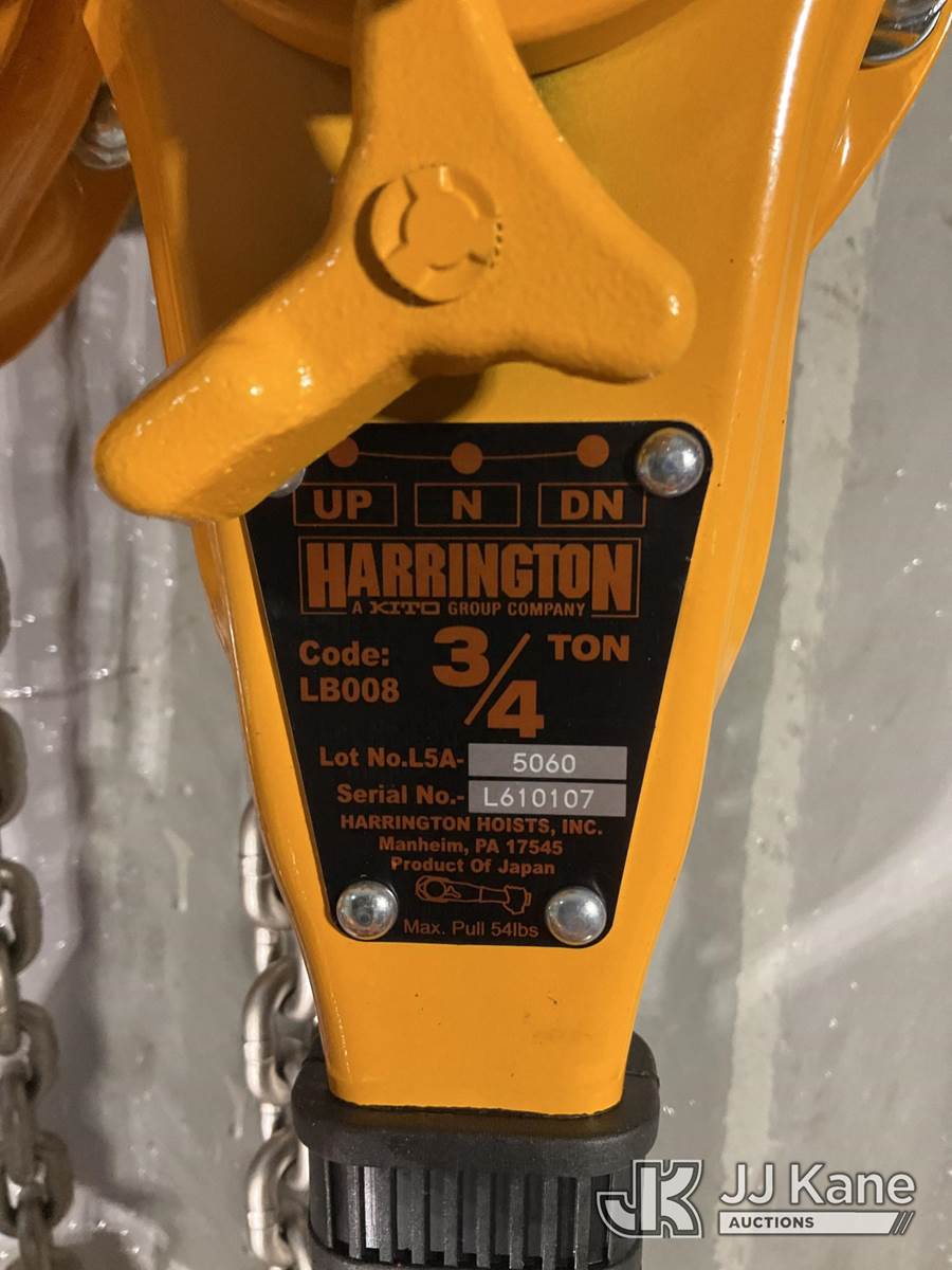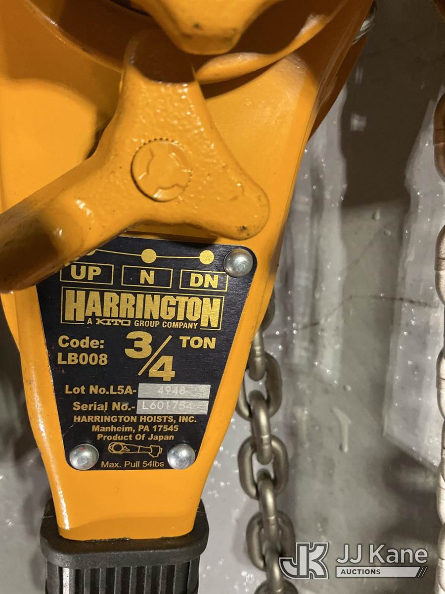 (2) Harrington 3/4 Ton Lever Chain Hoists NOTE: This unit is being sold AS IS/WHERE IS via Timed Auction and is located in Rome, NY. Inspection & preview days for this unit are the 2 business days prior to the first day of items closing for this auction, item is located at 5835 Success Dr Rome, NY 13440 and hours of operations are 8a-4p. For pre-sale questions, please contact Ryan Jackson @ (315) 749-3790 or Ryan.Jackson@jjkane.com. (Buyer is responsible for removal. Assistance by consignor or JJ Kane Auctions is not assured.)