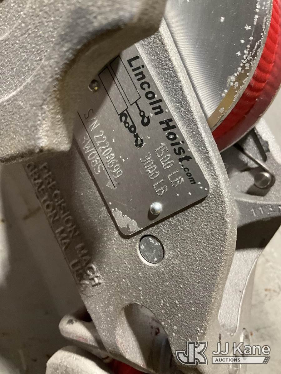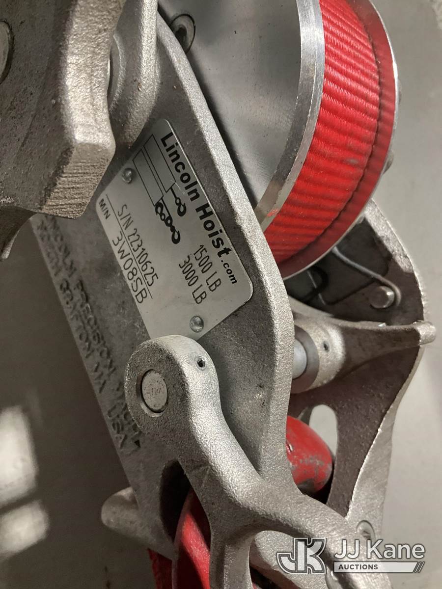 (2) Lincoln 3,000 LB Strap Hoists (Red) NOTE: This unit is being sold AS IS/WHERE IS via Timed Auction and is located in Rome, NY. Inspection & preview days for this unit are the 2 business days prior to the first day of items closing for this auction, item is located at 5835 Success Dr Rome, NY 13440 and hours of operations are 8a-4p. For pre-sale questions, please contact Ryan Jackson @ (315) 749-3790 or Ryan.Jackson@jjkane.com. (Buyer is responsible for removal. Assistance by consignor or JJ Kane Auctions is not assured.)
