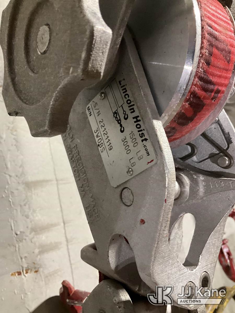(2) Lincoln 3,000 LB Strap Hoists (Red) NOTE: This unit is being sold AS IS/WHERE IS via Timed Auction and is located in Rome, NY. Inspection & preview days for this unit are the 2 business days prior to the first day of items closing for this auction, item is located at 5835 Success Dr Rome, NY 13440 and hours of operations are 8a-4p. For pre-sale questions, please contact Ryan Jackson @ (315) 749-3790 or Ryan.Jackson@jjkane.com. (Buyer is responsible for removal. Assistance by consignor or JJ Kane Auctions is not assured.)