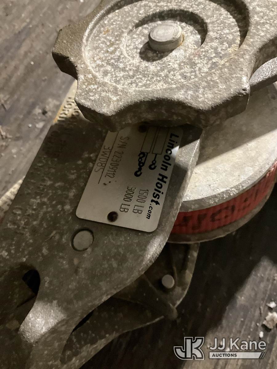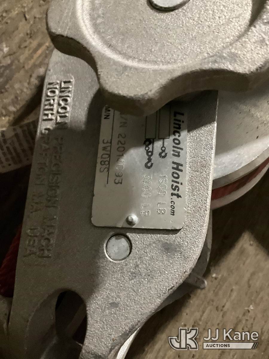 (2) Lincoln 3,000 LB Strap Hoists (Red) NOTE: This unit is being sold AS IS/WHERE IS via Timed Auction and is located in Rome, NY. Inspection & preview days for this unit are the 2 business days prior to the first day of items closing for this auction, item is located at 5835 Success Dr Rome, NY 13440 and hours of operations are 8a-4p. For pre-sale questions, please contact Ryan Jackson @ (315) 749-3790 or Ryan.Jackson@jjkane.com. (Buyer is responsible for removal. Assistance by consignor or JJ Kane Auctions is not assured.)