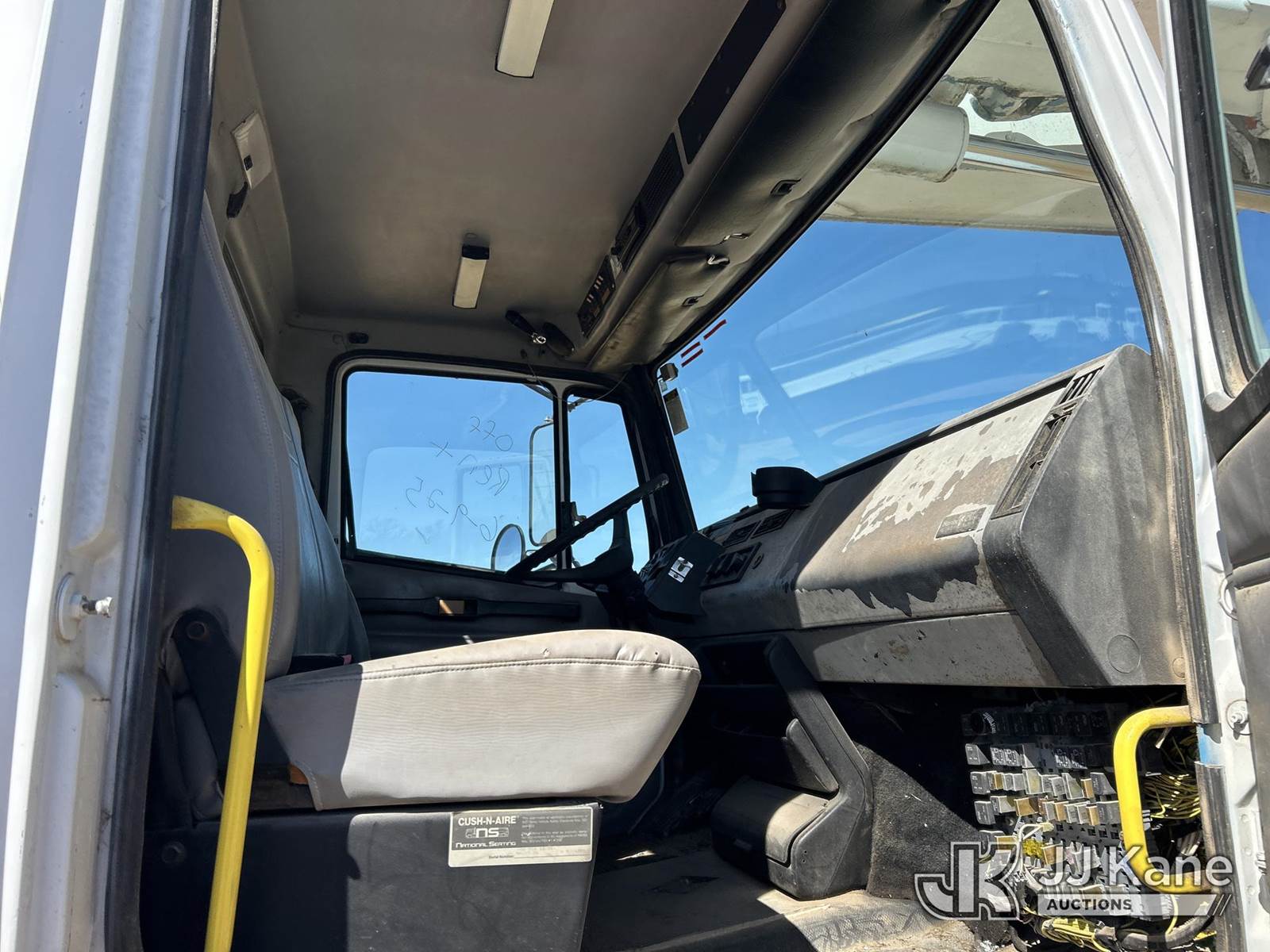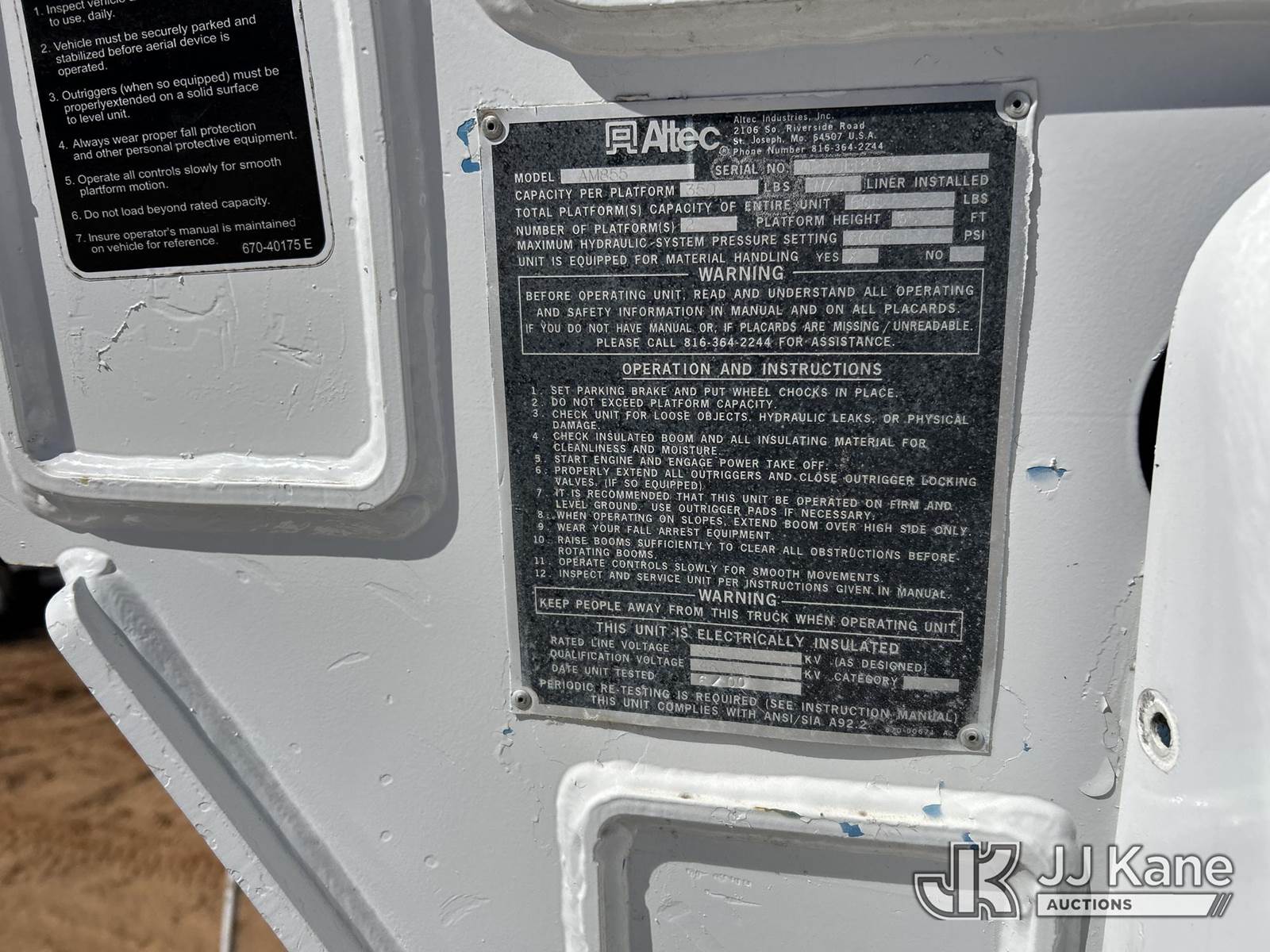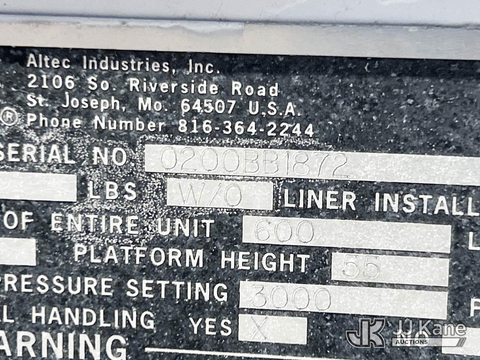 Altec AM855, 60 ft, Over-Center Material Handling Bucket Truck s/n 0200BB1872, with 4 hyd outriggers, rear mounted on 2000 Freightliner FL80 Utility Truck, 8.3L L6 DIESEL 4X4, Auto, (Exempt from Odometer Disclosure - Reads 102,163 miles) (**Dealer Only** Runs & Moves) (Seller states this unit was removed from service: Upper Condition Unknown, Outriggers Condition Unknown, Upper Damaged, Missing Bucket – Requires ANSI Inspection for repair/replacement requirements; Unit used for Non-Insulated Work - Requires Dielectric Testing to Certify Unit for Insulated Work) (Reads 9,285 hours) (Bidding Restricted to Licensed Vehicle Dealers Only), This is a Titled Item NOTE: This unit is being sold AS IS/WHERE IS via Timed Auction and is located in Stephenville, TX. For more information & removal arrangements please contact Matt Kaman @ 919-800-7863 (Missing manuals, See Auction Company for Manufacturers Information to obtain manuals) (Buyer is responsible for removal. Assistance by consignor or JJ Kane Auctions is not assured.)