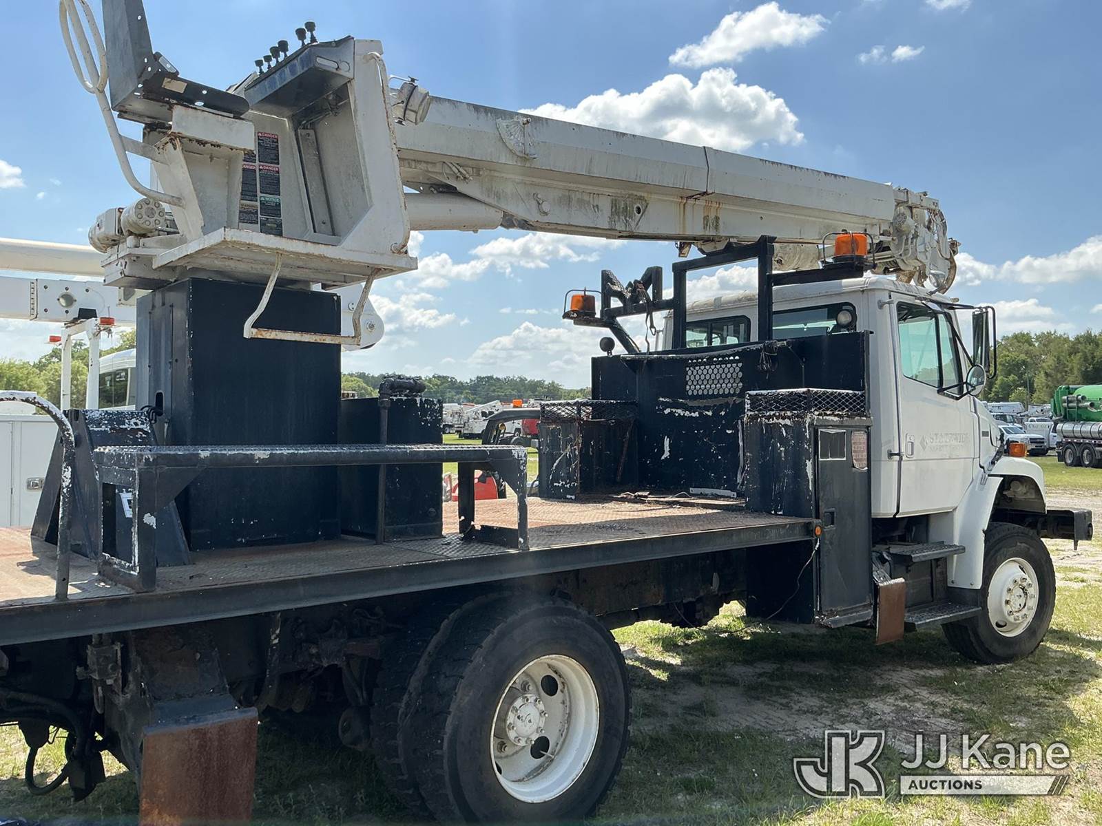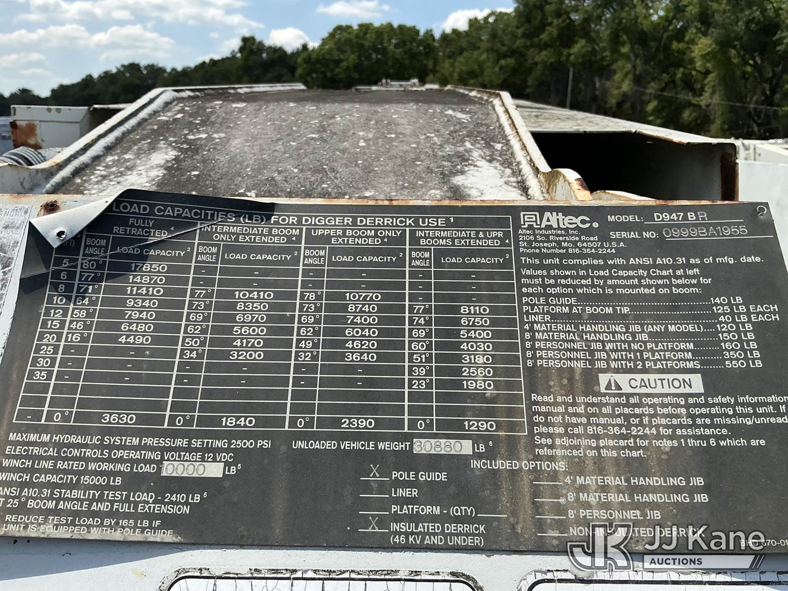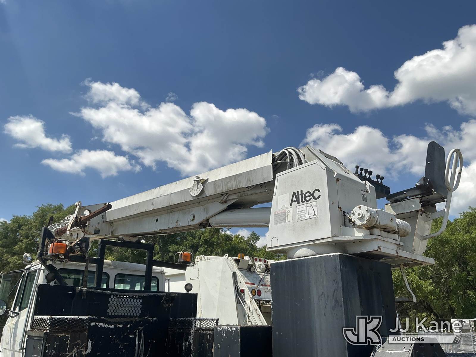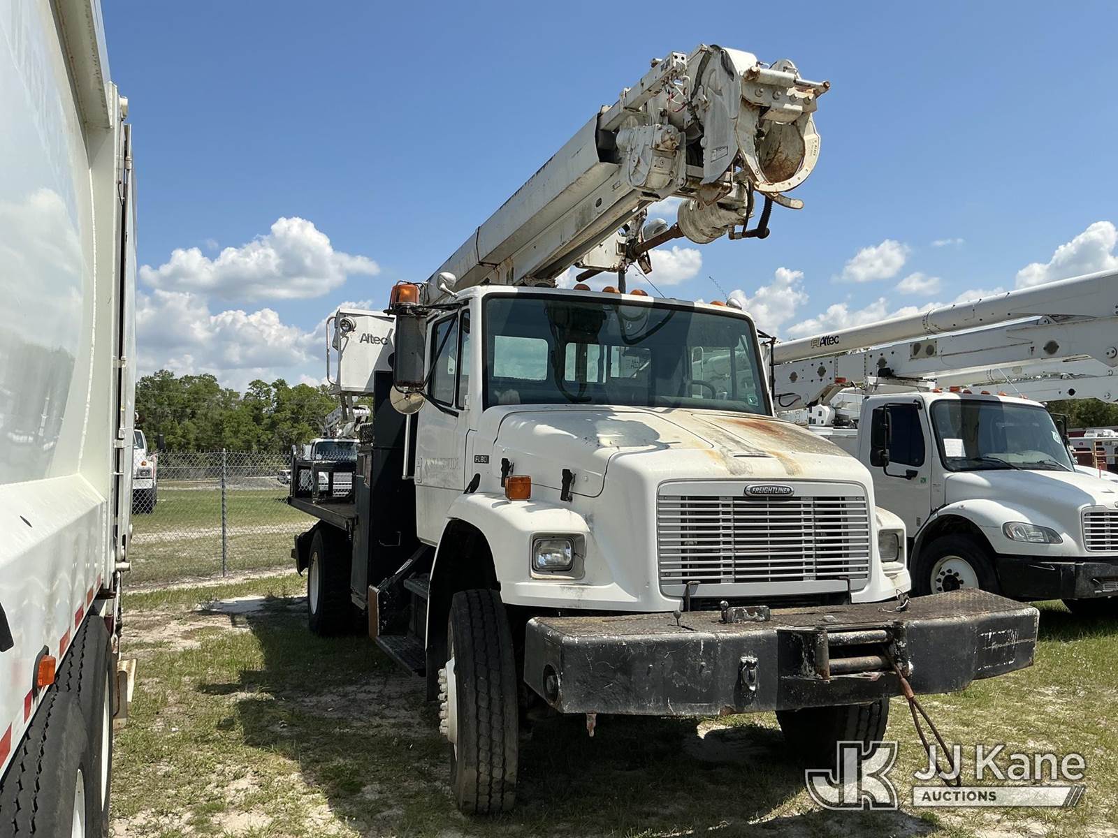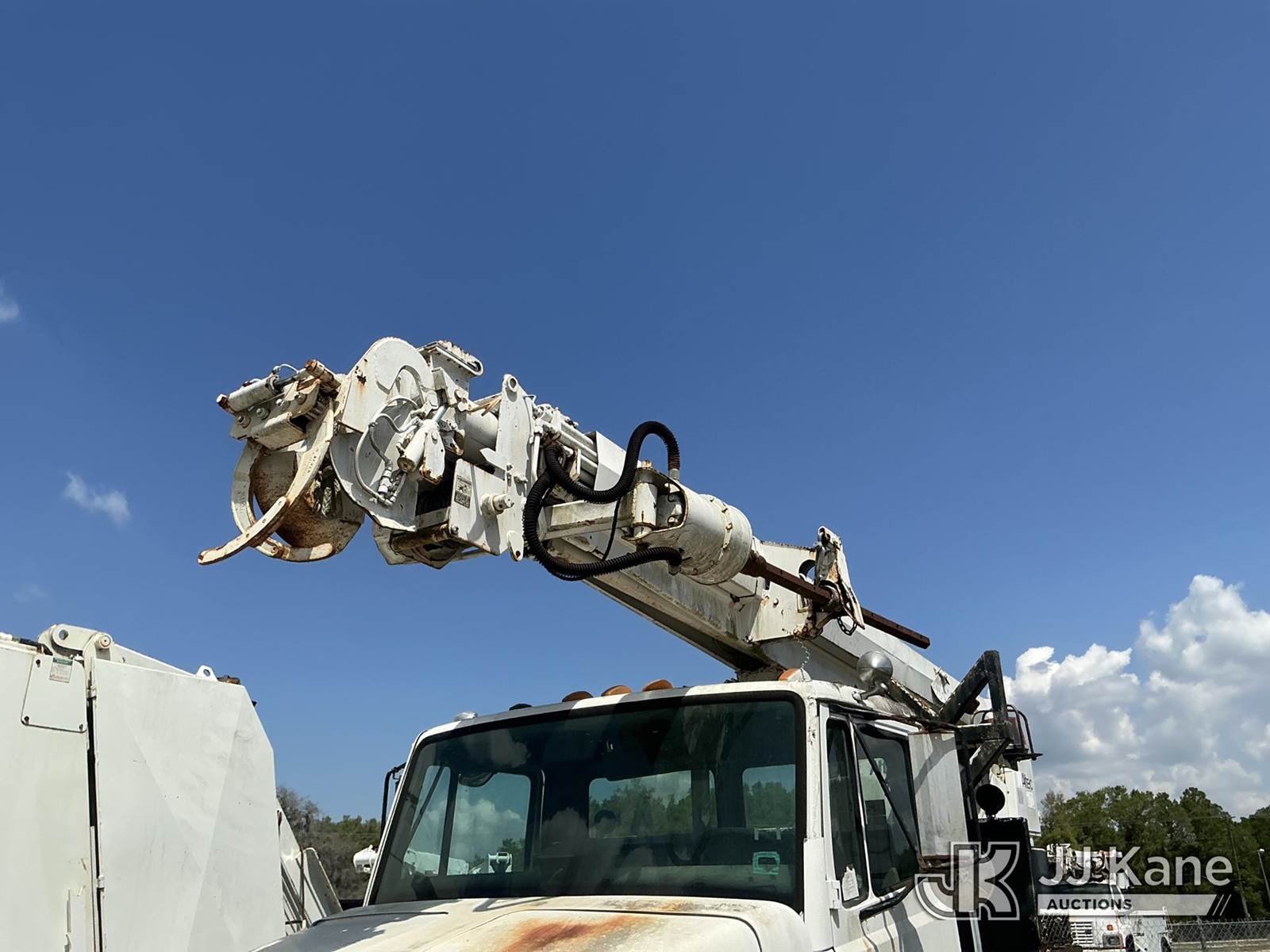 Altec D947-BR, 17,850 Lb Digger Derrick s/n 0999BA1955, with 47 ft sheave height, 2-spd digger, tip winch, pole grabs & riding console, rear mounted on 2000 Freightliner FL80 4x4 Flatbed/Utility Truck, Cat 3126 diesel, 7-spd, A/C, with front winch, (Exempt from Odometer Disclosure - Reads 113,777 miles) (Not Running, Condition Unknown) (Missing Auger, Rust/Mold Damage). The manufacturer has notified JJ Kane that this unit to has reached the End of Service life and it will not provide service for the unit. Parts and/ or technical support for the unit may be limited. Also, this equipment is subject to an open recall. 244D (CSN) Digger Hanger Bracket and Latch Inspection 246D (CSN) Turntable Tilt Procedure Correction The equipment should not be operated until this is addressed. Buyer is responsible for reviewing the recall notice and contacting the manufacturer to schedule the recommended corrective actions. Associated costs may be covered by the manufacturer in some cases. (FL Residents Purchasing Titled Items – tax, title & registration fees will be collected at the maximum rate of $400.00 under 25,999 and $800.00 for Over 26,000 and $250.00 trailers – Proof of insurance is mandatory; Out of State Residents Purchasing Title Items – tax will be collected based upon your state rate.)) This is a Titled Item NOTE: This unit is being sold AS IS/WHERE IS via Timed Auction and is located in Thonotosassa, FL. Inspection & preview days for this unit are the 2 business days prior to the first day of items closing for this auction, item is located at 11720 N US 301 Thonotosassa, Fl 33592 and hours of operations are 8a-4p. For pre-sale questions, please contact Office Staff @ (813) 986-2485. (Buyer is responsible for removal. Assistance by consignor or JJ Kane Auctions is not assured.)