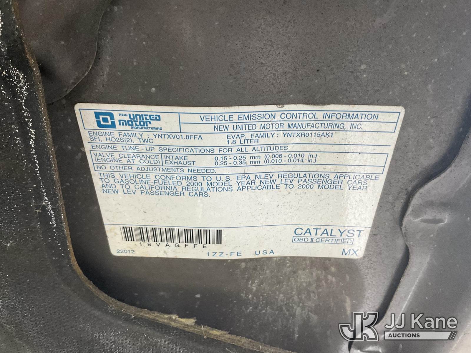 2000 Chevrolet Prizm 4-Door Sedan, 1.8L L4 DOHC 16V Gas FWD, A/C, (Exempt from Odometer Disclosure - Reads 171,378 miles) (Runs & Moves) (Engine Missing Parts) (Bidding Restricted to Licensed Vehicle Dealers Only), This is a Titled Item NOTE: This unit is being sold AS IS/WHERE IS via Timed Auction and is located in Dixon, CA. Inspection & preview days for this unit are the 2 business days prior to the first day of items closing for this auction, item is located at 8668 Sparling Ln Dixon, CA 95620 and hours of operations are 8a-4p. For pre-sale questions, please contact JJ Kane Staff at (707) 678-8060 (dixon@jjkane.com). Dealer License Number 45696. (Buyer is responsible for removal. Assistance by consignor or JJ Kane Auctioneers is not assured.)