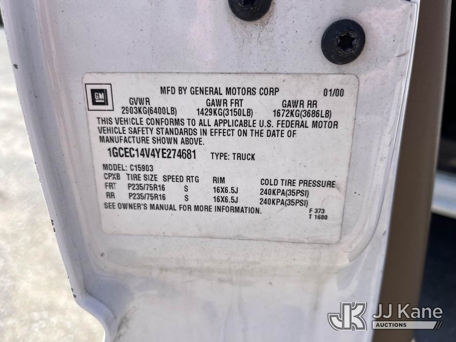 2000 Chevrolet Silverado 1500 Pickup Truck, 8-cyl gas, Auto, A/C, (Exempt from Odometer Disclosure - Reads 96,331 miles) Electric Cooperative Owned (Runs & Moves) This is a Titled Item NOTE: This unit is being sold AS IS/WHERE IS via Timed Auction and is located in Kingston Springs, TN. Inspection & preview days for this unit are by appointment only; please contact us at contact@jjkane.com or 84-Go-JJKane for more details. (Buyer is responsible for removal. Assistance by consignor or JJ Kane Auctioneers is not assured.)