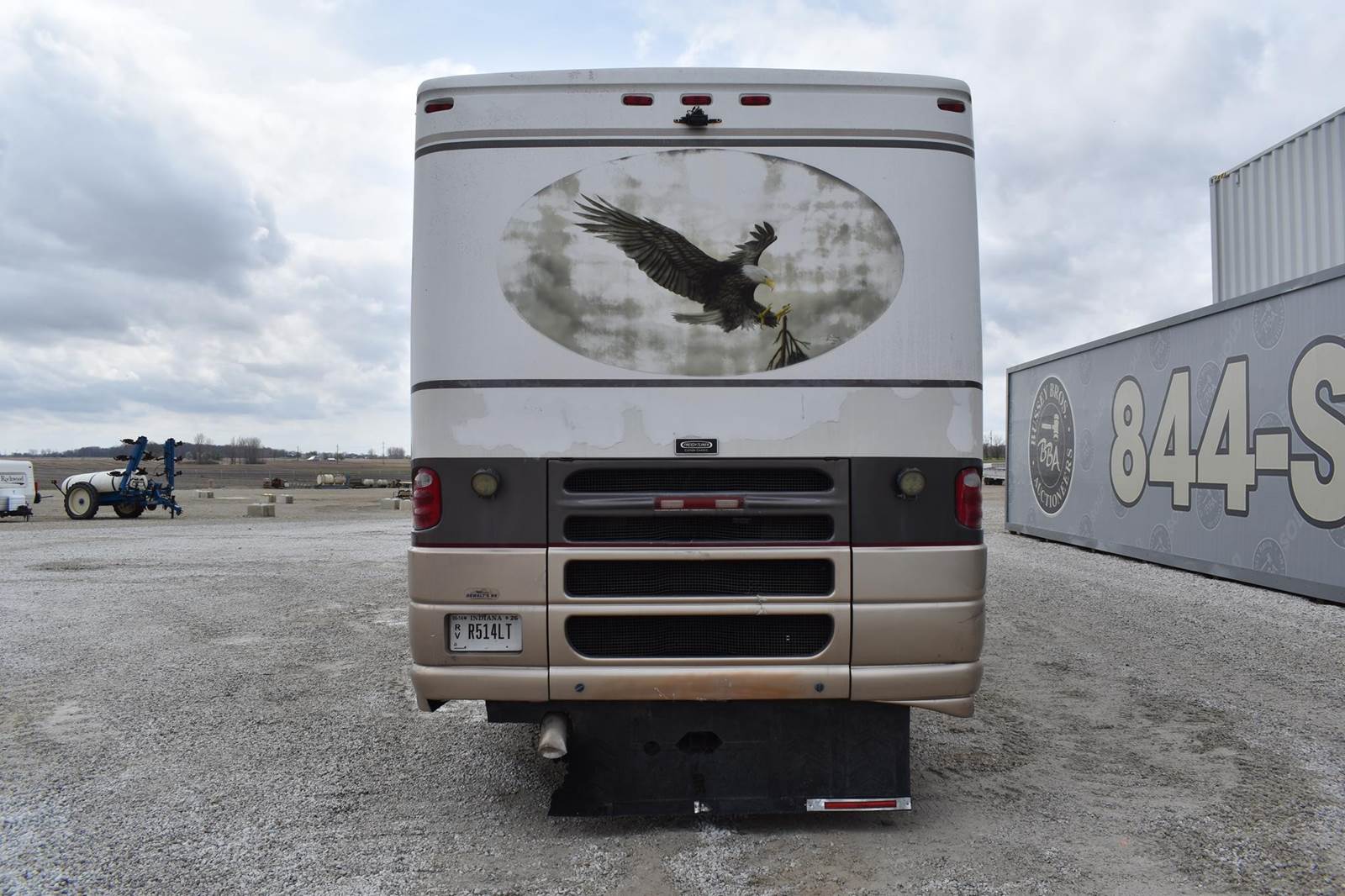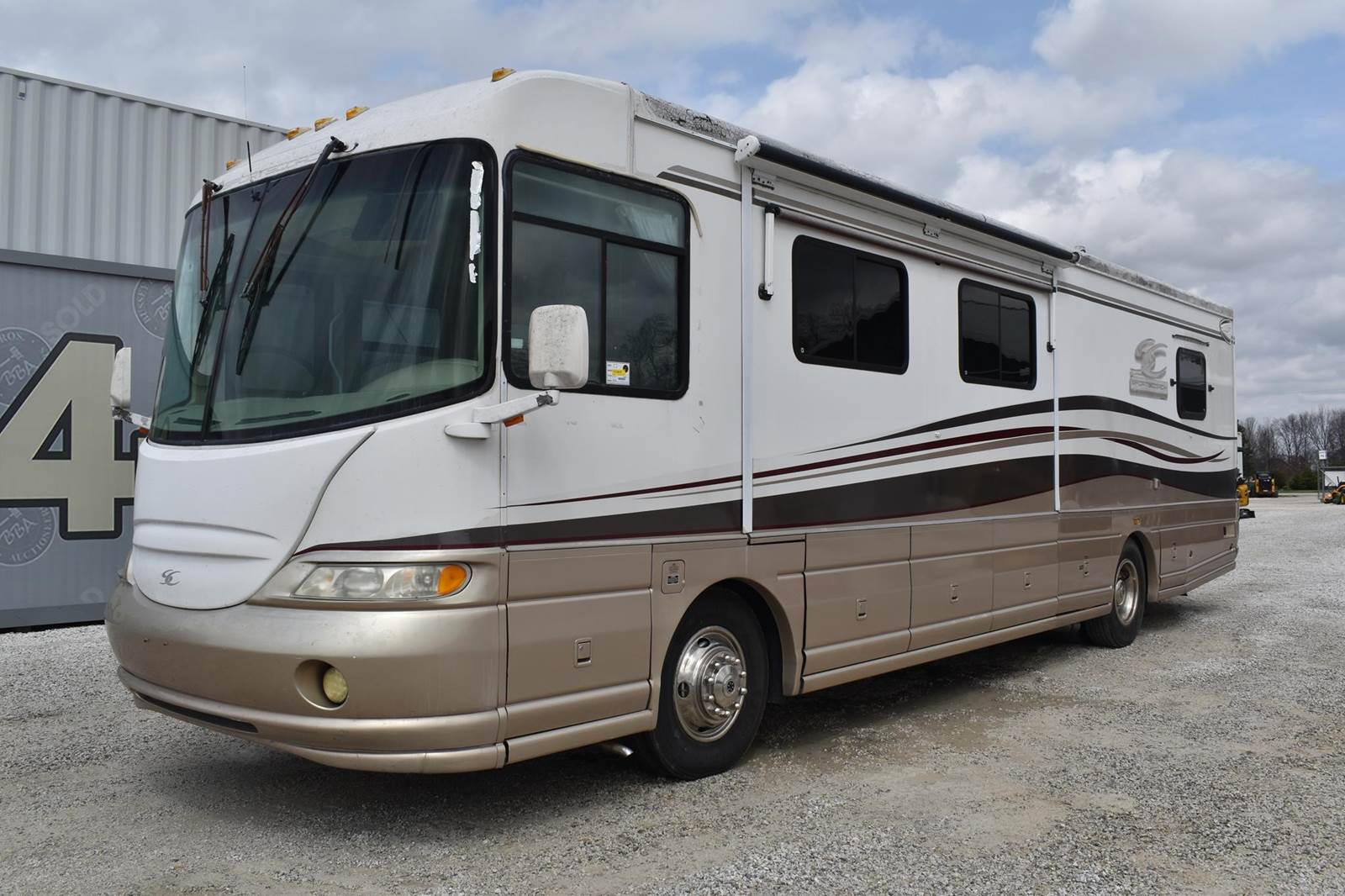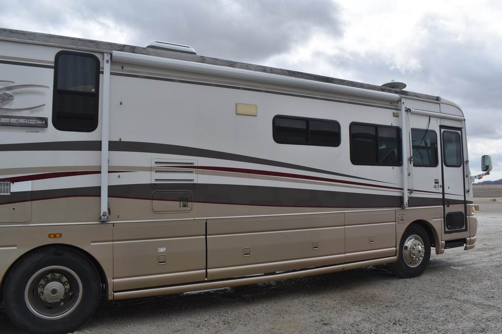 2000 Coachmen 38MBS Class A Motor Home, 58,454 Miles, rear bed room, mid kitchen, mid bath with shower, sofa, dining table with 4 chairs, washer and dryer hookup, propane heat, and water heater, propane/electric refridgerator, cealing ac units, loveseat recliner, electric fireplace, 2 flatscreen tvs, retractable awning, with clipon screen, Cummins diesel engine, air brakes, self leveling, Runs and Drives VIN#4UZ6XFBA7YCG46157 **INDIANA TITLE GUARANTEED BY CONSIGNOR, ALLOW 30 BUSINESS DAYS FOR PROCESSING** $25 TITLE FEE APPLIES***