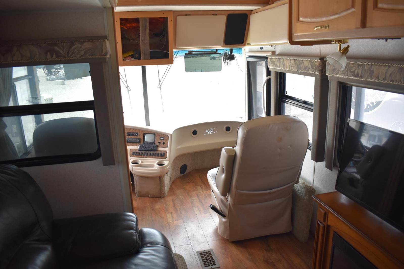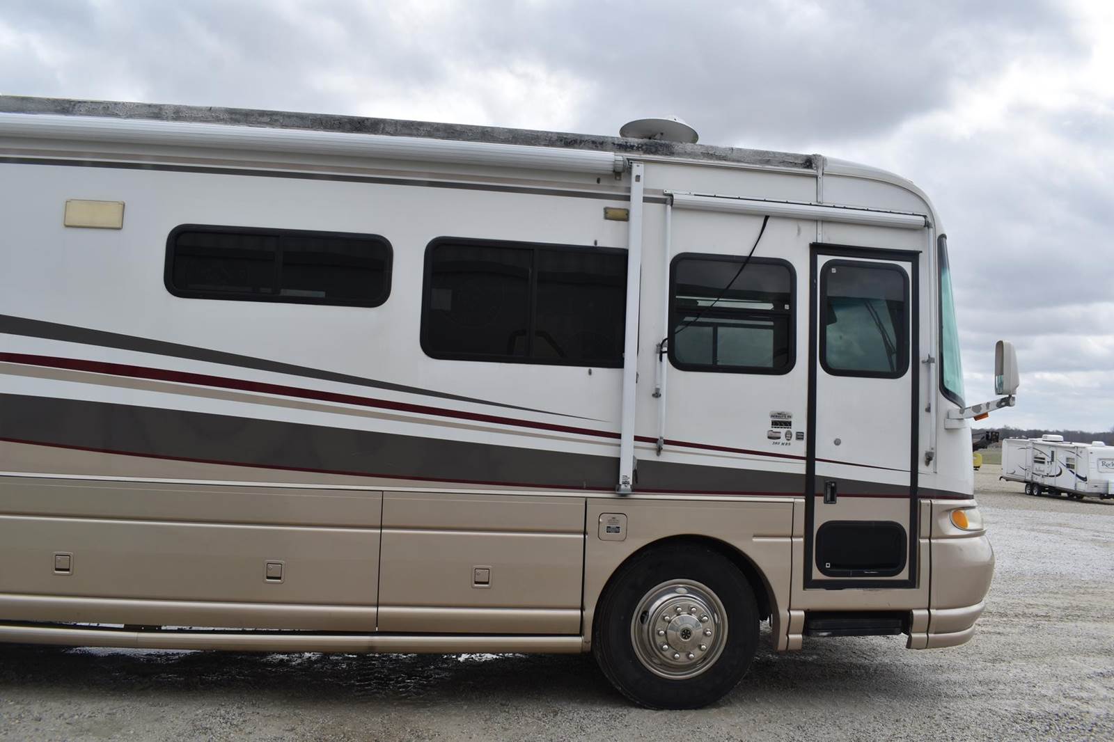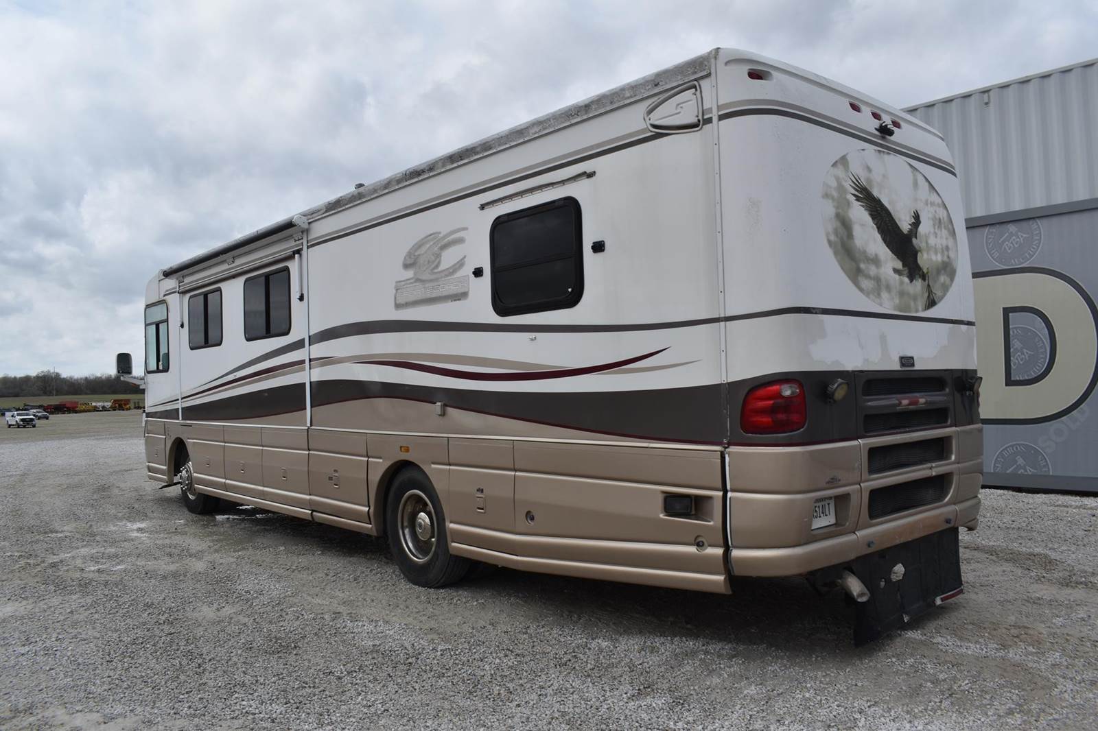 2000 Coachmen 38MBS Class A Motor Home, 58,454 Miles, rear bed room, mid kitchen, mid bath with shower, sofa, dining table with 4 chairs, washer and dryer hookup, propane heat, and water heater, propane/electric refridgerator, cealing ac units, loveseat recliner, electric fireplace, 2 flatscreen tvs, retractable awning, with clipon screen, Cummins diesel engine, air brakes, self leveling, Runs and Drives VIN#4UZ6XFBA7YCG46157 **INDIANA TITLE GUARANTEED BY CONSIGNOR, ALLOW 30 BUSINESS DAYS FOR PROCESSING** $25 TITLE FEE APPLIES***