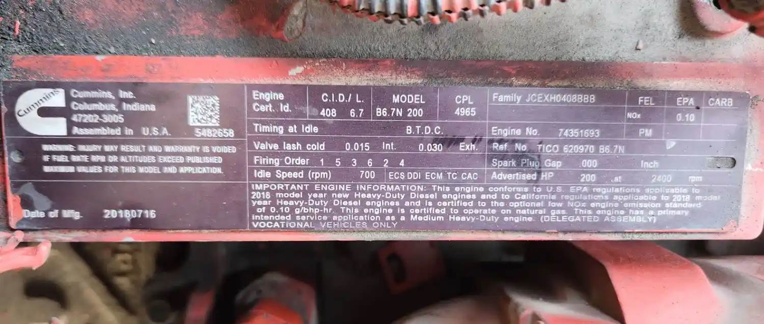 (Used) 2018 Cummins B6.7N 200, ENGINE ASSEMBLY- Family Number: JCEXH0408BBB, Displacement: 6.7L, Horsepower: 200, Ar.No./CPL: 4965, Serial Number: 74351693, Part Number: 620970, E.C.S: DDI, ECM, TC, CAC, Fuel: CNG, For more information about this item, give us a call. We ship Worldwide! (CRG HEAVY TRUCK PARTS) 929 W PULASKI HWY ELKTON, MD 21921, Serial#: 74351693, Horse Power: 200, ARR/CPL: 4965, Casting#: 74351693