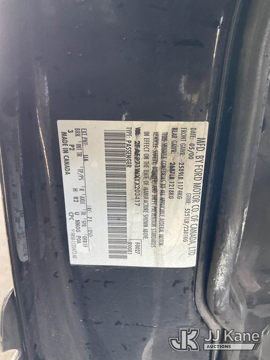 2000 Ford Crown Victoria Police Interceptor 4-Door Sedan, s/n 2FAFP71WXYX203417, 4.6L V8 SOHC 16V RWD, GAS, 4-Speed Automatic, A/C, (Exempt from Odometer Disclosure - Reads 68,933 miles) (Runs & Moves, Missing Catalytic Converter) (Bidding Restricted to Licensed Vehicle Dealers Only), This is a Titled Item NOTE: This unit is being sold AS IS/WHERE IS via Timed Auction and is located in Jurupa Valley, CA. Inspection & preview days for this unit are the 2 business days prior to the first day of items closing for this auction, item is located at 4510 Muth Way Jurupa Valley, CA 92509 and hours of operations are 8a-4p. For pre-sale questions, please contact please contact Office Staff @ (310) 353-7140. Dealer License Number 45696. (Buyer is responsible for removal. Assistance by consignor or JJ Kane Auctions is not assured.)