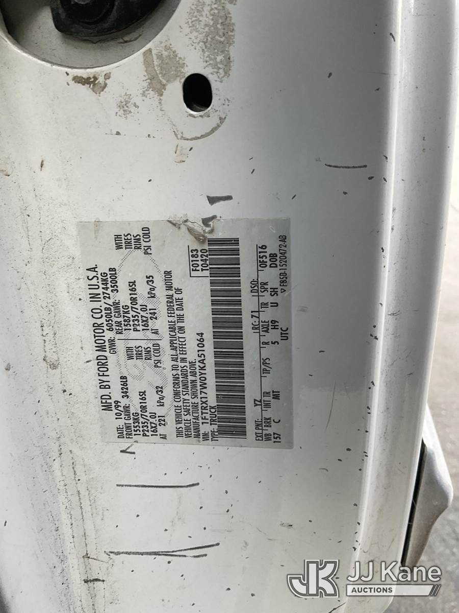 2000 Ford F-150 Extended-Cab Pickup Truck, 8-cyl gas, Auto, A/C, with Ladder Rack, True Mileage Unknown (Runs & Moves) (No Emissions Sticker, Rear Doors Are Stuck, Damage To Body, True Miles Unknown, Engine Light on) (Bidding Restricted to Licensed Vehicle Dealers Only), This is a Titled Item NOTE: This unit is being sold AS IS/WHERE IS via Timed Auction and is located in Jurupa Valley, CA. Inspection & preview days for this unit are the 2 business days prior to the first day of items closing for this auction, item is located at 4510 Muth Way Jurupa Valley, CA 92509 and hours of operations are 8a-4p. For pre-sale questions, please contact please contact Office Staff @ (310) 353-7140. Dealer License Number 45696. (Buyer is responsible for removal. Assistance by consignor or JJ Kane Auctions is not assured.)