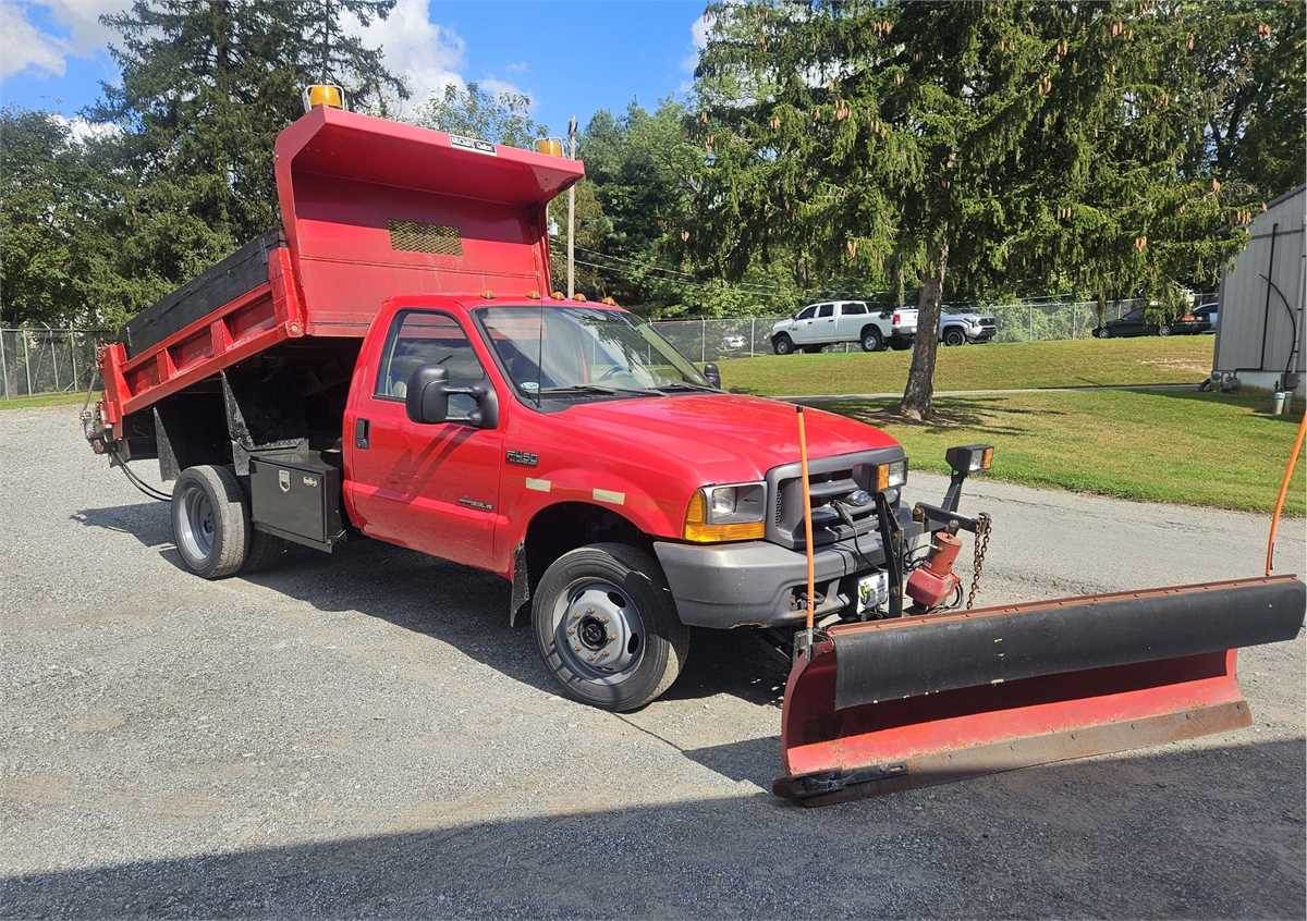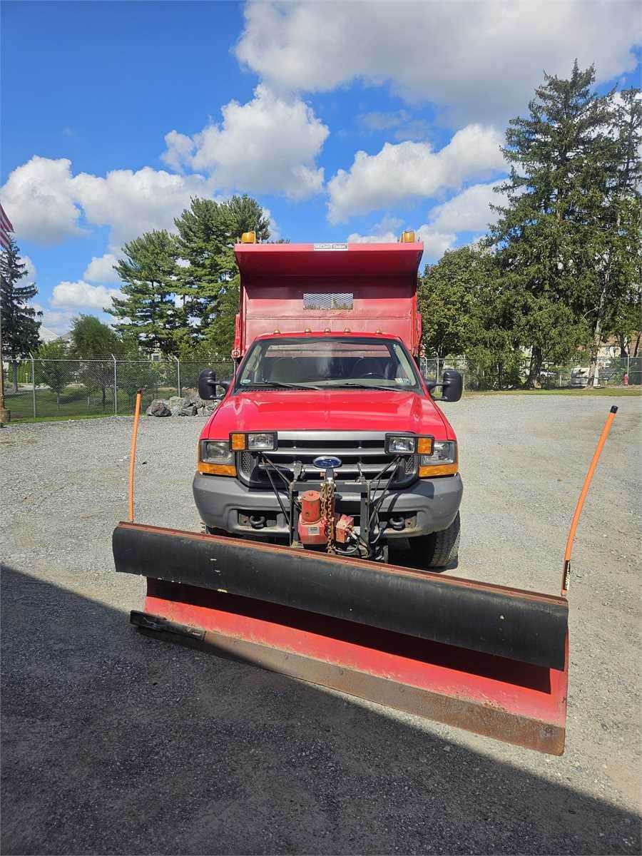 2000 Ford F-450 4x4 dump truck with 8' Western power angle snow plow and salt spreader. Live Hydraulic PTO for dump bed, plow and salt spreader.