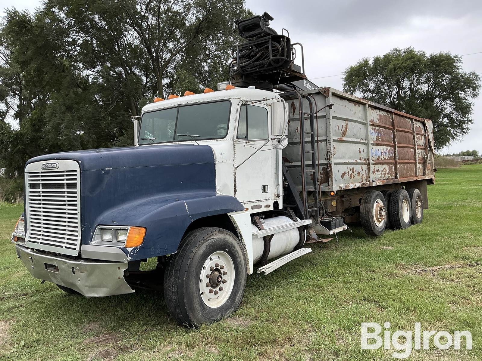 2000 Freightliner FLD120 Tri/A Truck Tractor w/Crane & Dump Box, 210,779 miles showing, Title Will Be Marked Miles Exempt, Caterpillar 3406 6-Cylinder Diesel, Water Cooled Engine, 13-Speed Transmission, Air Suspension, Hydraulic Crane, Outriggers, Hydraulic Dump Box, 315/80R22.5 Front Tires, 275/80R22.5 Pusher Tires, 11R22.5 Tires, VIN: 1FUYDXYB9YPB08542