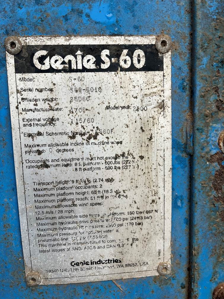 2000 Genie S-60 Boom Lift, Hours Meter Shows 5878, ford LRG-425i-6007-2Diesel Engine, 26,060lbs. 60' reach, 600 lbs. Capacity, LP GAS, Call with Questions, Financing Available.