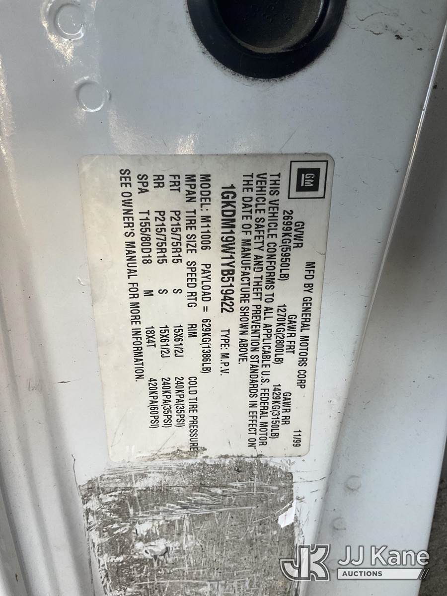 2000 GMC Safari Passenger Van, 6-cyl gas, 4-Speed Automatic, A/C, (Exempt from Odometer Disclosure - Reads 129,979 miles) (Runs & Moves) This is a Titled Item NOTE: This unit is being sold AS IS/WHERE IS via Timed Auction and is located in Jurupa Valley, CA. Inspection & preview days for this unit are the 2 business days prior to the first day of items closing for this auction, item is located at 4510 Muth Way Jurupa Valley, CA 92509 and hours of operations are 8a-4p. For pre-sale questions, please contact please contact Office Staff @ (310) 353-7140. Dealer License Number 45696. (Buyer is responsible for removal. Assistance by consignor or JJ Kane Auctions is not assured.)