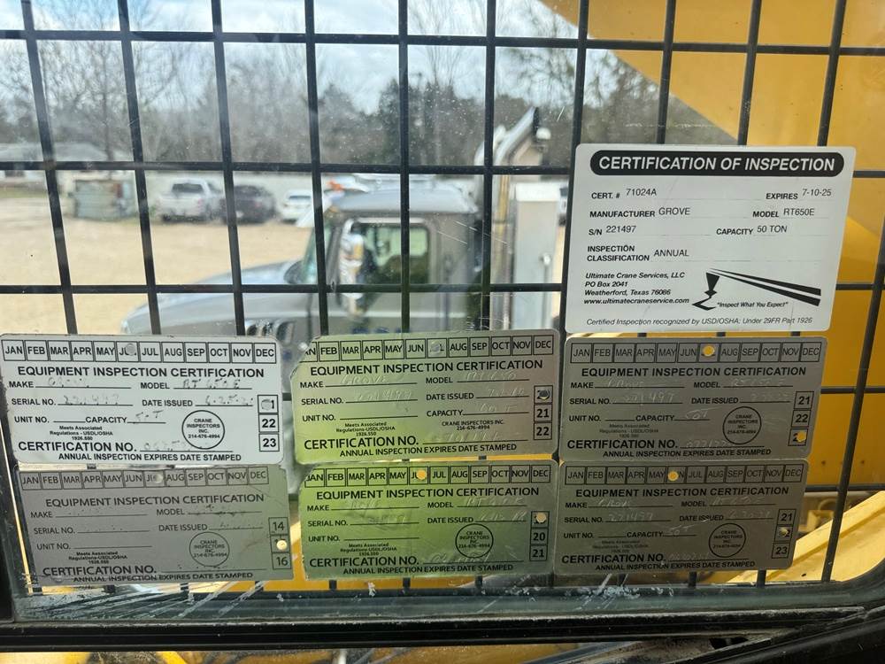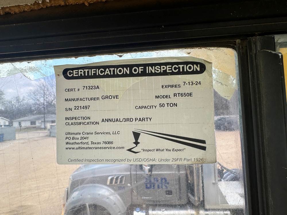 2000 Grove RT650E Rough Terrain Crane, 3749 Hours, 50 Ton Lift Capacity, 105 ft Telescopic Boom Length, Cummins 85.9 Tier 1 Diesel with Powershift Transmission, 4X4 Rough Terrain Carrier, Steering Modes: Front Wheel, 4-Whell, and Crab Steer, Enclosed Cab with Heat and Air Conditioning (A/C), financing available, more info upon request.