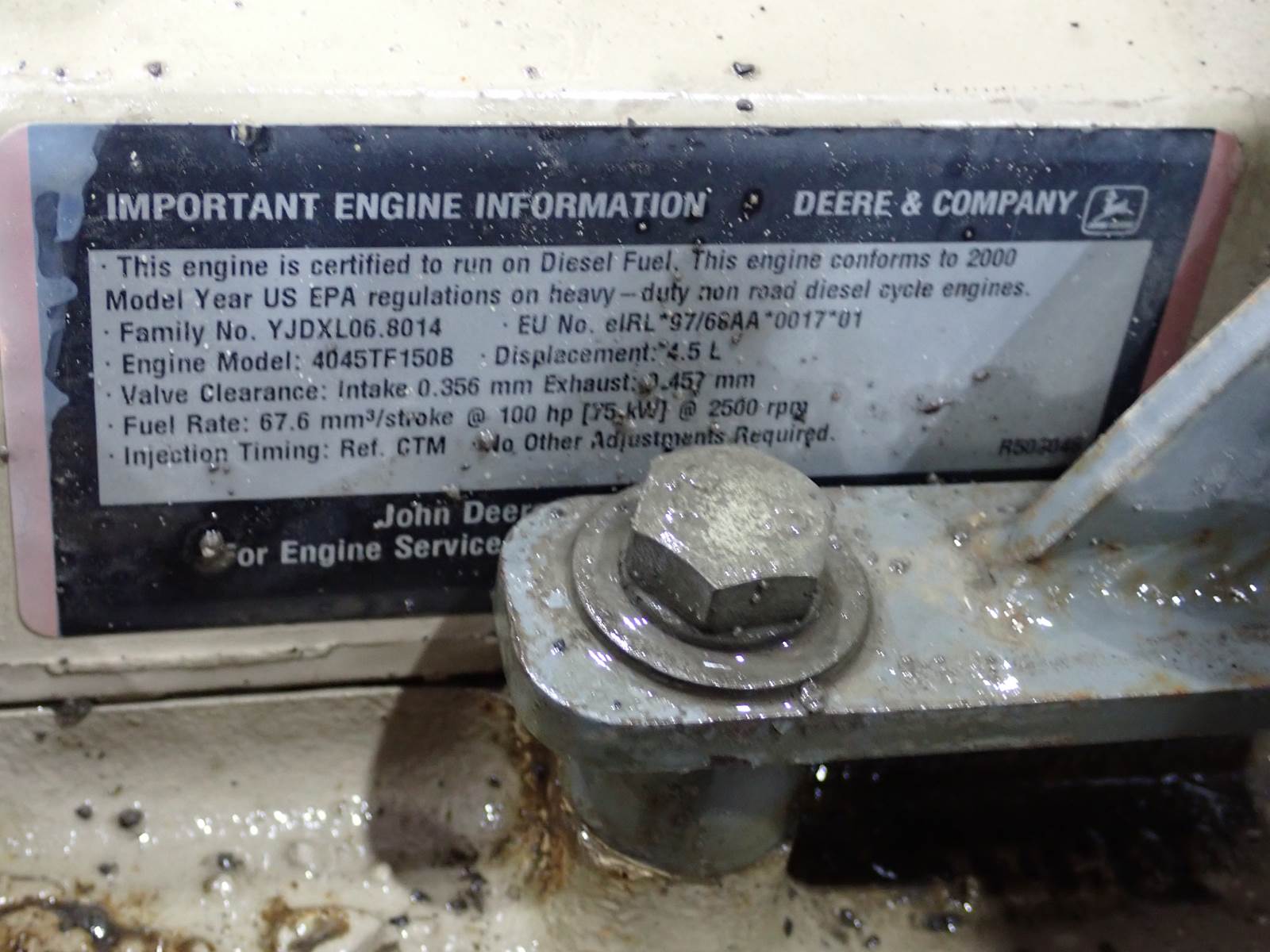 2000 John Deere 4045TF150 diesel engine, turbocharged, 100 HP at 2500 RPM rating, mechanical fuel system, Stanadyne injection pump, showing 2093 hours when removed from a sweeper unit. Comes w/ cooling package and other accessories. COMPLETE ENGINE W/ ACCESSORIES AS PICTURED. ENGINE RUNS EXCELLENT, SEE TEST RUN VIDEO. GOOD CLEAN MECHANICAL JOHN DEERE POWER HERE -- DON'T MISS IT !!