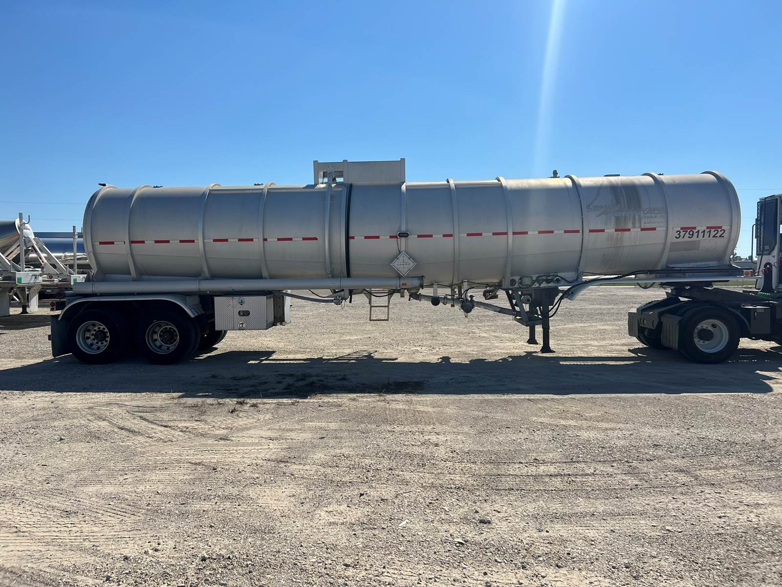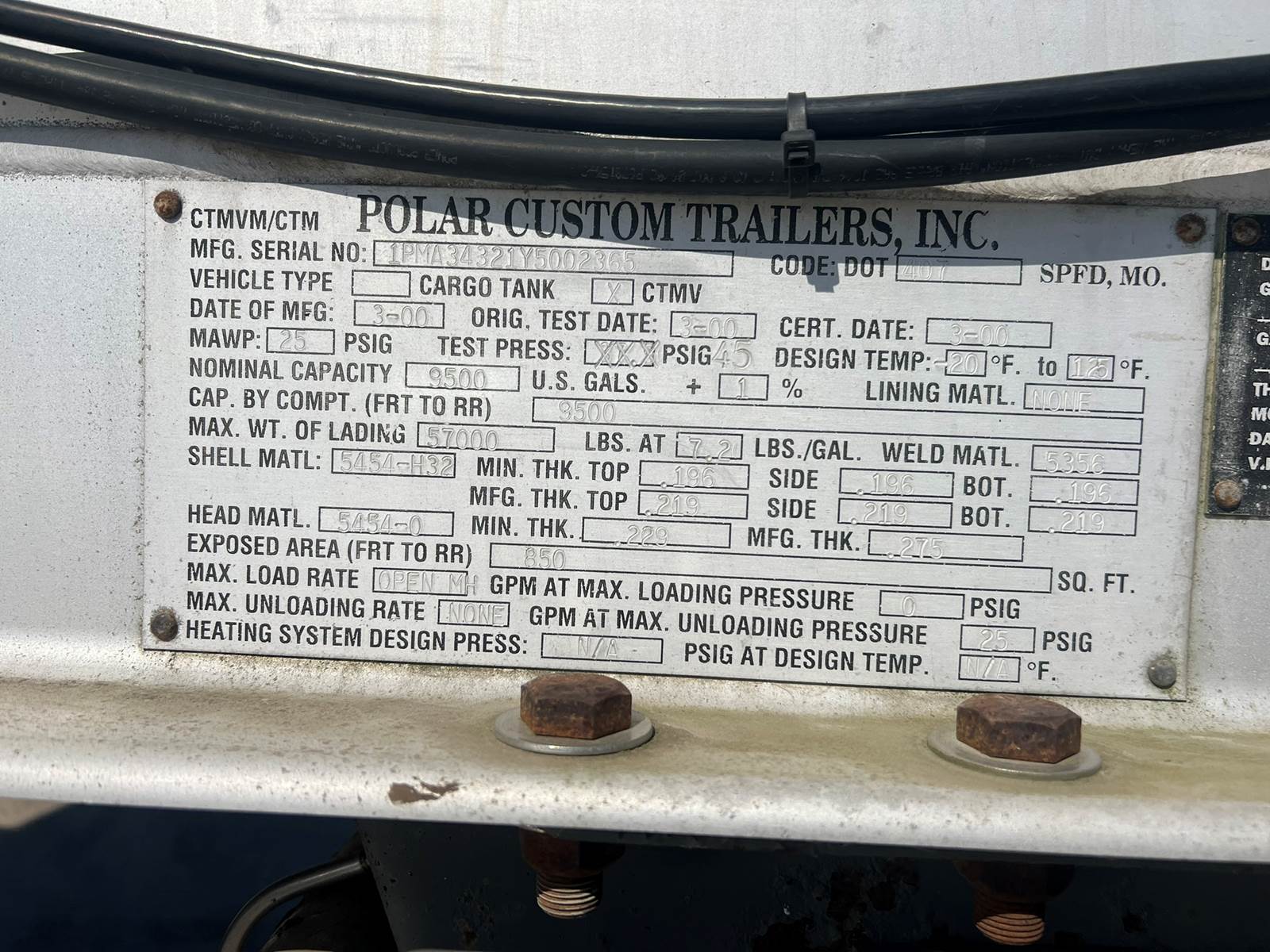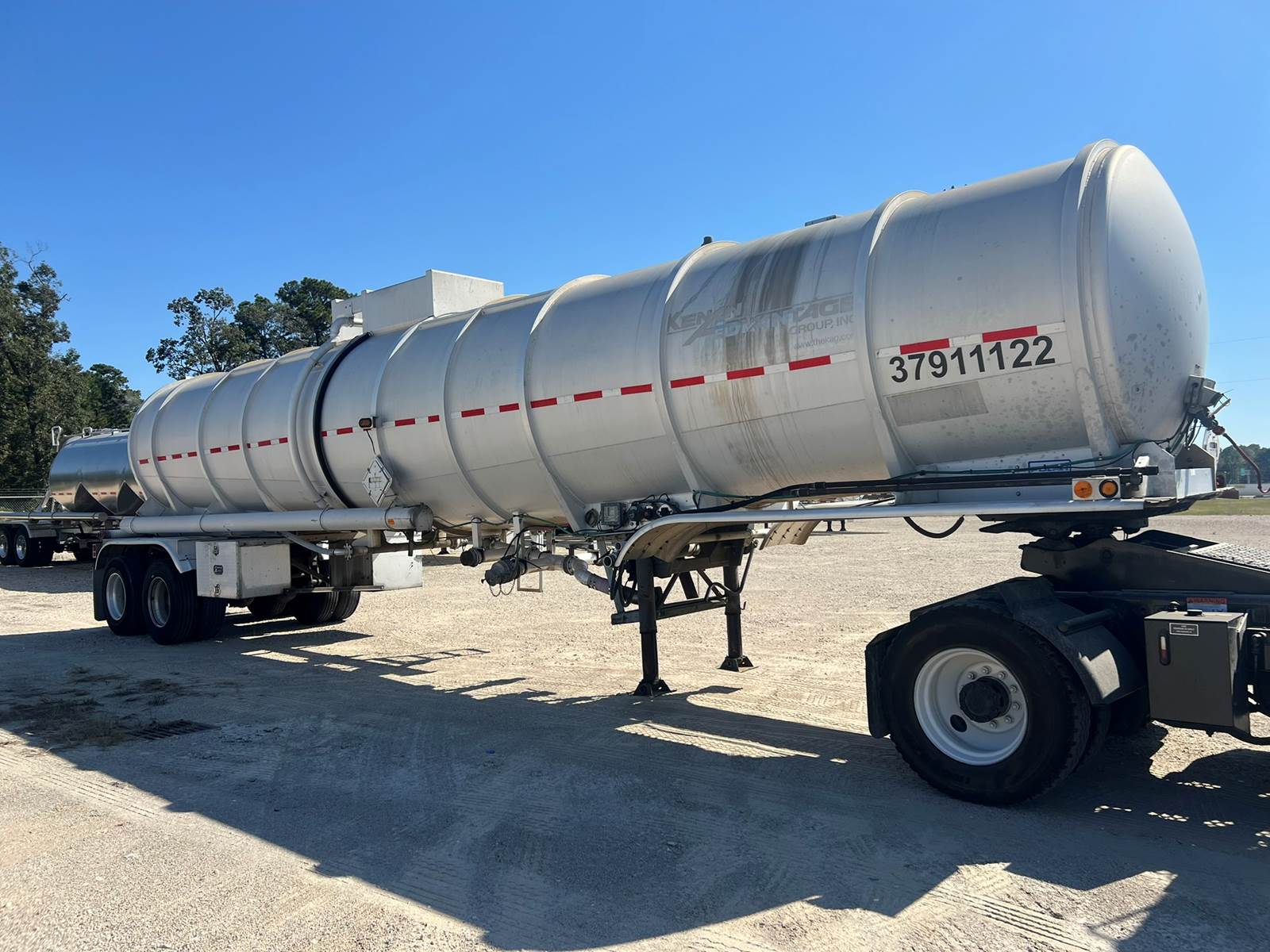 9500 Gallon, One Compartment, Spring Ride Suspension, Brakes 60%, Lo Pro 22.5 Tires (60%), Pump has been removed (hydro lines remain), Overfill system, Vapor Recovery. Trailer has baffles. No Liner. Selling as non code. Can discuss bringing trailer up to code, if you wish.