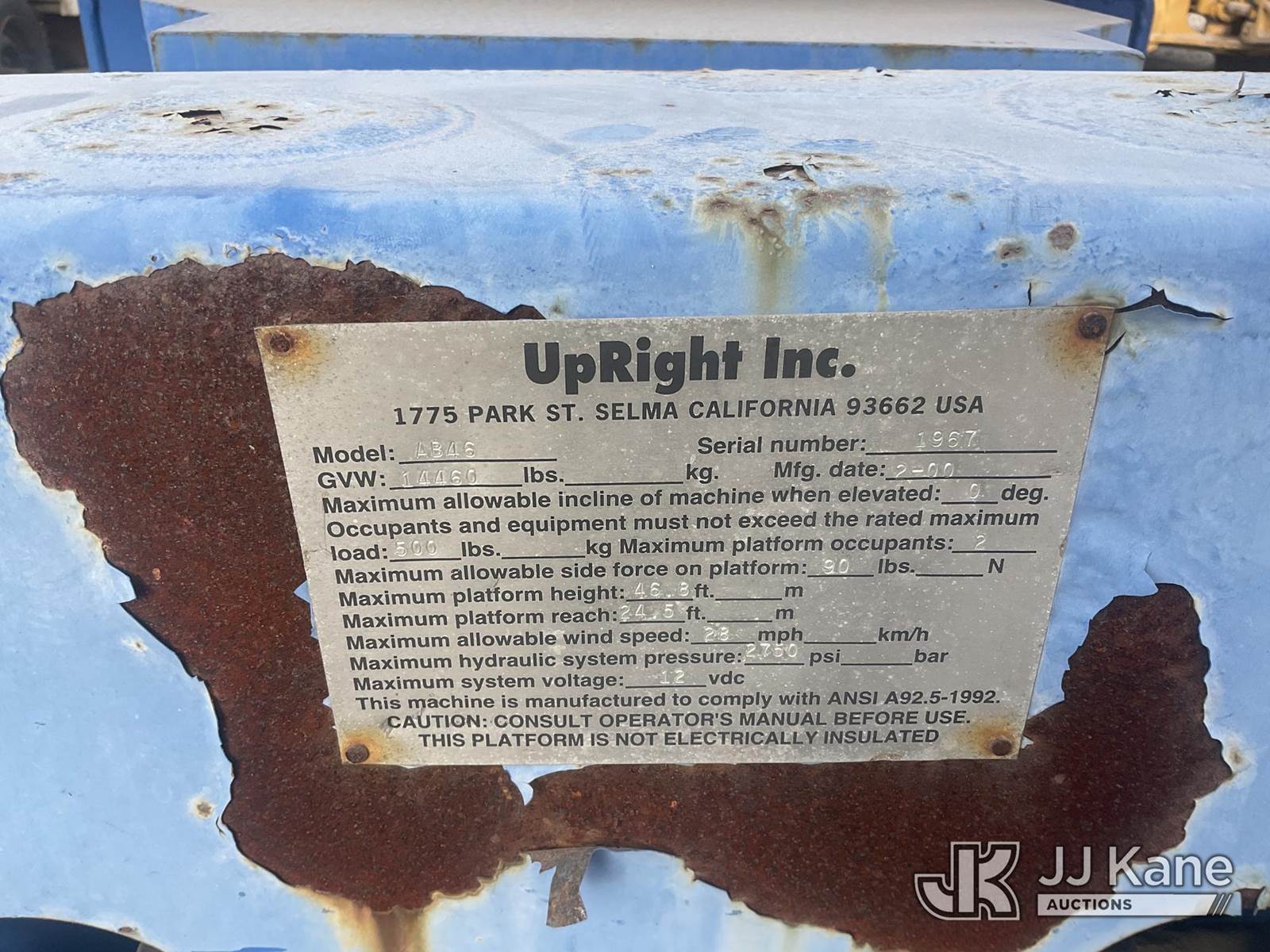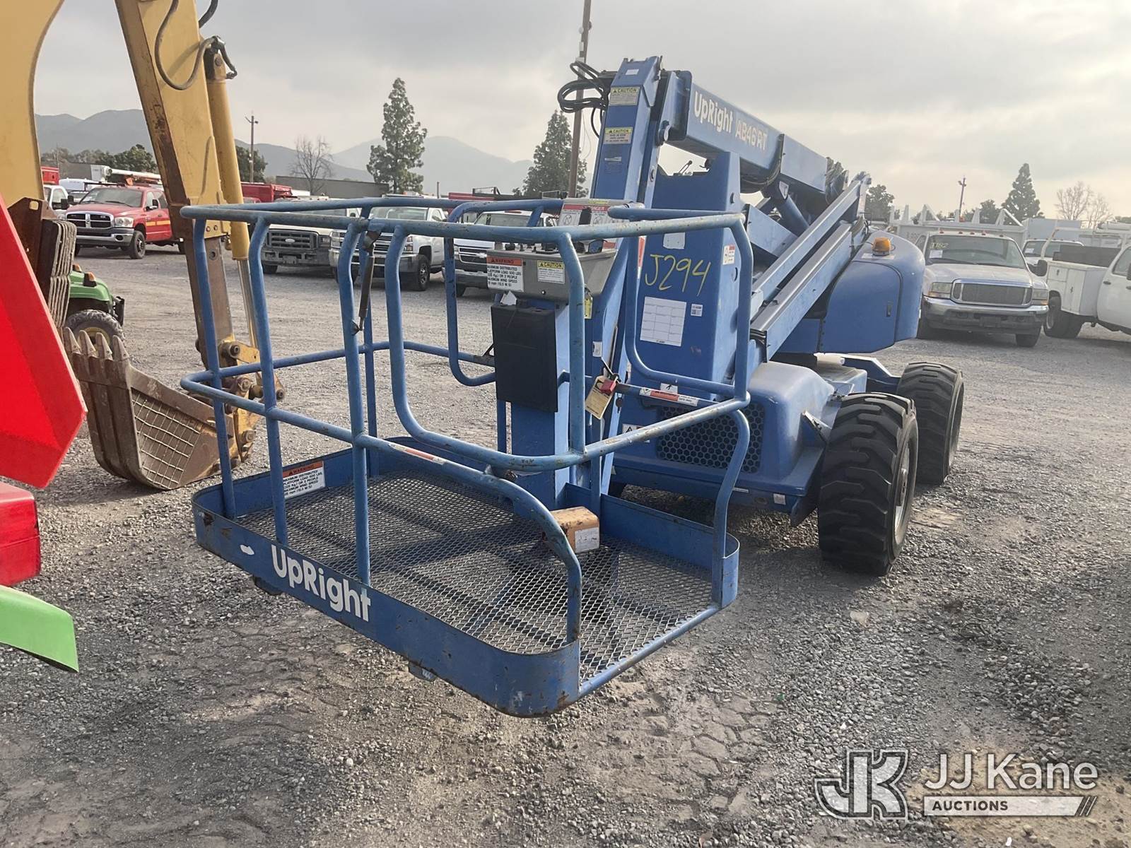 2000 UpRight AB46 Self-Propelled Telescopic Manlift, s/n 1967B, 4-cyl Dual Fuel (LPG & Gas) Hydraulic Drive, (Not Running, Condition Unknown) (Bill of Sale Only) (Reads 599 hours) NOTE: This unit is being sold AS IS/WHERE IS via Timed Auction and is located in Jurupa Valley, CA. Inspection & preview days for this unit are the 2 business days prior to the first day of items closing for this auction, item is located at 4510 Muth Way Jurupa Valley, CA 92509 and hours of operations are 8a-4p. For pre-sale questions, please contact please contact Office Staff @ (310) 353-7140. Dealer License Number 45696. (Buyer is responsible for removal. Assistance by consignor or JJ Kane Auctions is not assured.)