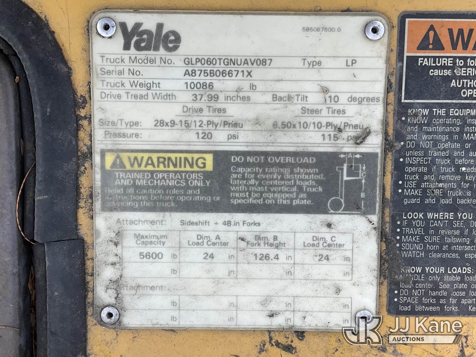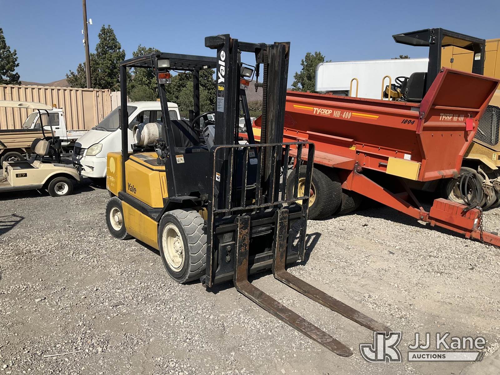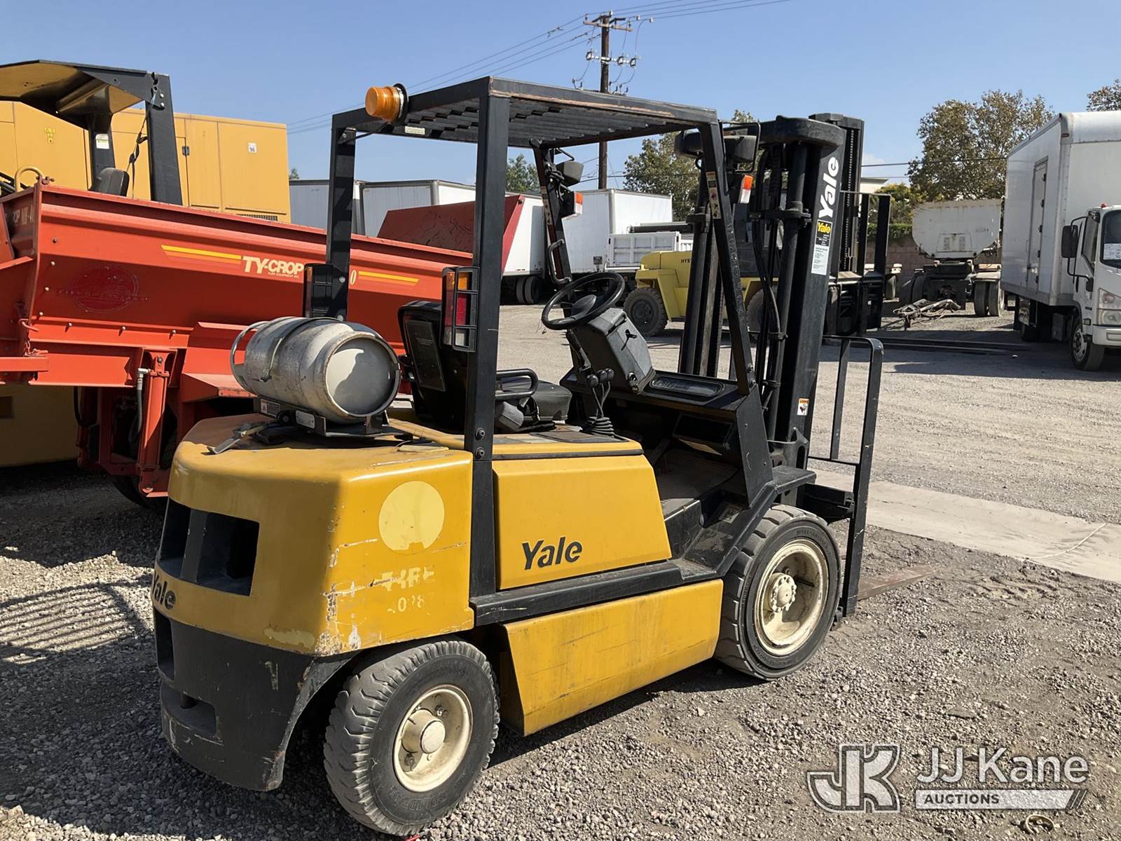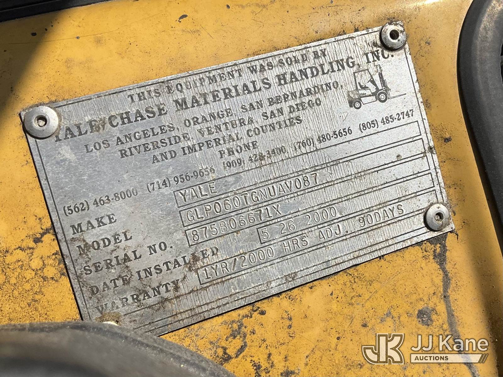 2000 YALE GLP060TGNUAV087 FORKLIFT, s/n A875B06671X, Yale LPG, (Runs & Operates, Title Only) (Reads 155 hours) NOTE: This unit is being sold AS IS/WHERE IS via Timed Auction and is located in Jurupa Valley, CA. Inspection & preview days for this unit are the 2 business days prior to the first day of items closing for this auction, item is located at 4510 Muth Way Jurupa Valley, CA 92509 and hours of operations are 8a-4p. For pre-sale questions, please contact please contact Office Staff @ (310) 353-7140. Dealer License Number 45696. (Buyer is responsible for removal. Assistance by consignor or JJ Kane Auctioneers is not assured.)