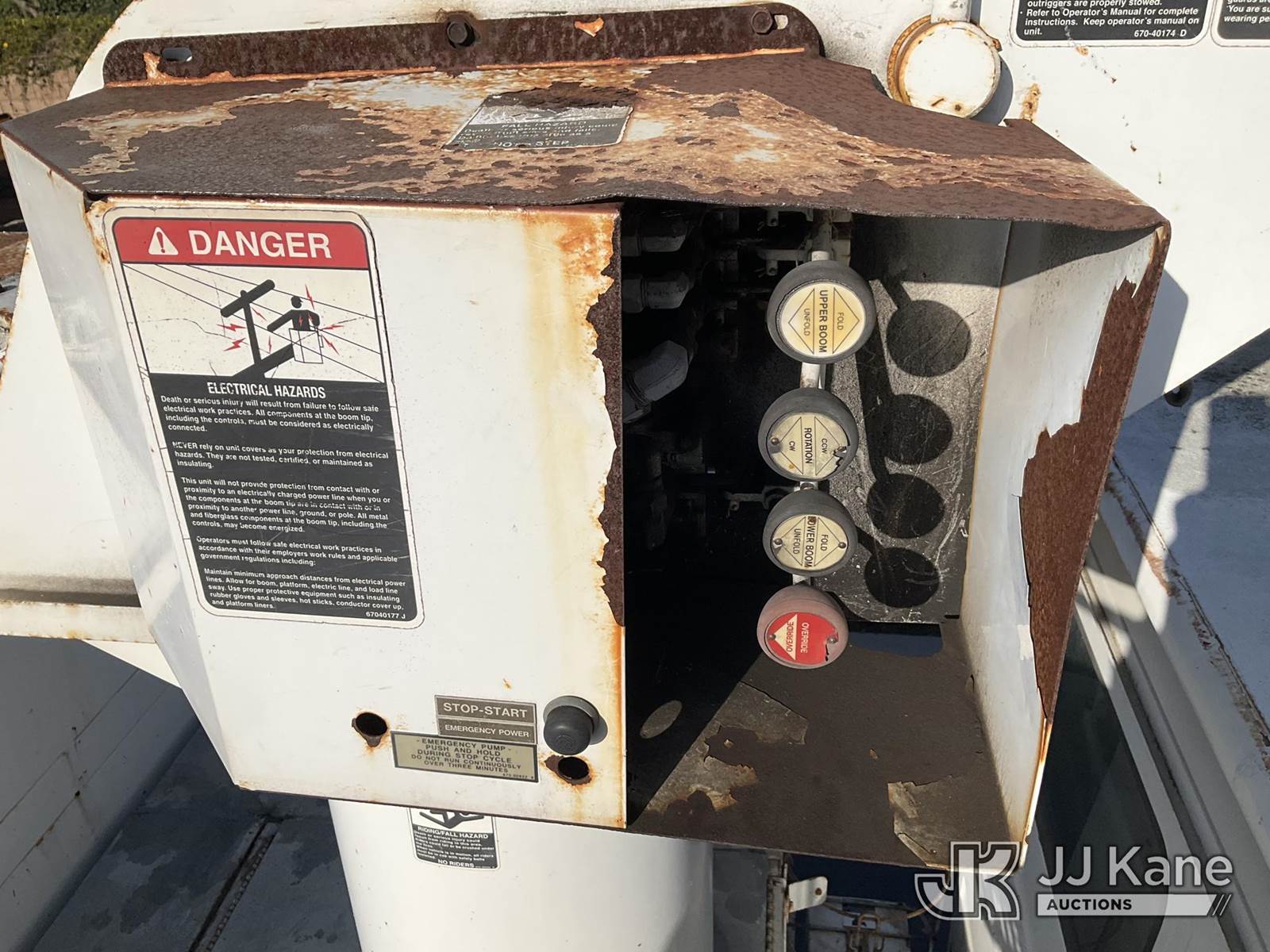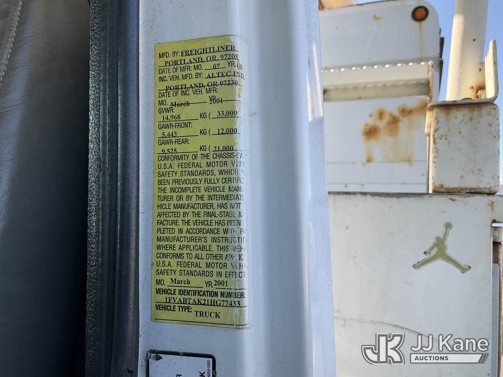 Altec LRV-58, 63 ft, Over-Center Bucket Truck s/n 0900CV0657, with single-man bucket & 2 hyd outriggers, mounted behind cab on 2001 Freightliner FL70 Utility Truck, s/n 1FVABTAK21HG77433, 7.2L L6 4X2, DIESEL, Auto, (Exempt from Odometer Disclosure - Reads 44,796 miles) (Runs, Moves, & Upper Operates The manufacturer has notified JJ Kane that this equipment is subject to an open recall. CSN 672 LRV/LR7 Leveling Yoke Inspection The equipment should not be operated until this is addressed. Buyer is responsible for reviewing the recall notice and contacting the manufacturer to schedule the recommended corrective actions. Associated costs may be covered by the manufacturer in some cases.) Subject to CARB Regs,CARB non Compliant,Cannot Operate on CA Roads/Highways until Compliant This is a Titled Item NOTE: This unit is being sold AS IS/WHERE IS via Timed Auction and is located in Jurupa Valley, CA. Inspection & preview days for this unit are the 2 business days prior to the first day of items closing for this auction, item is located at 4510 Muth Way Jurupa Valley, CA 92509 and hours of operations are 8a-4p. For pre-sale questions, please contact please contact Office Staff @ (310) 353-7140. Dealer License Number 45696. (Manuals provided in cab) (Buyer is responsible for removal. Assistance by consignor or JJ Kane Auctions is not assured.)