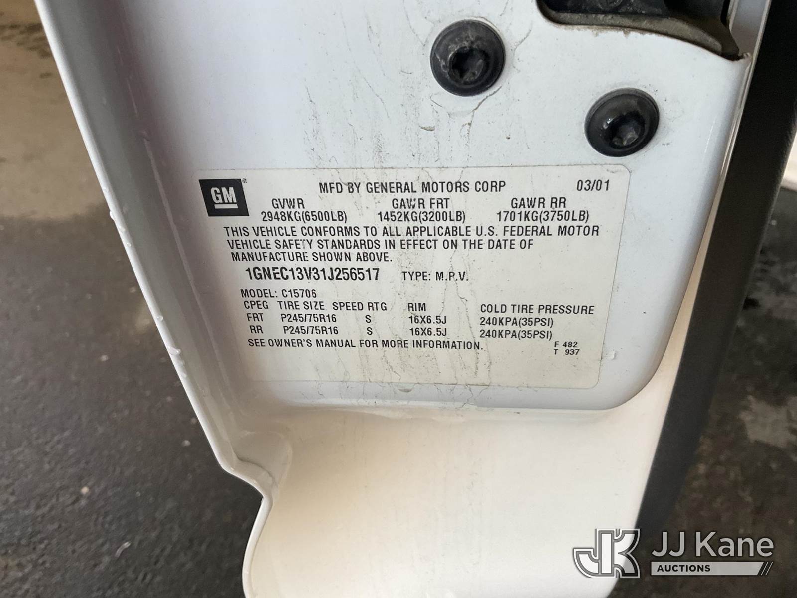 2001 Chevrolet Tahoe 4-Door Sport Utility Vehicle, 8-cyl gas, 4-Speed Automatic, A/C, (Exempt from Odometer Disclosure - Reads 074,738 miles) (Runs & Moves) (Middle Console Stripped) This is a Titled Item NOTE: This unit is being sold AS IS/WHERE IS via Timed Auction and is located in Jurupa Valley, CA. Inspection & preview days for this unit are the 2 business days prior to the first day of items closing for this auction, item is located at 4510 Muth Way Jurupa Valley, CA 92509 and hours of operations are 8a-4p. For pre-sale questions, please contact please contact Office Staff @ (310) 353-7140. Dealer License Number 45696. (Buyer is responsible for removal. Assistance by consignor or JJ Kane Auctioneers is not assured.)