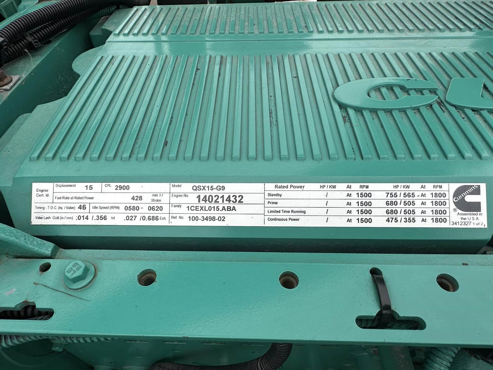 Cummins 400 kW standby (350 kW prime) diesel generator set, model DFEH, SN-G010266044. Cummins QSX15-G9 engine rated 755 HP at 1800 RPM, SN-14021432. 3/60/277/480V, 12 lead reconnectable to other voltages. 800 Amp main-line circuit breaker. PMG permanent magnet generator. 660 kW oversized generator end. UL 2200 listed package. PowerCommand 2100 digital control panel. Battery charger. Coolant heater. Open skid unit with engine driven radiator. 80 Hours. Year 2001. Load test pending. Overall dimensions 61W x 152L x 79H on 6H blocks, 10,250 lbs. FOB Waukesha, WI