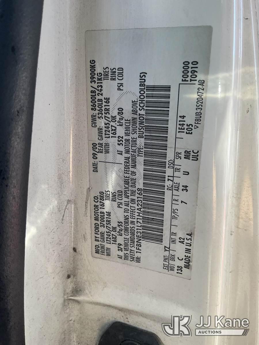 2001 Ford Econoline Wagon E350 Passenger Van, 8-cyl gas, 4-Speed Automatic, A/C, (Exempt from Odometer Disclosure - Reads 099,807 miles (unverified)) (Runs & Moves) This is a Titled Item NOTE: This unit is being sold AS IS/WHERE IS via Timed Auction and is located in Jurupa Valley, CA. Inspection & preview days for this unit are the 2 business days prior to the first day of items closing for this auction, item is located at 4510 Muth Way Jurupa Valley, CA 92509 and hours of operations are 8a-4p. For pre-sale questions, please contact please contact Office Staff @ (310) 353-7140. Dealer License Number 45696. (Buyer is responsible for removal. Assistance by consignor or JJ Kane Auctions is not assured.)