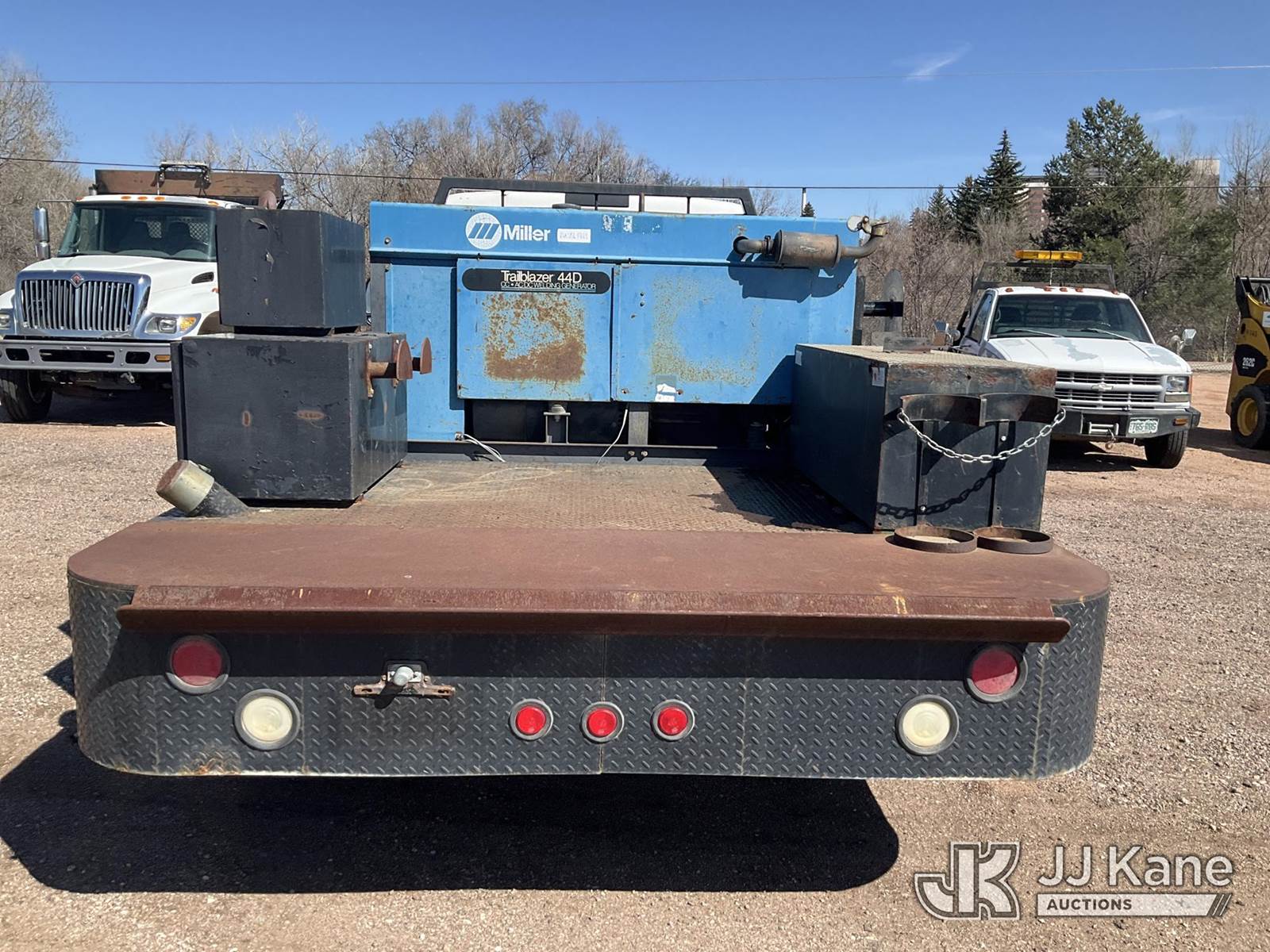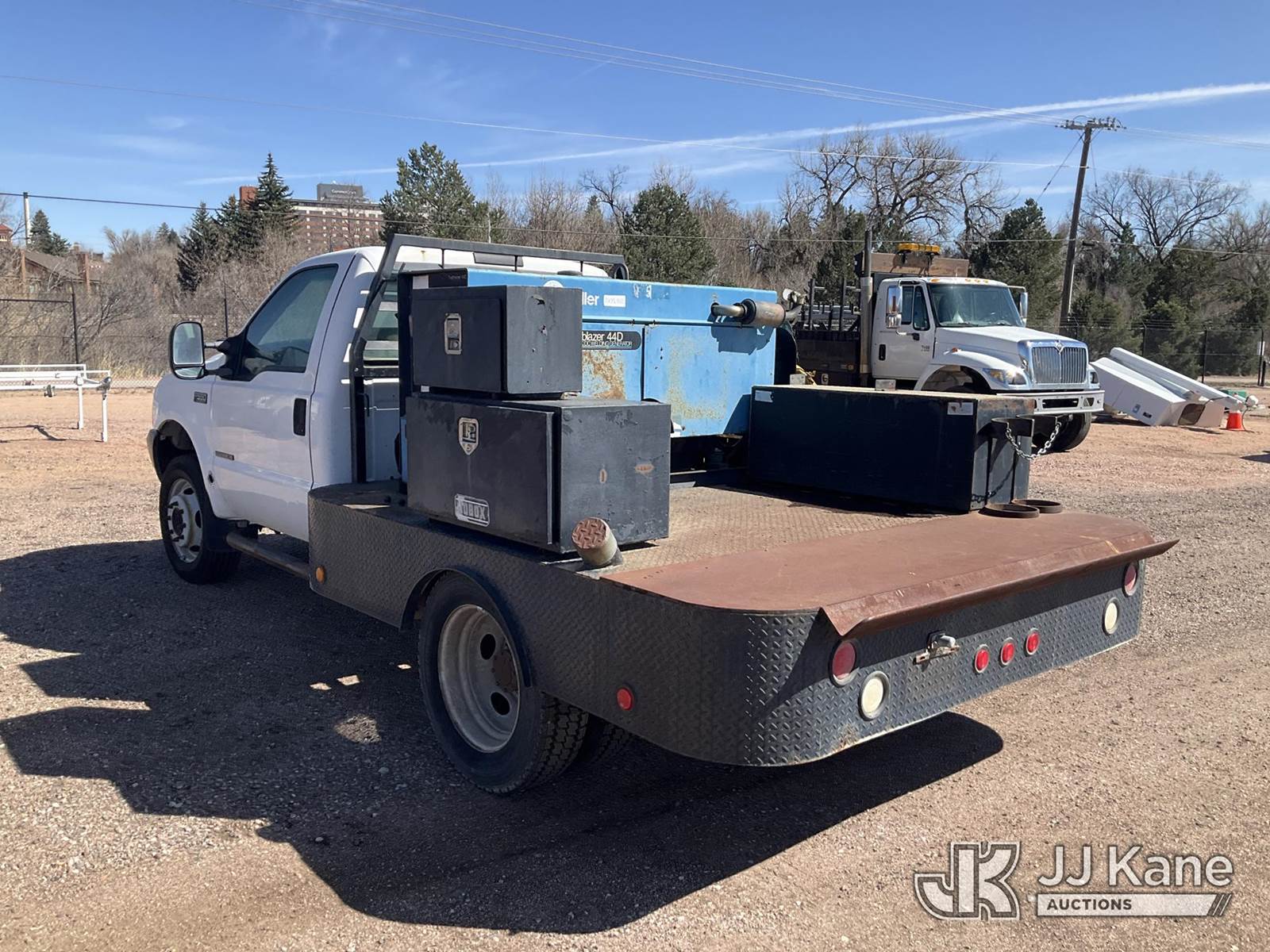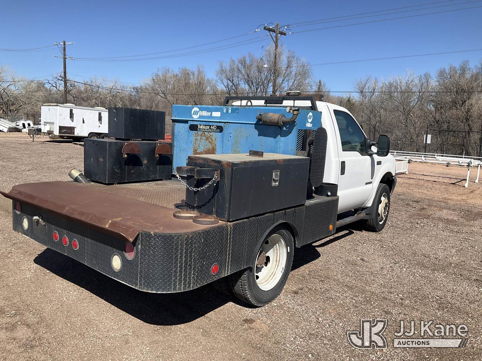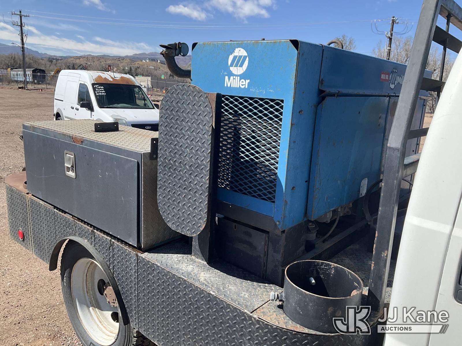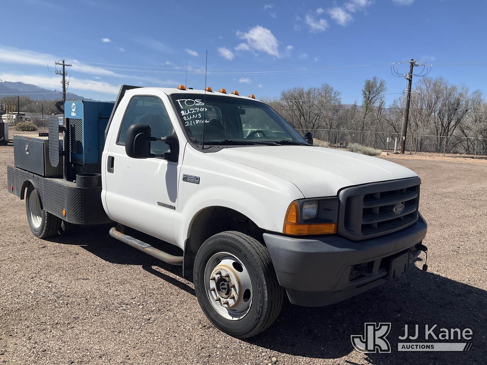 2001 Ford F-550 Flatbed/Service Truck, 7.3L Turbo Diesel 4WD, Auto, A/C, (Exempt from Odometer Disclosure - Reads 49,779 miles) (Runs, Moves & Operates) (Miller Trailblazer 44D AC/DC Welding Generator - 2816 hours, Jobox model 735980 mounted toolbox.) (Reads 2,816 hours) This is a Titled Item NOTE: This unit is being sold AS IS/WHERE IS via Timed Auction and is located in Colorado Springs, CO. Inspection & preview days for this unit are by appointment only; please contact us at contact@jjkane.com or 84-Go-JJKane for more details. (Buyer is responsible for removal. Assistance by consignor or JJ Kane Auctions is not assured.)