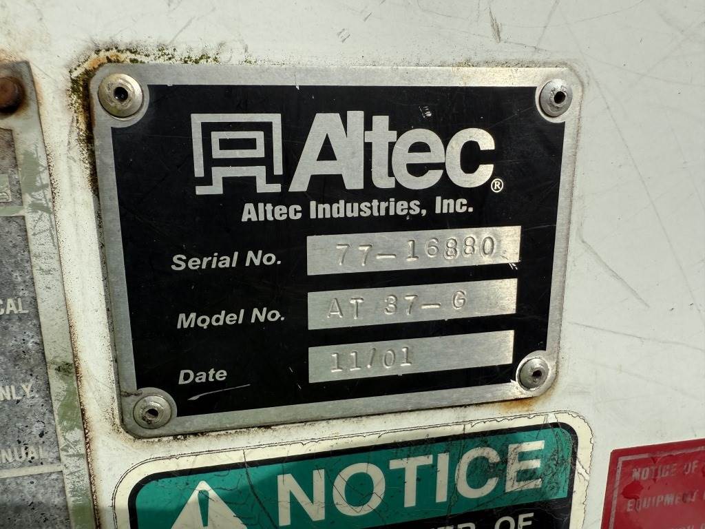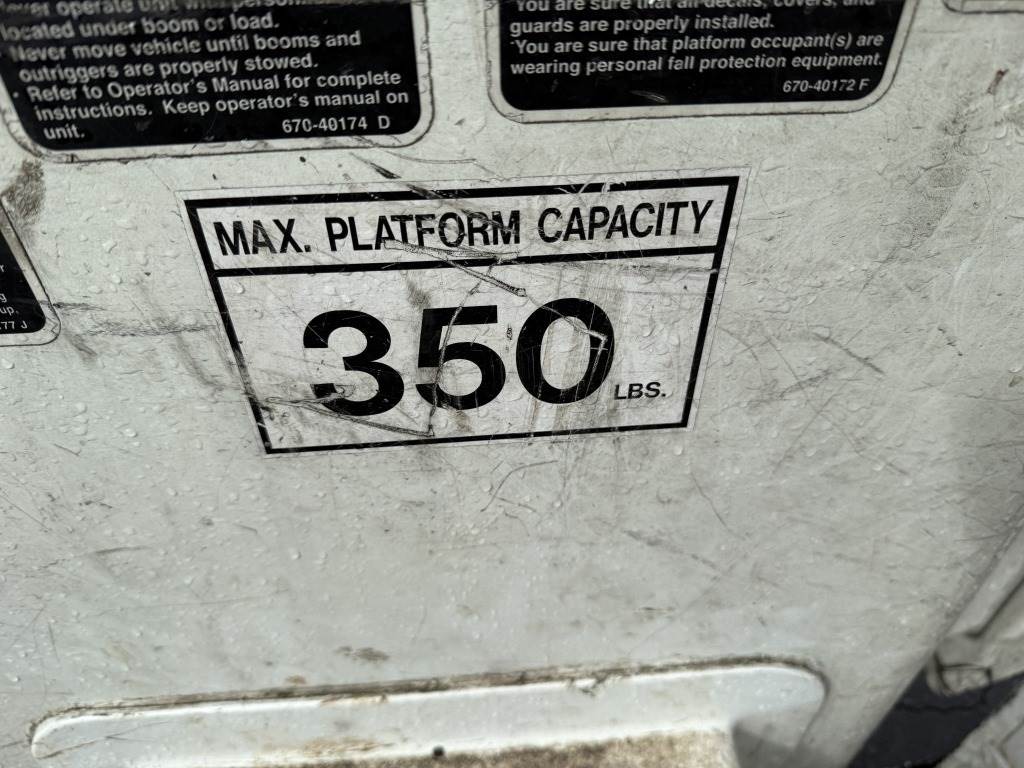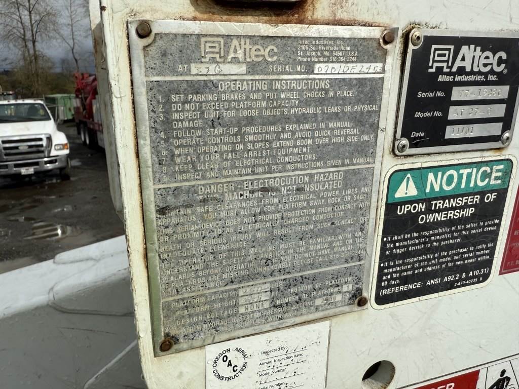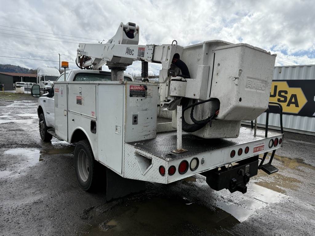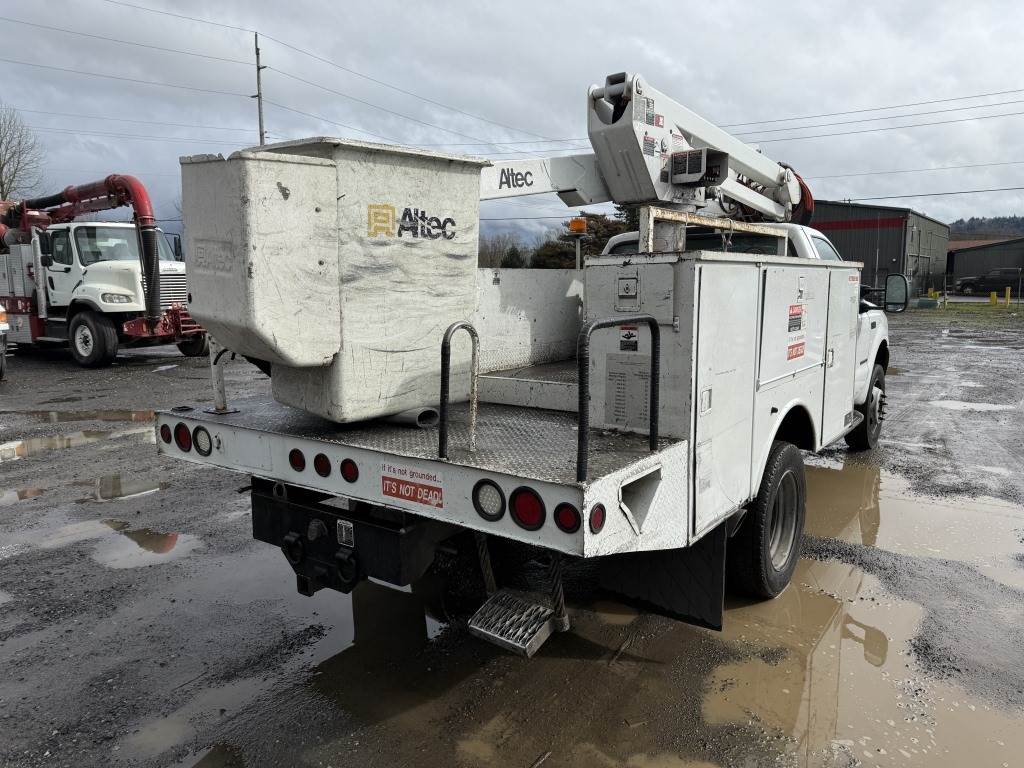 Location: Washougal WA ***End-User Consignment*** VIN: 1FDAF56F11ED79280 Engine: 7.3L 8cyl Diesel Transmission: Automatic Altec AT37G articulating telescopic boom lift - 42' height & 350lb capacity, Altec utility body w/6 storage compartments, power inverter, tow package, running boards, Muncie PTO, 13,065 engine hours, A/C, AM/FM, spring suspension, 225/70R19.5 tires. Miles: 165,877