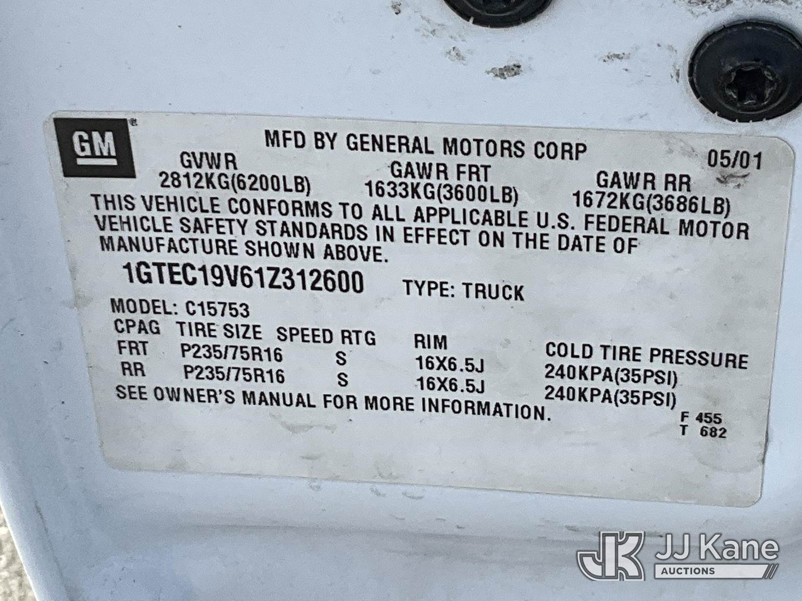 2001 GMC Sierra 1500 8-cyl gas, Auto, A/C, (Exempt from Odometer Disclosure - Reads 197,203 miles) (Runs & Moves) (ABS & Brake Lights On) This is a Titled Item NOTE: This unit is being sold AS IS/WHERE IS via Timed Auction and is located in Salt Lake City, UT. Inspection & preview days for this unit are the 2 business days prior to the first day of items closing for this auction, item is located at 2353 N Redwood Rd Salt Lake City, UT 84116 and hours of operations are 8a-4p. Titles executed exactly as bidder registered. Ensure your name and/or business name and address in JJ Kane and/or ProxiBid is correct before bidding. For pre-sale questions, please contact Office Staff @ (801) 519-0123. (Buyer is responsible for removal. Assistance by consignor or JJ Kane Auctions is not assured.)