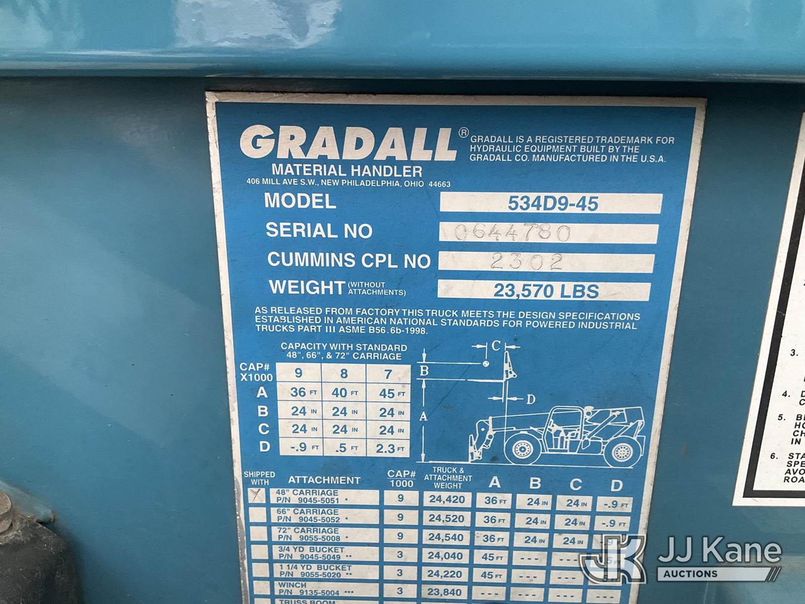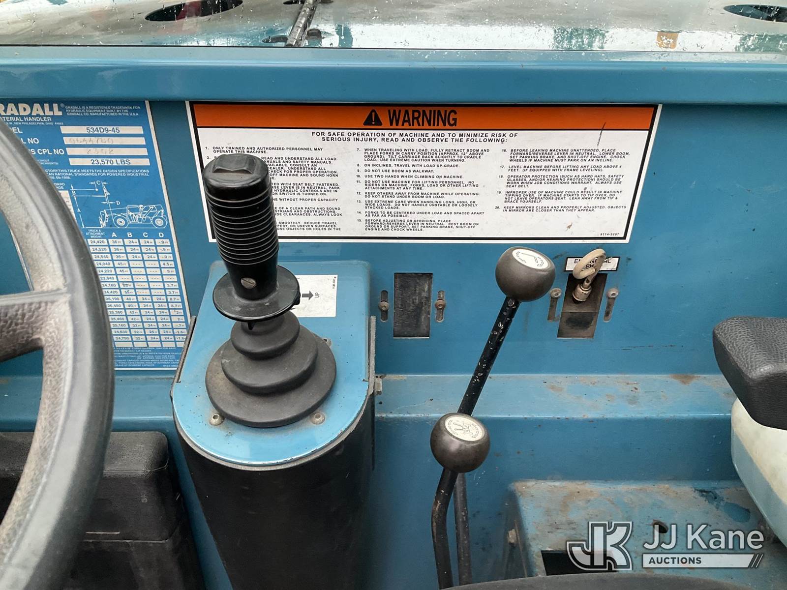 2001 Gradall 534D9-45 Rubber Tired Forklift, s/n 644780, 4-cyl, diesel, (Runs & Operates ) (Reads 2,179 hours) May be subject to ARB Regulations NOTE: This unit is being sold AS IS/WHERE IS via Timed Auction and is located in Jurupa Valley, CA. Inspection & preview days for this unit are the 2 business days prior to the first day of items closing for this auction, item is located at 4510 Muth Way Jurupa Valley, CA 92509 and hours of operations are 8a-4p. For pre-sale questions, please contact please contact Office Staff @ (310) 353-7140. Dealer License Number 45696. (Buyer is responsible for removal. Assistance by consignor or JJ Kane Auctions is not assured.)
