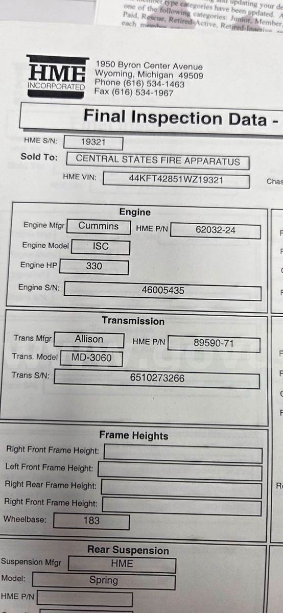 2001 HME Inc. Penetrator by Central States Fire Apparatus. 1250 GPM Pump with 1,000 Gal Tank. Cummings 330Hp Engine with Allison Automatic transmission. Last Service tested and serviced in Summer of 2025. Graphic/Decals will be removed residue/impressions remain. Some equipment in the photos is not included and will be removed. Truck is sold as is. Runs, Drives, and pump's as it should.