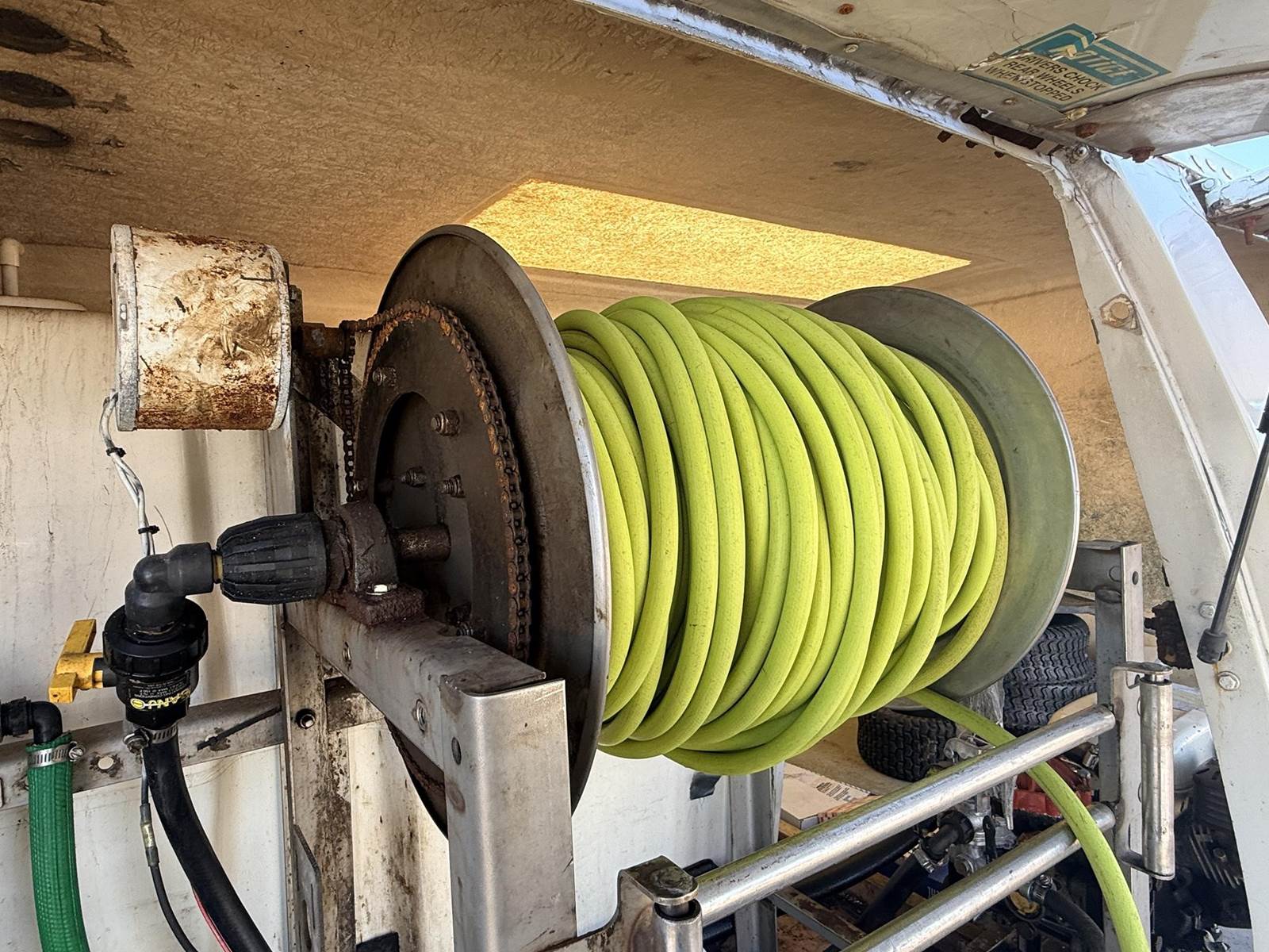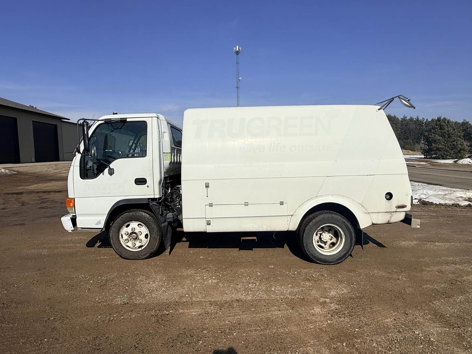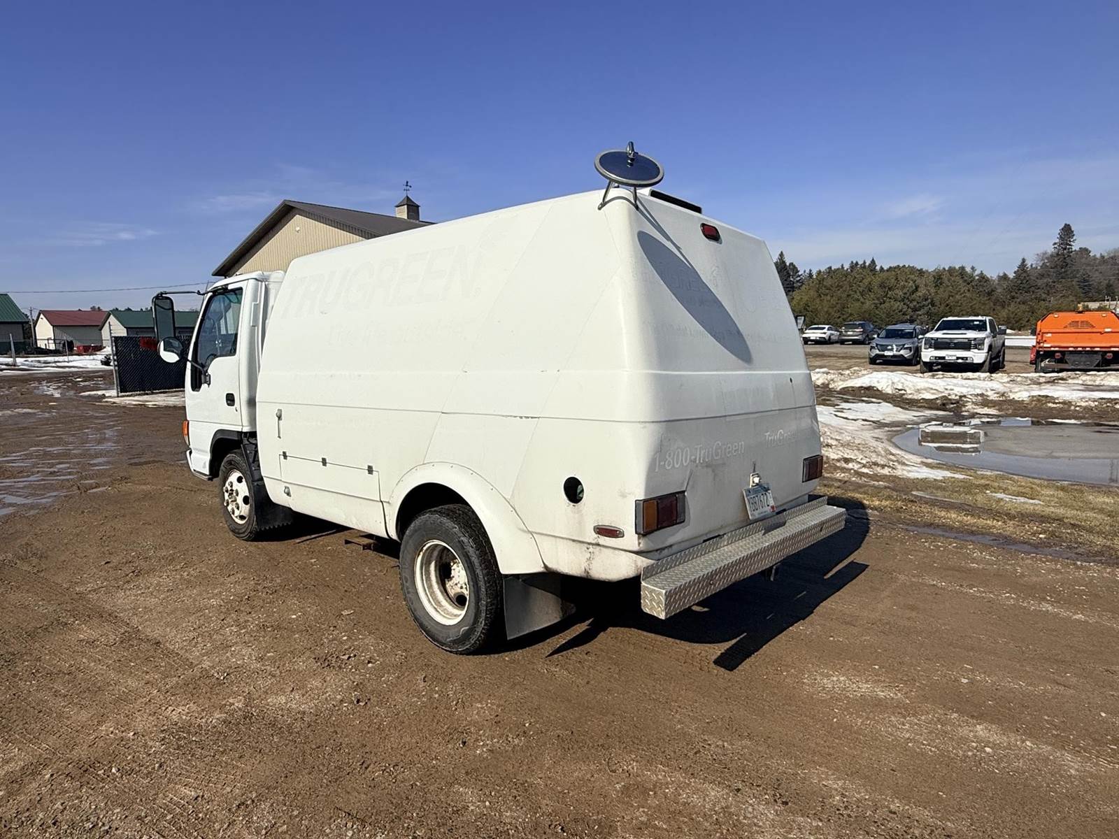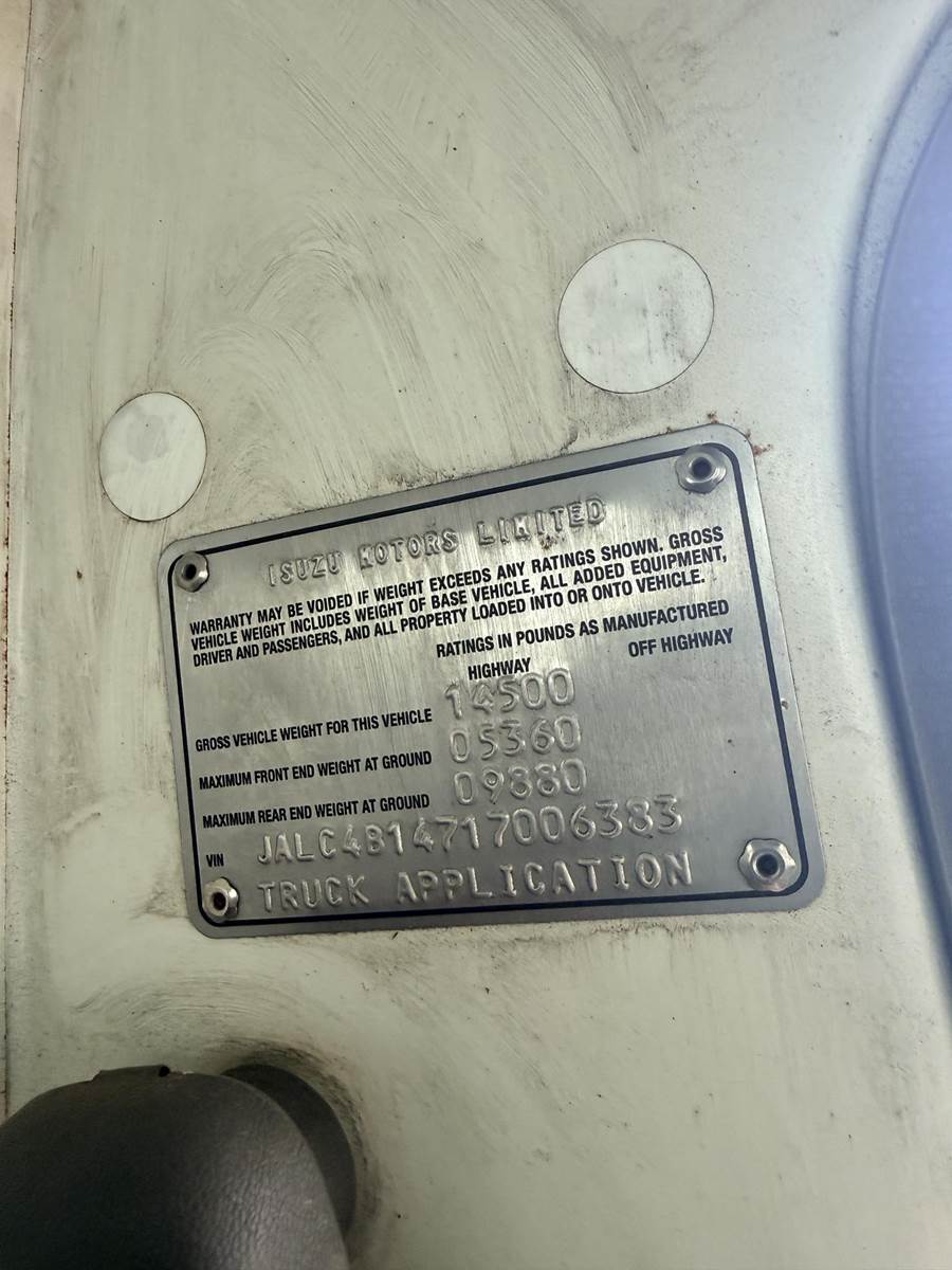 Isuzu Turbo Diesel Engine, Automatic Transmission, Spring Ride, 14500 LB GVWR, Fiber Glass Box, Sprayer Tank, Honda Gas Engine With Fertilizer Pump, Approx 300' Hose Reel, Heat and A/C, Radio, (3) Person Cab, 215/85R16 Tires