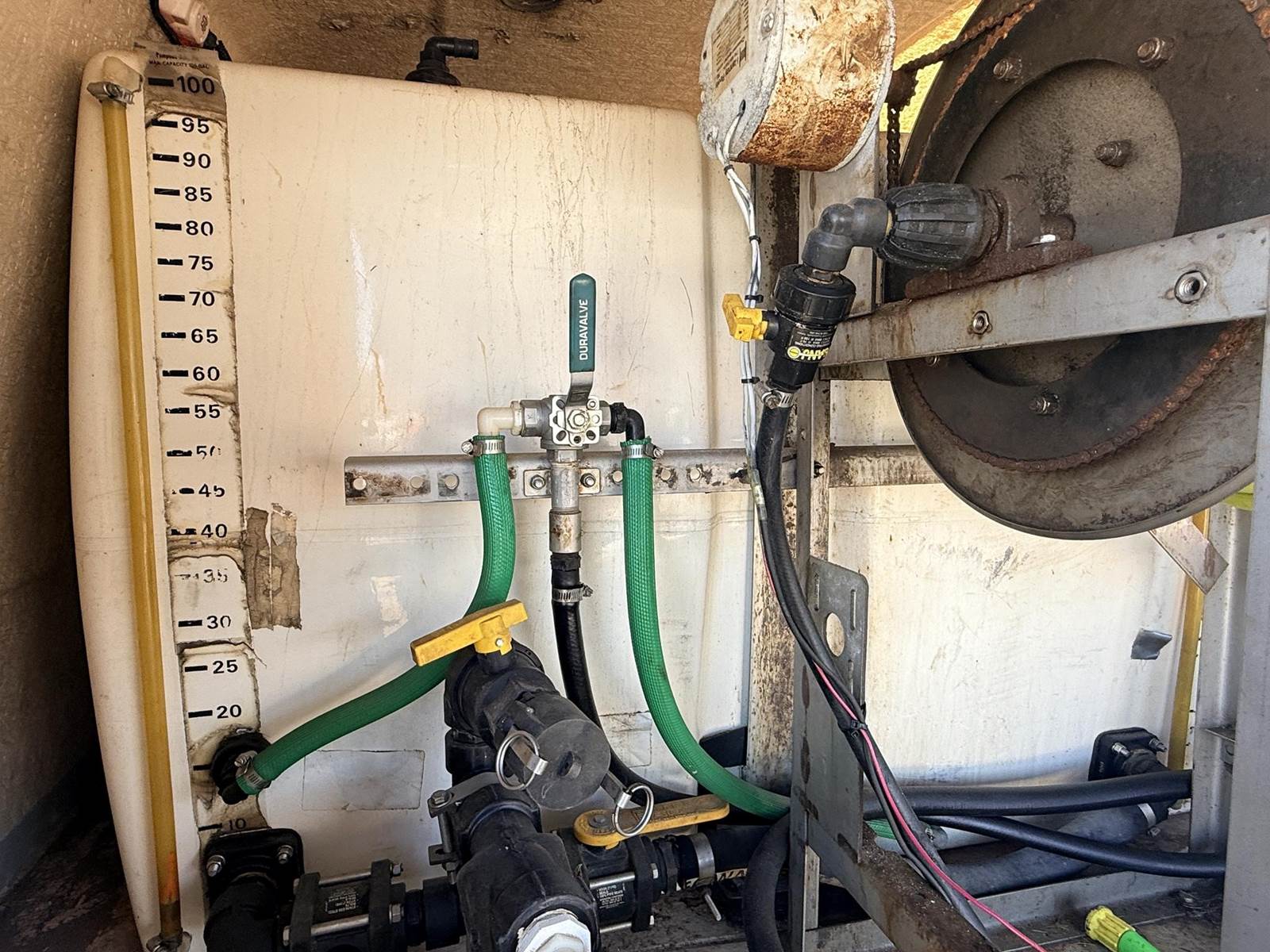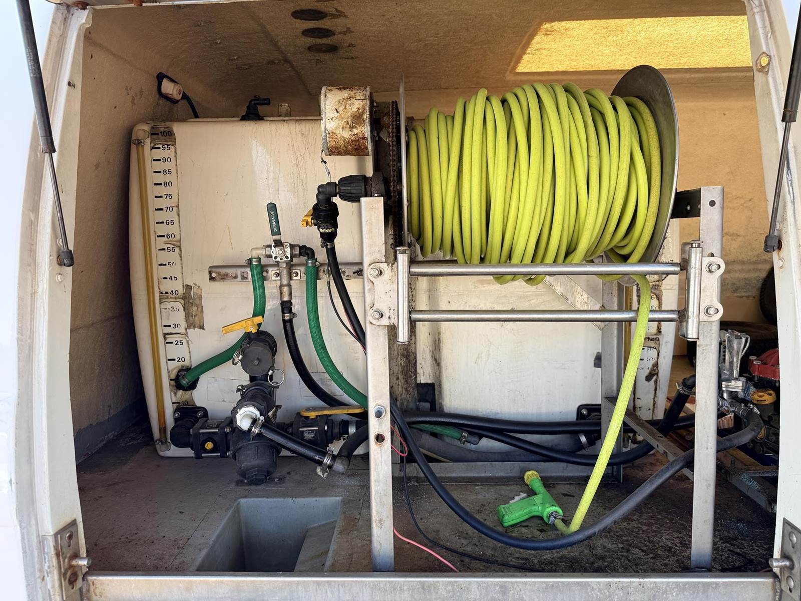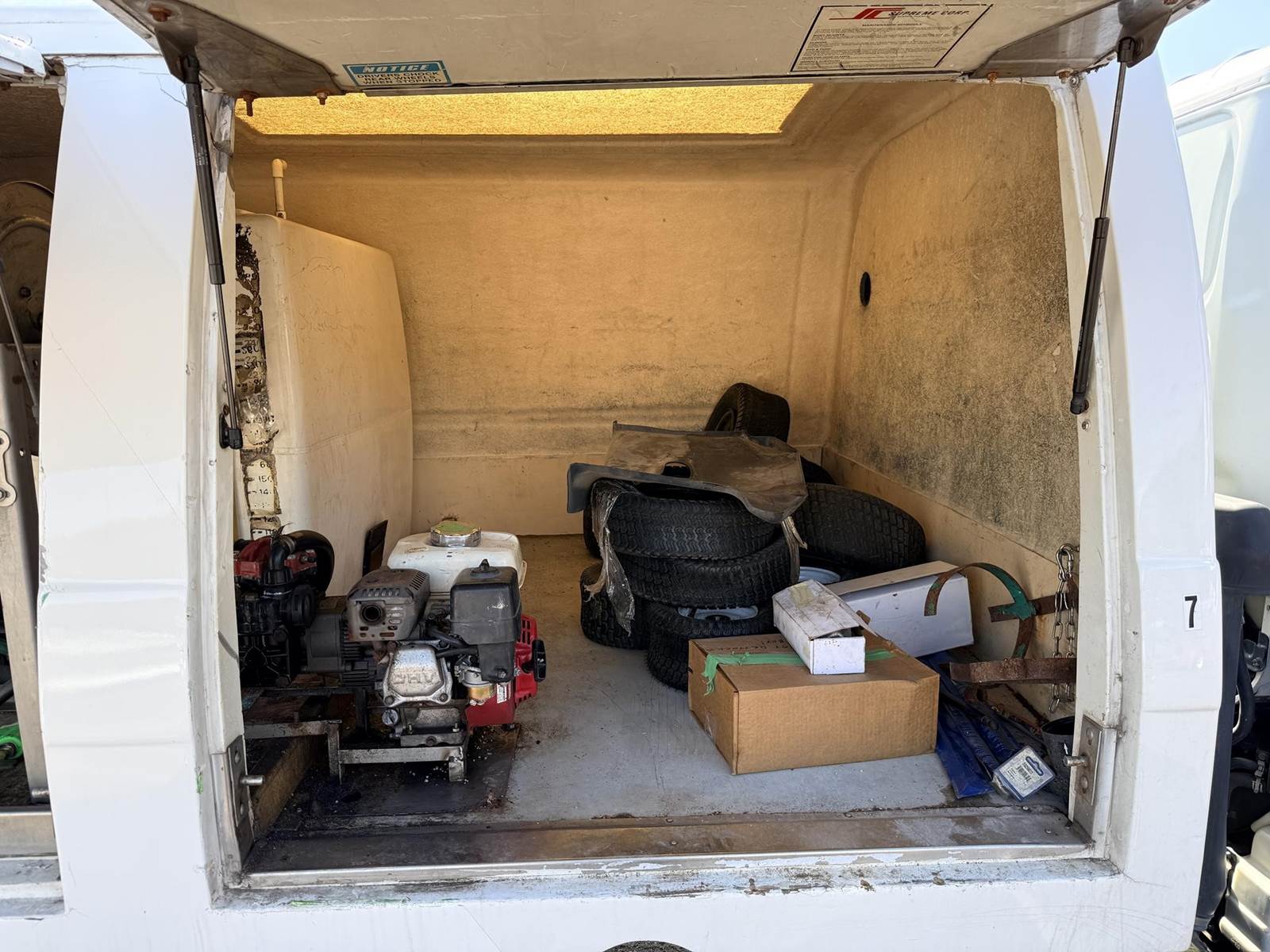 Isuzu Turbo Diesel Engine, Automatic Transmission, Spring Ride, 14500 LB GVWR, Fiber Glass Box, Sprayer Tank, Honda Gas Engine With Fertilizer Pump, Approx 300' Hose Reel, Heat and A/C, Radio, (3) Person Cab, 215/85R16 Tires