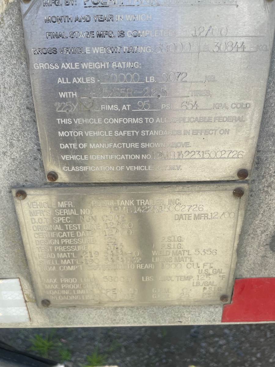 2002 Polar Bulk Tanker- 1,000 Cu FT Capacity, GVWR- 68,000 LBS., 20K Each Axle Capacity, 44'X102". #4000. CALL FOR MORE INFO!!