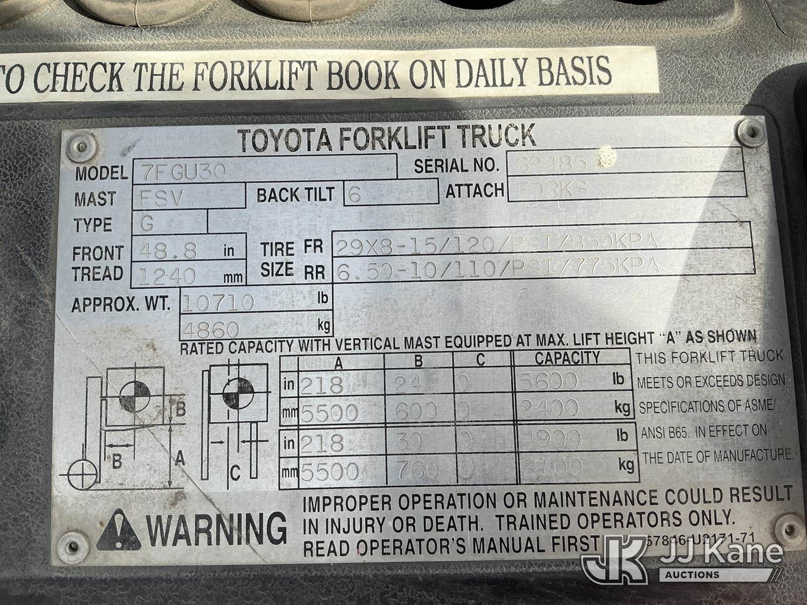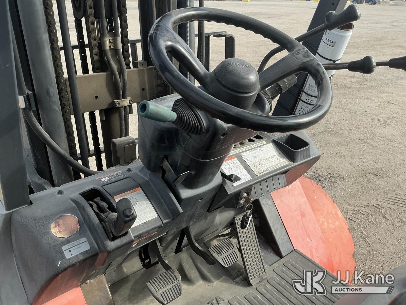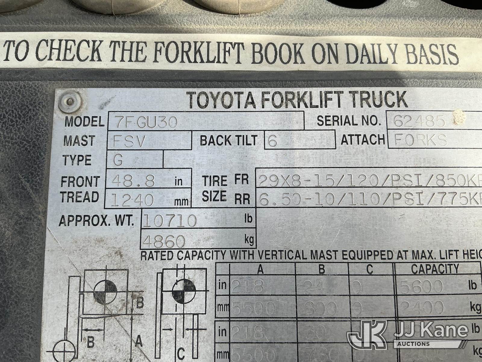 2001 Toyota 7FGU30 Pneumatic Tired Forklift, s/n 62485, 4-cyl, Shuttle, Gas, with 5,600 lbs. max lift capacity, 3-stage, 218 in. mast height, hyd side shift, hyd open & close 53 in. forks & EROPS, Forklift (Runs & Moves, Operates ) (Reads 4,305 hours) NOTE: This unit is being sold AS IS/WHERE IS via Timed Auction and is located in Wichita, KS. For more information and removal arrangements please contact Darrin Springs @ 816-390-3200. Load out by appointment only, Buyer/Hauler must present copy of paid invoice upon arrival. Purchaser acknowledges ALL lots must be removed within 5 business days of Auction. Items not removed in a timely matter will be transported by a third party to a storage facility. Buyer will be responsible for transport and storage fees. For load out and pick information, please reference the hauler sheet sent out after purchase. (Buyer is responsible for removal. Assistance by consignor or JJ Kane Auctioneers is not assured.)