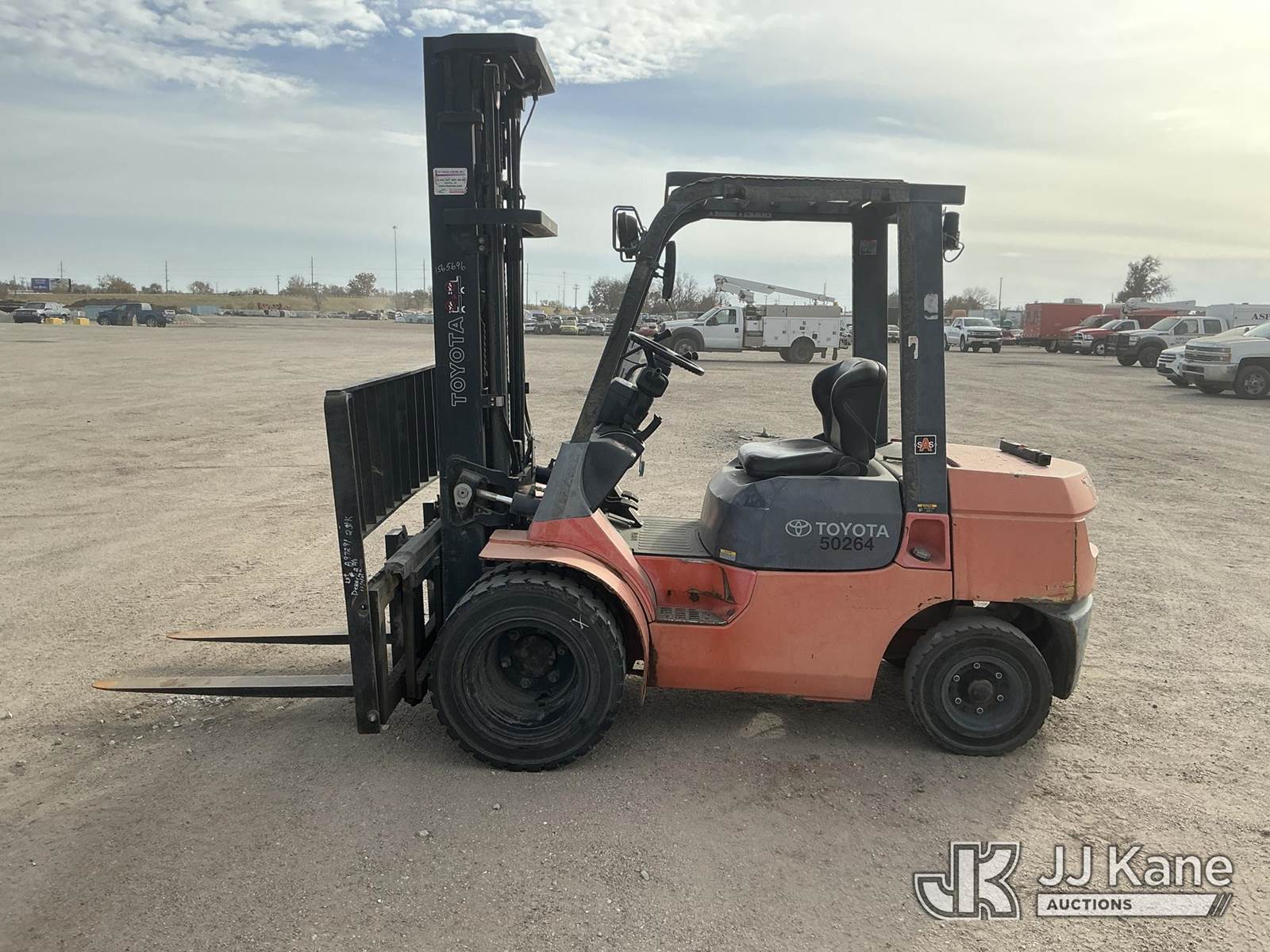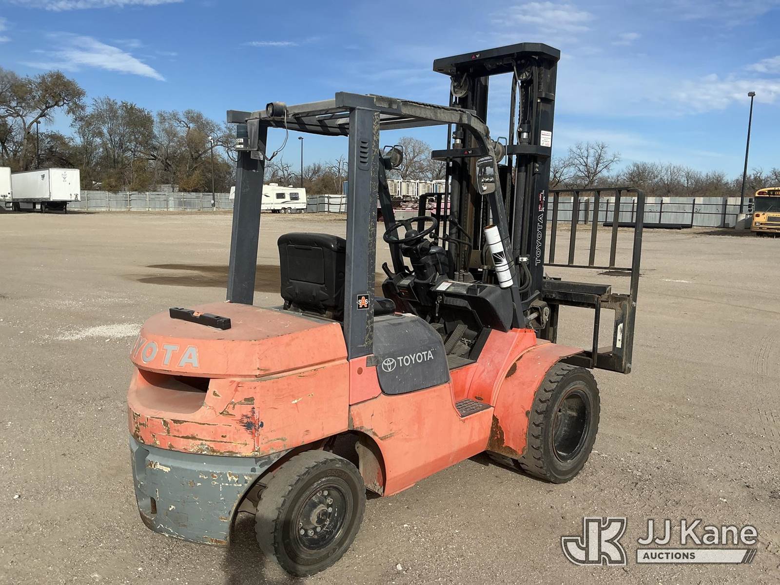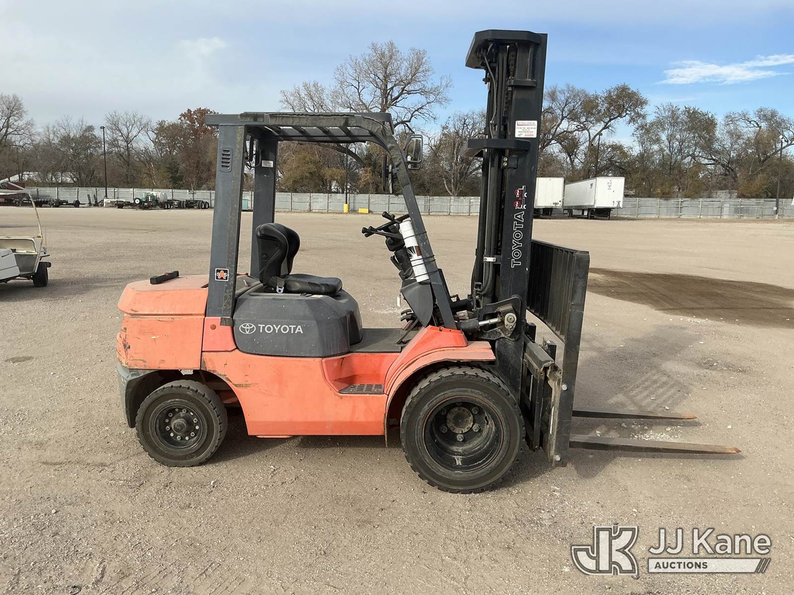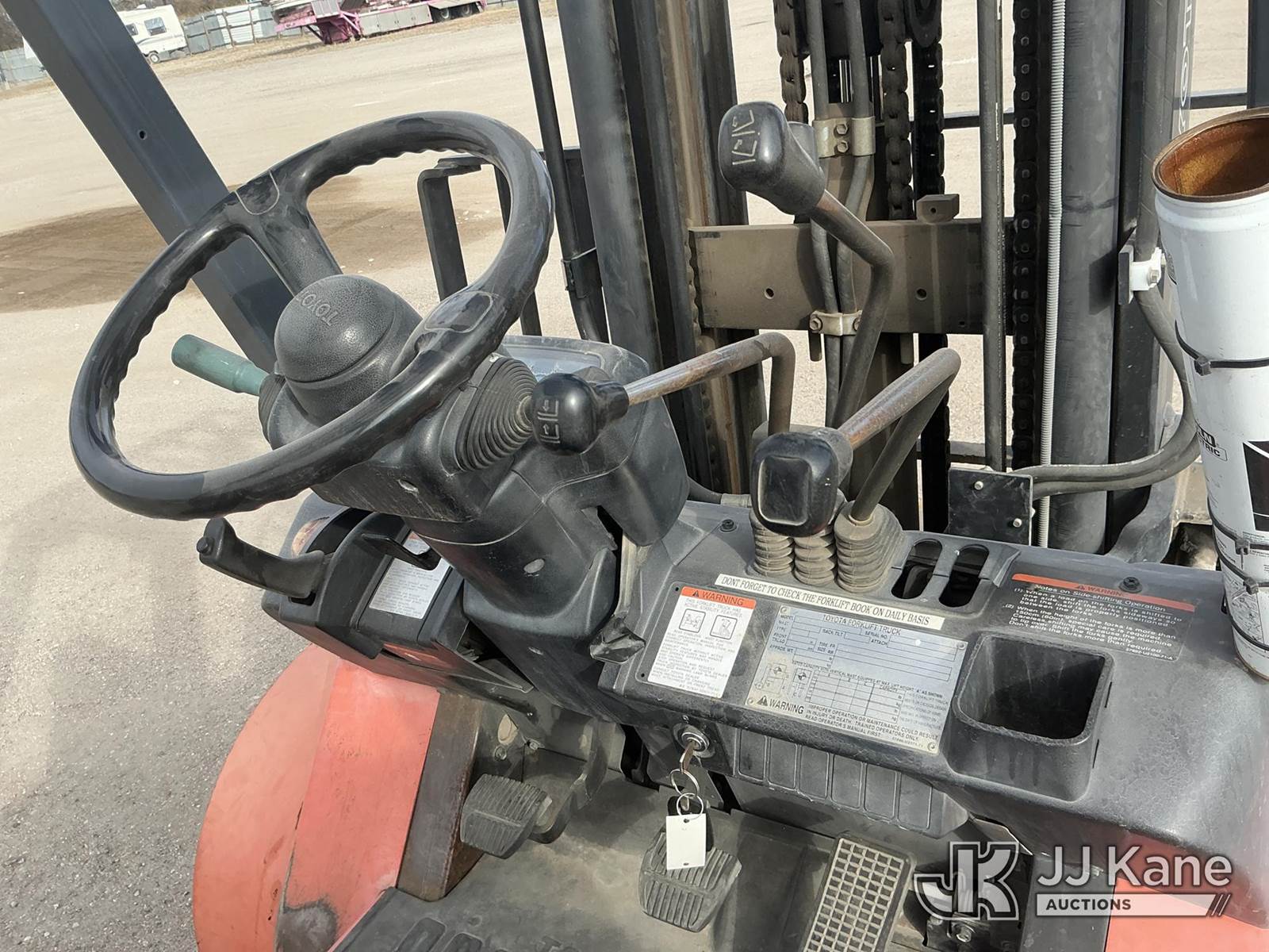 2001 Toyota 7FGU30 Pneumatic Tired Forklift, s/n 62485, 4-cyl, Shuttle, Gas, with 5,600 lbs. max lift capacity, 3-stage, 218 in. mast height, hyd side shift, hyd open & close 53 in. forks & EROPS, Forklift (Runs & Moves, Operates ) (Reads 4,305 hours) NOTE: This unit is being sold AS IS/WHERE IS via Timed Auction and is located in Wichita, KS. For more information and removal arrangements please contact Darrin Springs @ 816-390-3200. Load out by appointment only, Buyer/Hauler must present copy of paid invoice upon arrival. Purchaser acknowledges ALL lots must be removed within 5 business days of Auction. Items not removed in a timely matter will be transported by a third party to a storage facility. Buyer will be responsible for transport and storage fees. For load out and pick information, please reference the hauler sheet sent out after purchase. (Buyer is responsible for removal. Assistance by consignor or JJ Kane Auctioneers is not assured.)