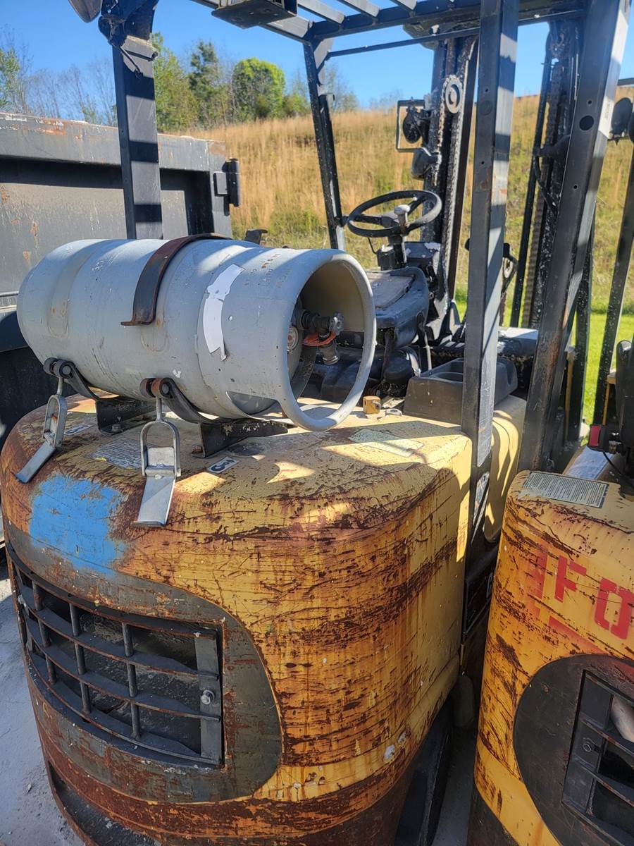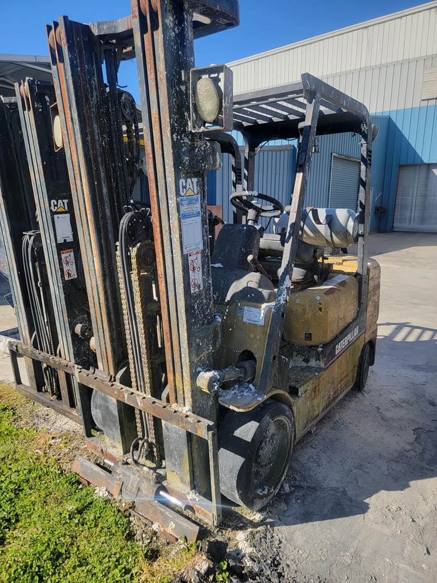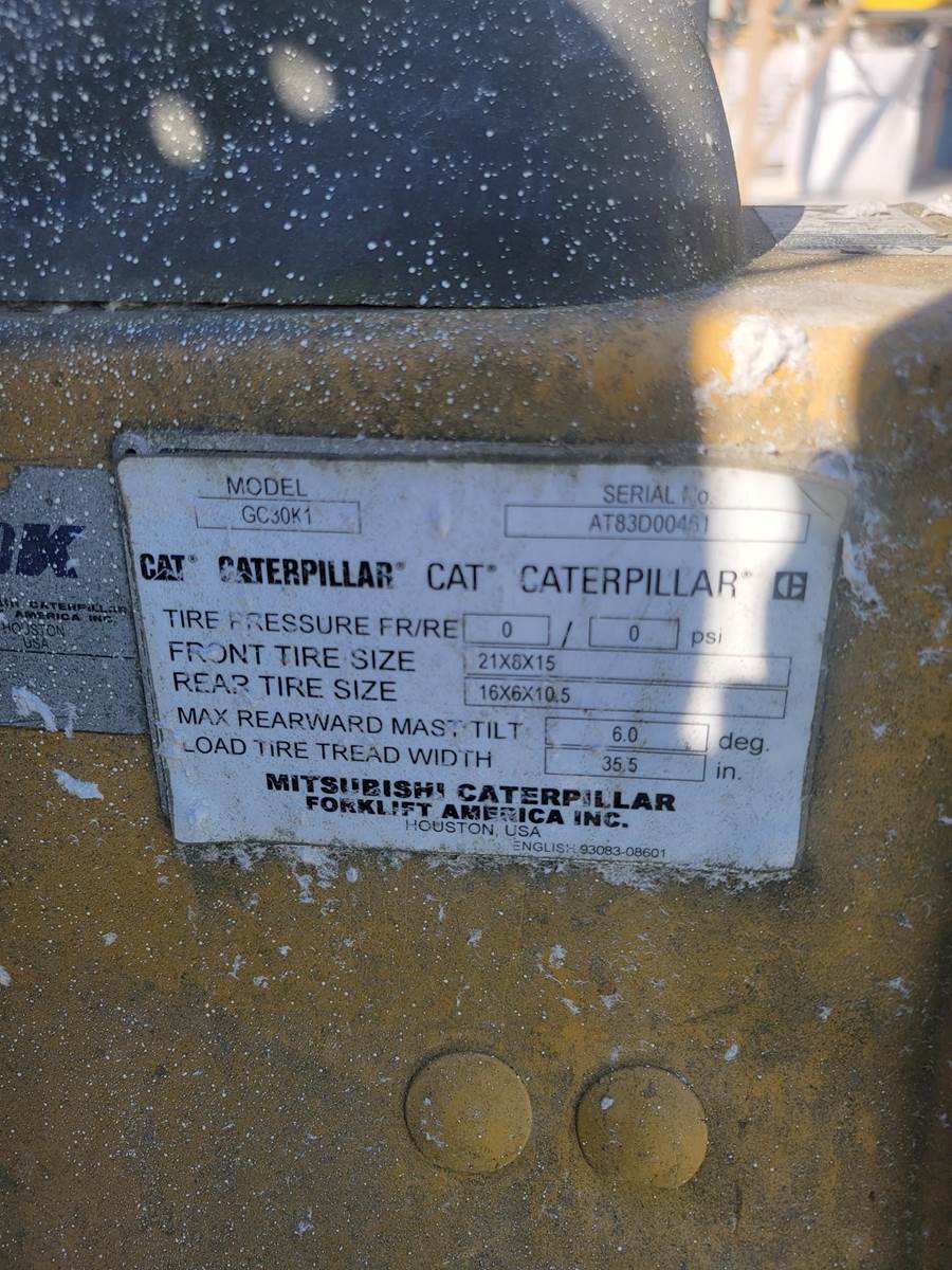 2002 Caterpillar GC30K1, serial #AT83D00451, 83/189" three stage mast, no attachment, 3-way to carriage, 6000lb capacity, cushion tires, propane fuel, no forks, ran when parked. SDC
