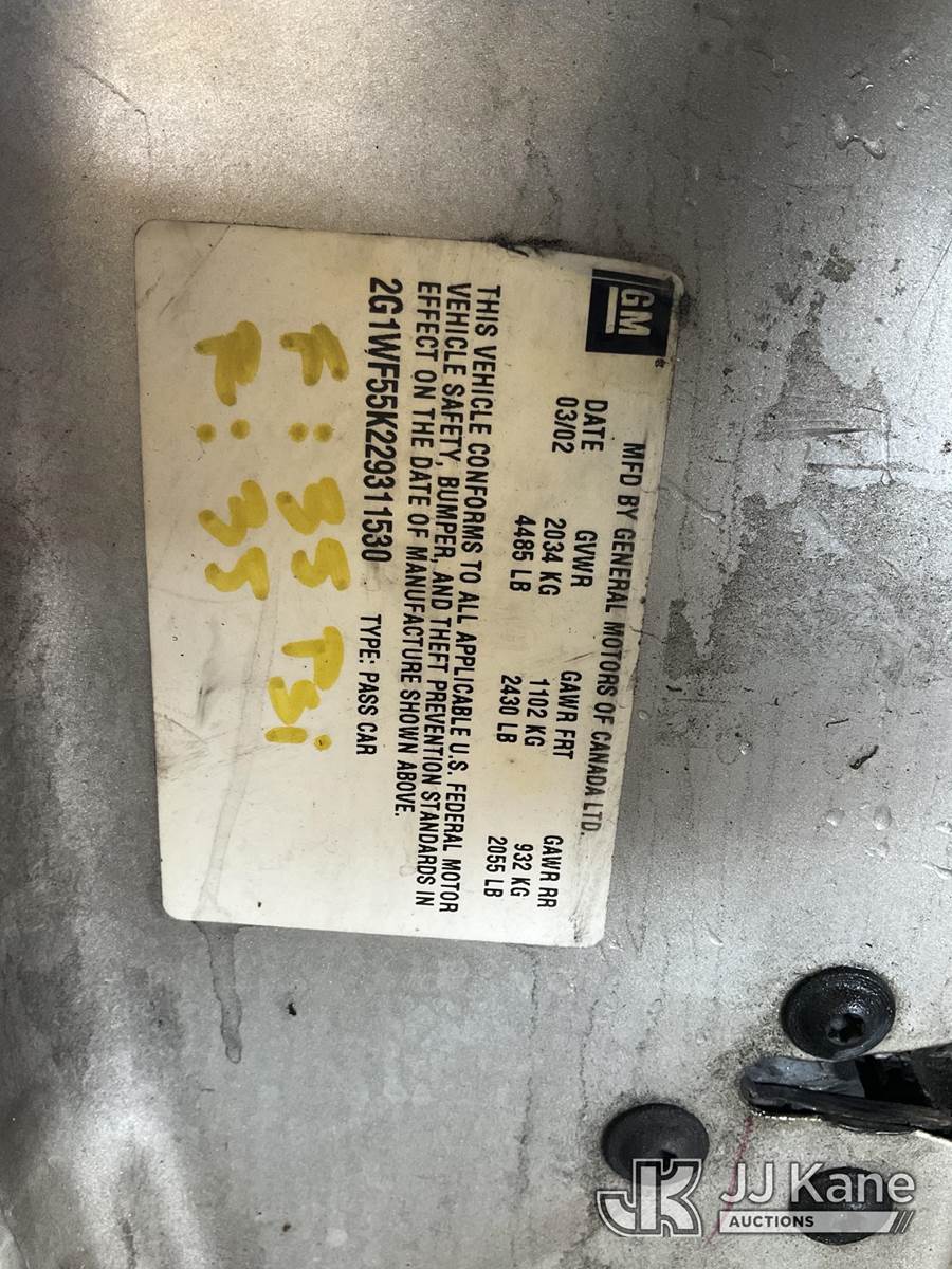 2002 Chevrolet Impala 4-Door Sedan, 6-cyl gas, 4-Speed Automatic, A/C, (Exempt from Odometer Disclosure - Reads 56,655 miles) (Runs & Moves)(Need To Replace Evap & Fuel Pressure Regulator Vacuum Hose, Vehicle previously used with a 'cold plate' or protected record registration. Due to the prior status, VIN may not appear in NMVTIS, which could affect DMV title/registration processing. Buyer acknowledges and accepts this) (Bidding Restricted to Licensed Vehicle Dealers Only), This is a Titled Item NOTE: This unit is being sold AS IS/WHERE IS via Timed Auction and is located in Jurupa Valley, CA. Inspection & preview days for this unit are the 2 business days prior to the first day of items closing for this auction, item is located at 4510 Muth Way Jurupa Valley, CA 92509 and hours of operations are 8a-4p. For pre-sale questions, please contact please contact Office Staff @ (310) 353-7140. Dealer License Number 45696. (Buyer is responsible for removal. Assistance by consignor or JJ Kane Auctions is not assured.)