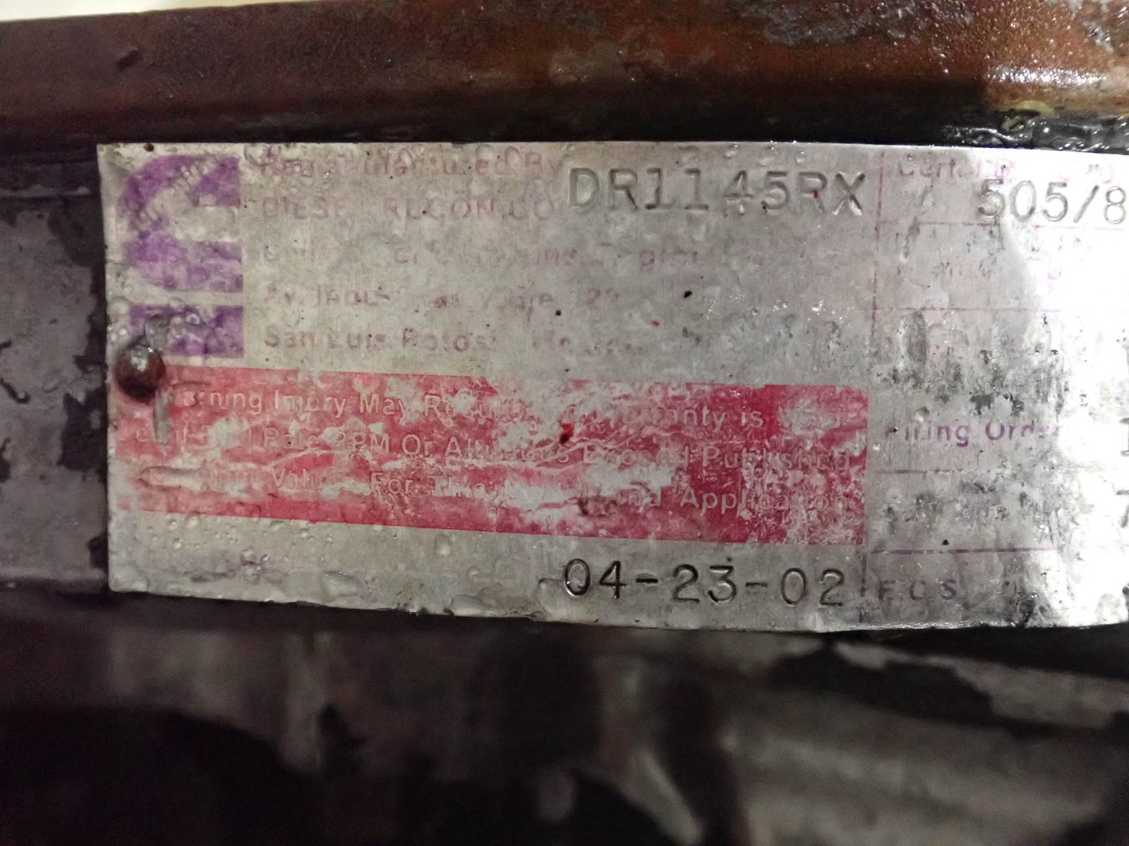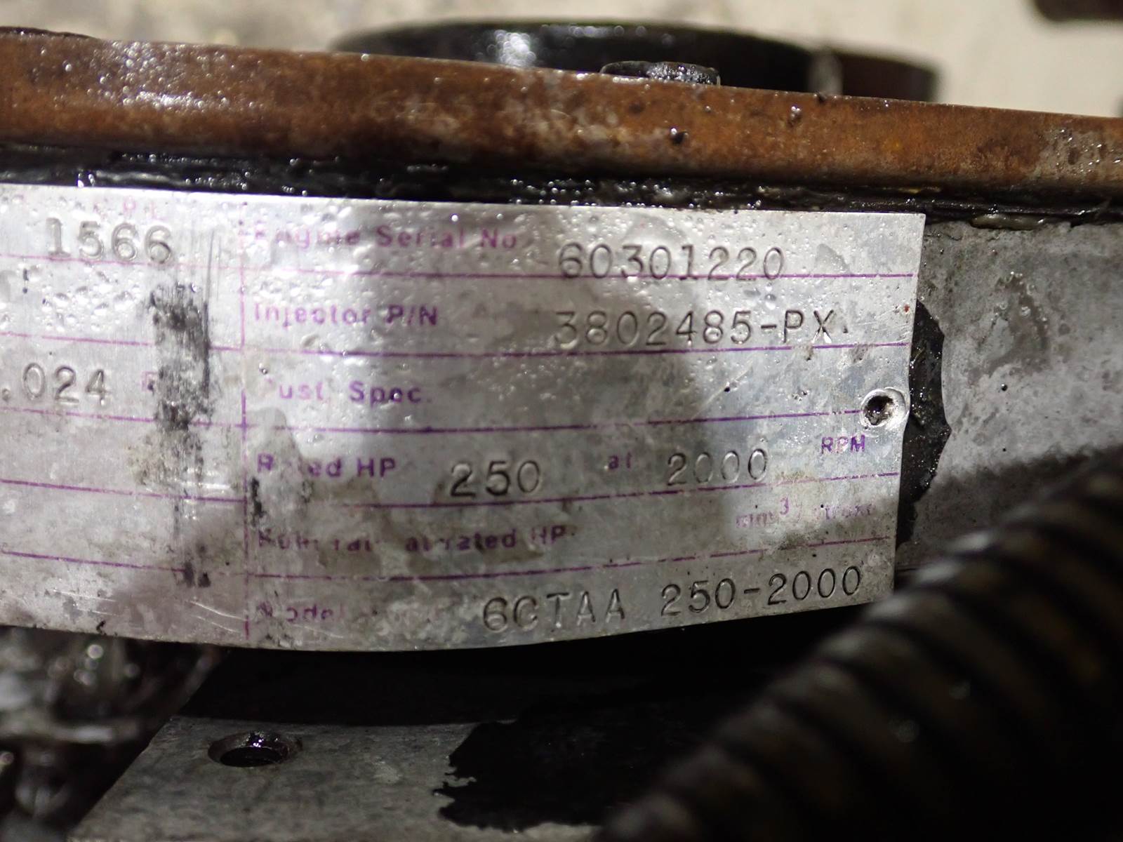2002 Cummins 6CTAA 250 diesel engine, 6CTA 8.3 liter, 250 HP, air to air intercooled, Ford truck applications, CPL 1566, mechanical fuel system. STRONG RUNNER, SEE VIDEO. 90 PSI OIL PRESSURE AT COLD IDLE AND 100+ PSI AT MID THROTTLE -- NO SMOKE OR BLOWBY OBSERVED DURING COLD TEST RUN, NICE ENGINE.