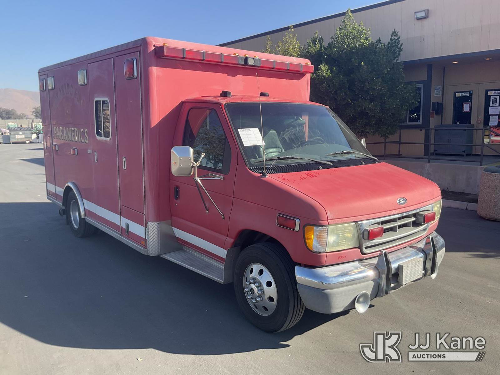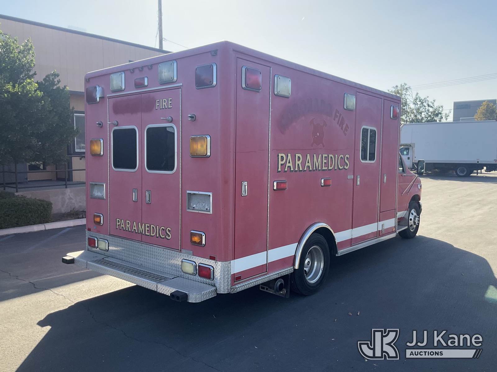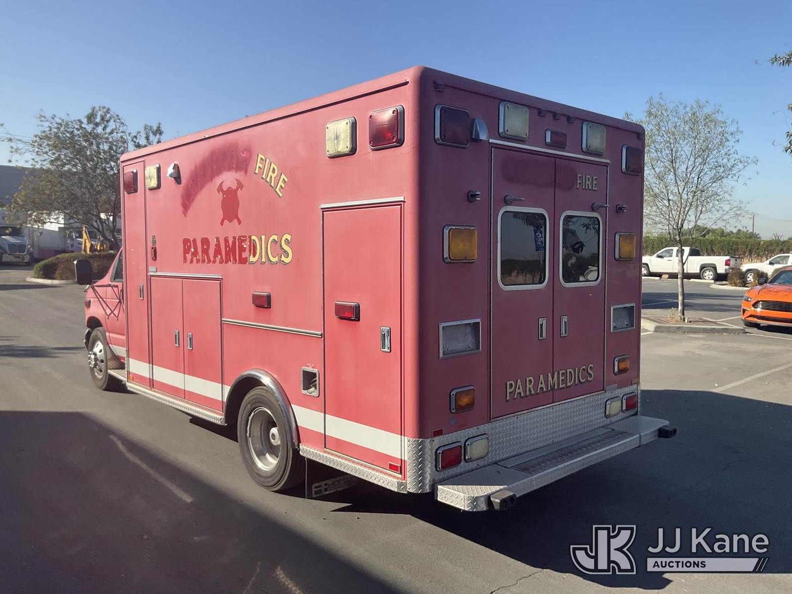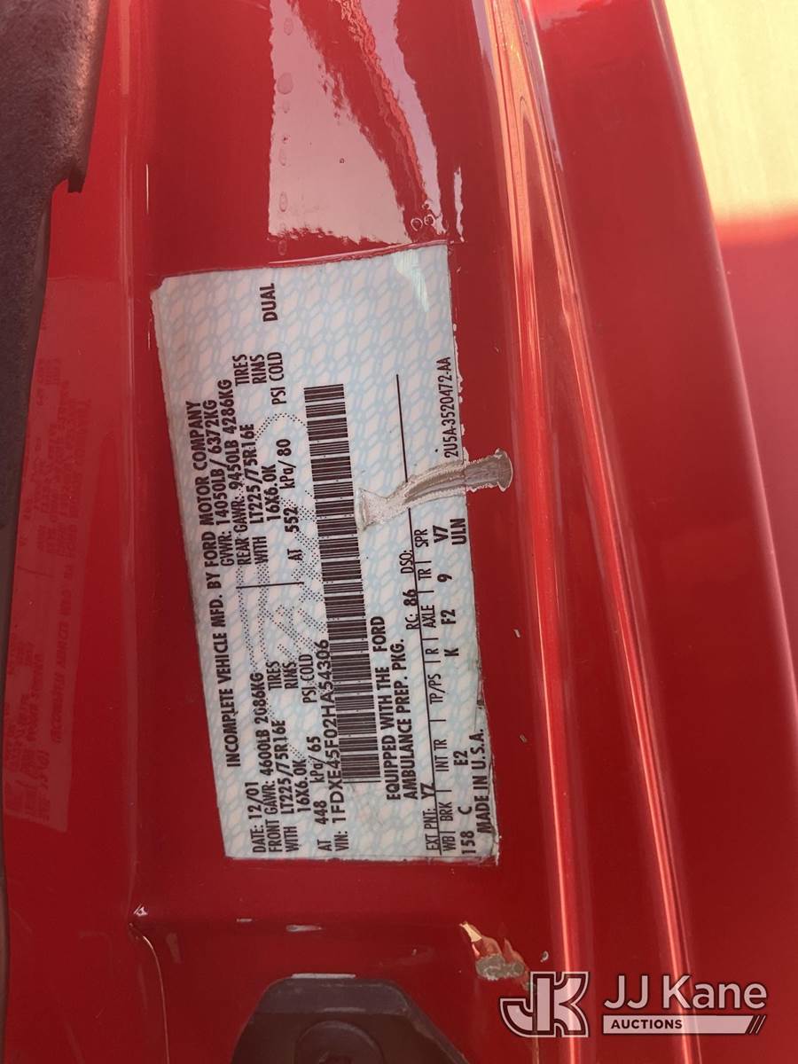 2002 Ford E450 Ambulance/Rescue Vehicle, 7.3L Auto, diesel, A/C, (Exempt from Odometer Disclosure - Reads 141,554 miles) (Runs & Moves) (Interior Stripped of Parts) This is a Titled Item NOTE: This unit is being sold AS IS/WHERE IS via Timed Auction and is located in Jurupa Valley, CA. Inspection & preview days for this unit are the 2 business days prior to the first day of items closing for this auction, item is located at 4510 Muth Way Jurupa Valley, CA 92509 and hours of operations are 8a-4p. For pre-sale questions, please contact please contact Office Staff @ (310) 353-7140. Dealer License Number 45696. (Buyer is responsible for removal. Assistance by consignor or JJ Kane Auctioneers is not assured.)