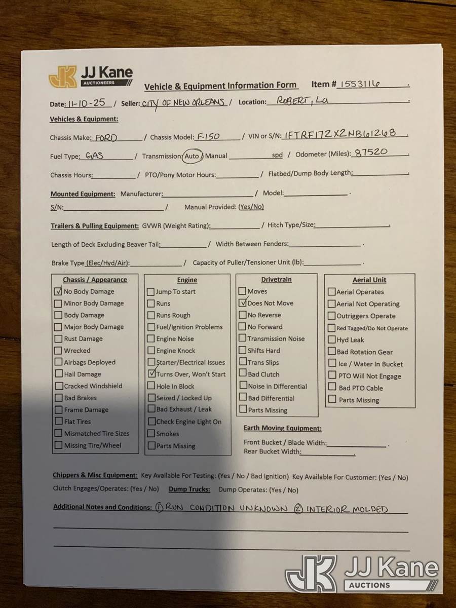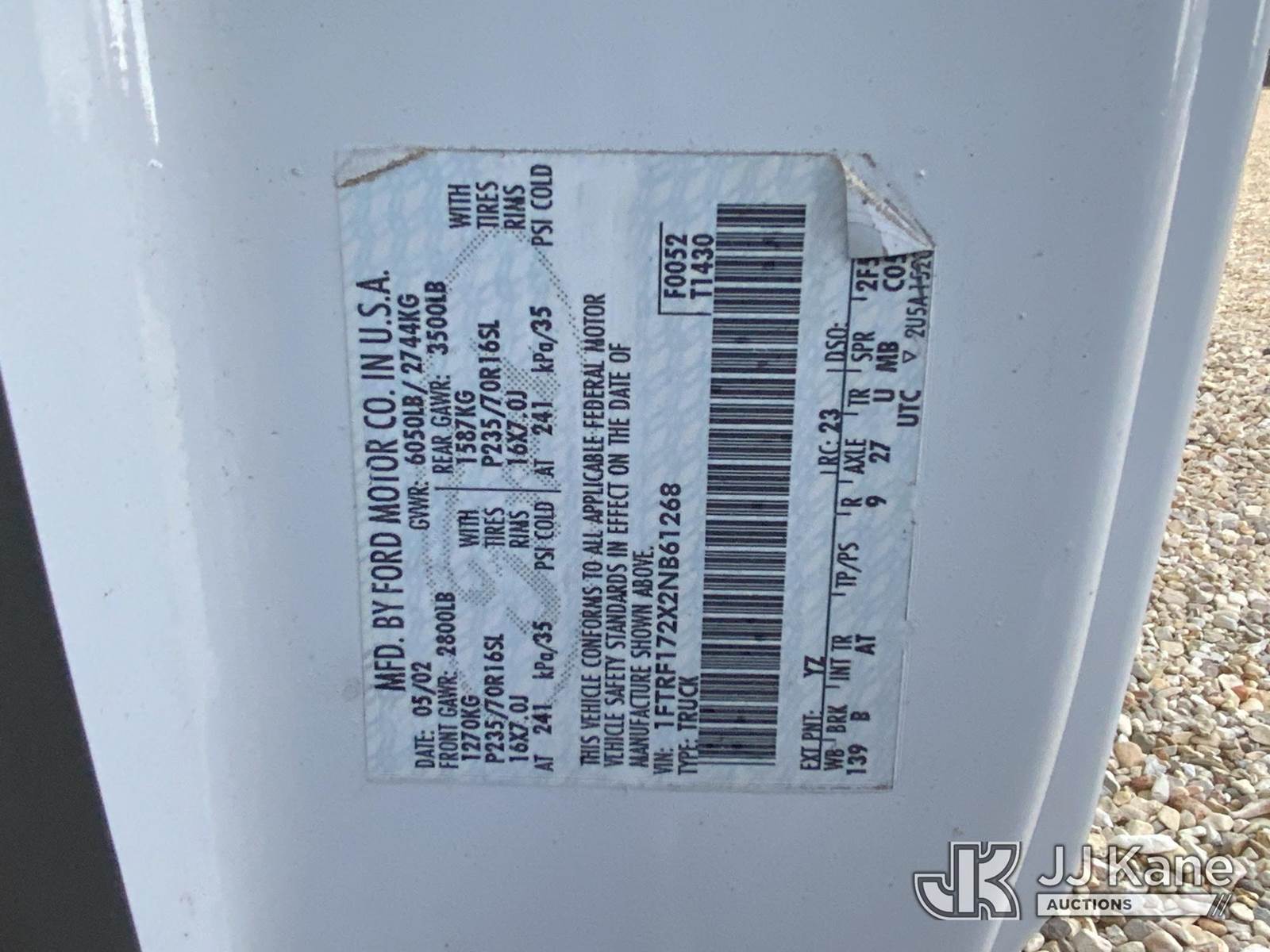 2002 Ford F-150 Pickup Truck, 6-cyl gas, Auto, RWD, A/C, (Exempt from Odometer Disclosure - Reads 87,520 miles) (Not Running, Condition Unknown, Cranks, Service Engine Soon Light On, Moldy Interior) This is a Titled Item NOTE: This unit is being sold AS IS/WHERE IS via Timed Auction and is located in Robert, LA. Inspection & preview days for this unit are by appointment only; please contact us at contact@jjkane.com or 84-Go-JJKane for more details. License # LA AB-154 (Buyer is responsible for removal. Assistance by consignor or JJ Kane Auctions is not assured.)